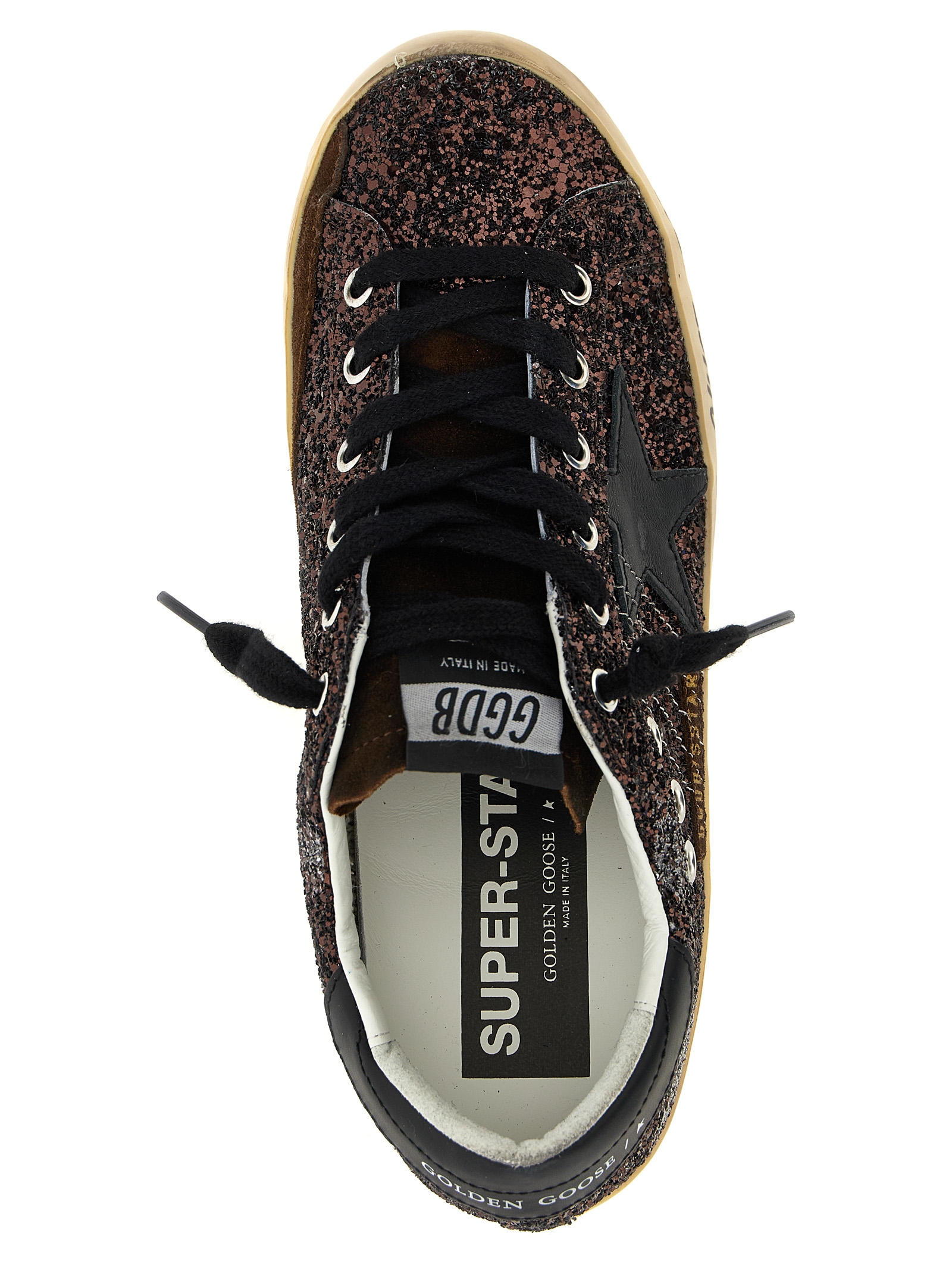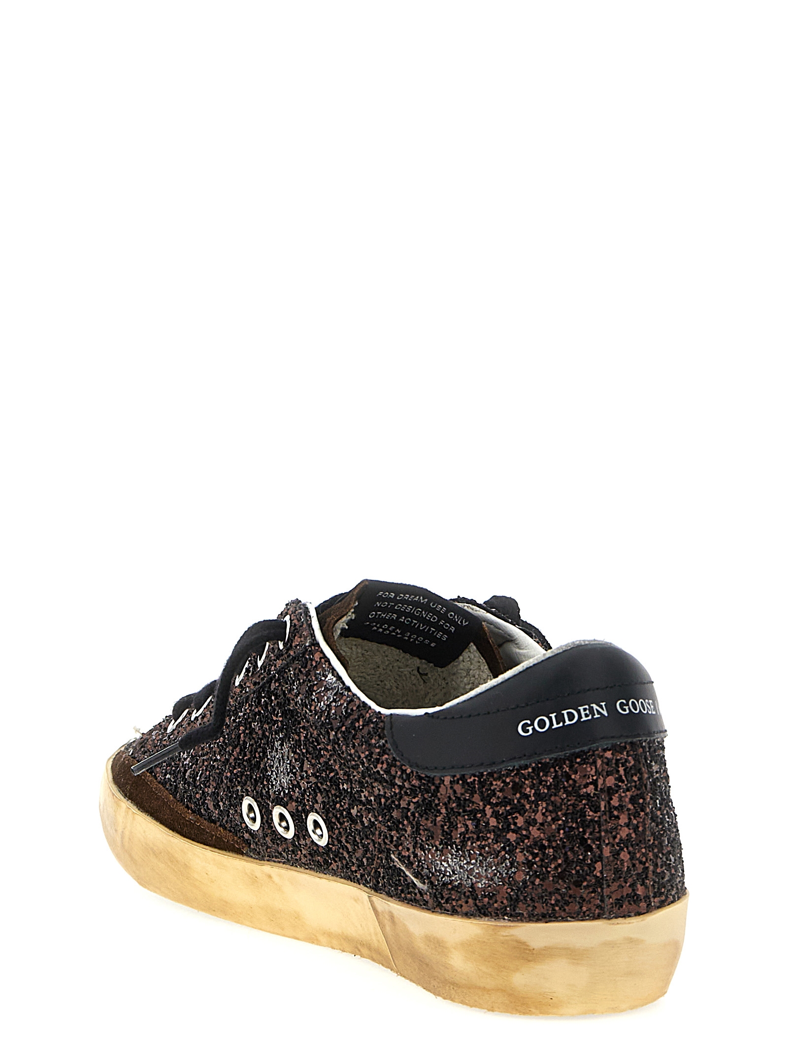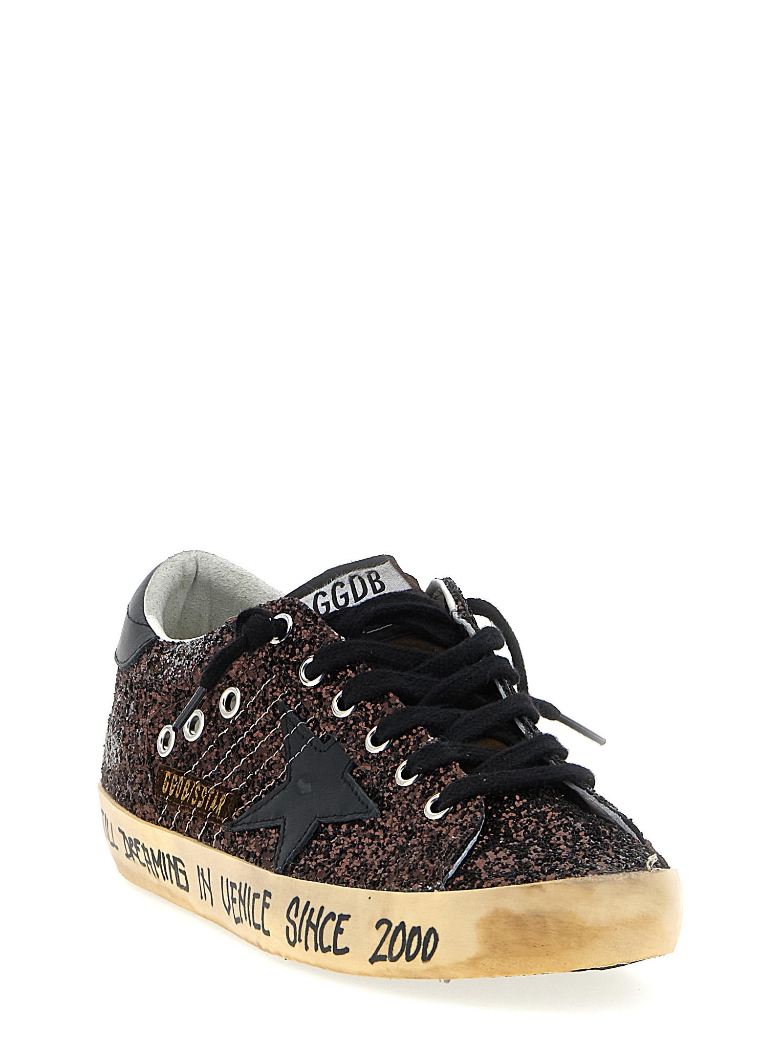 ‘Superstar’ sneakers in glitter, leather star and heel, lace-up closure, rubber sole with graffiti.