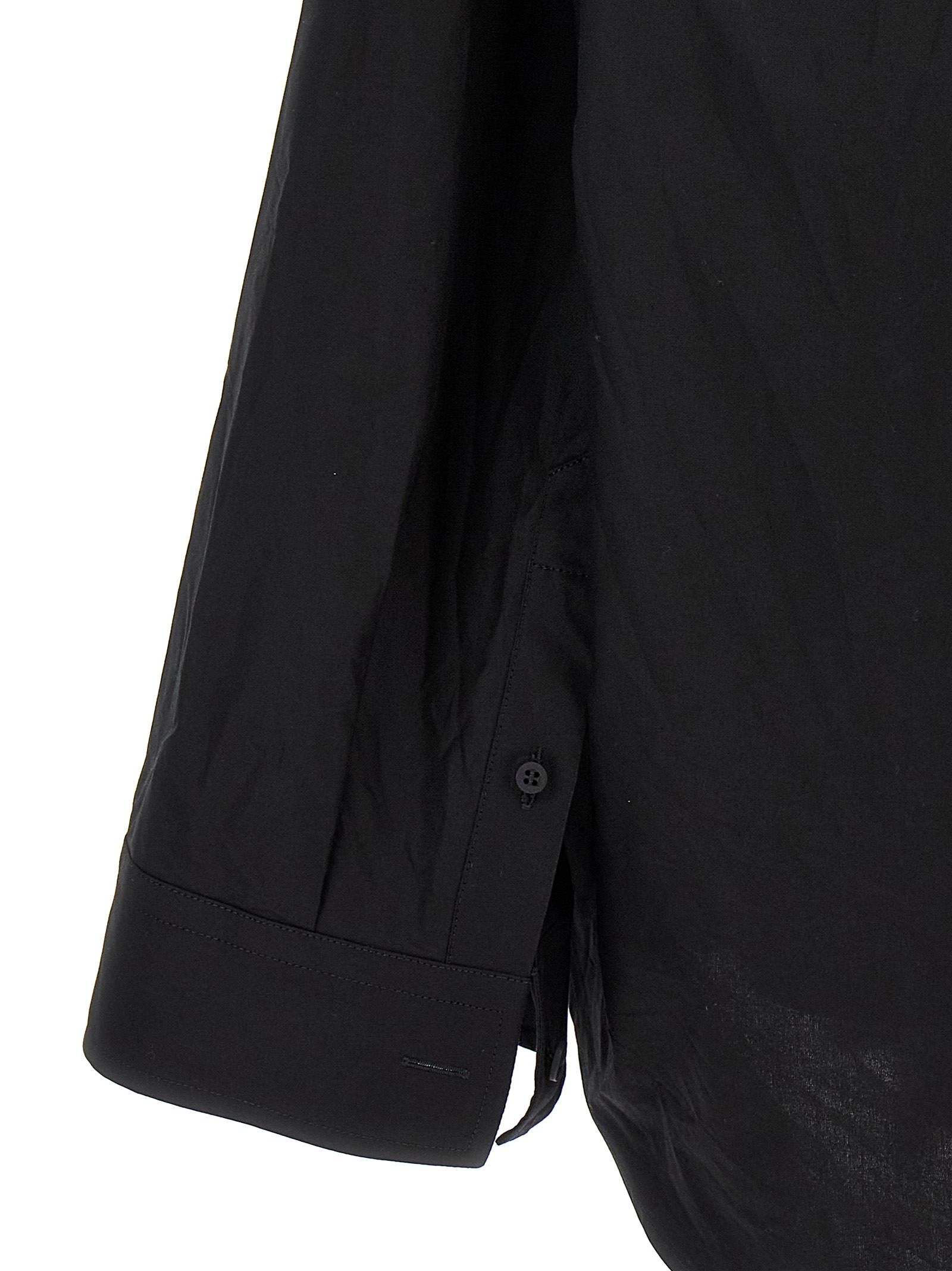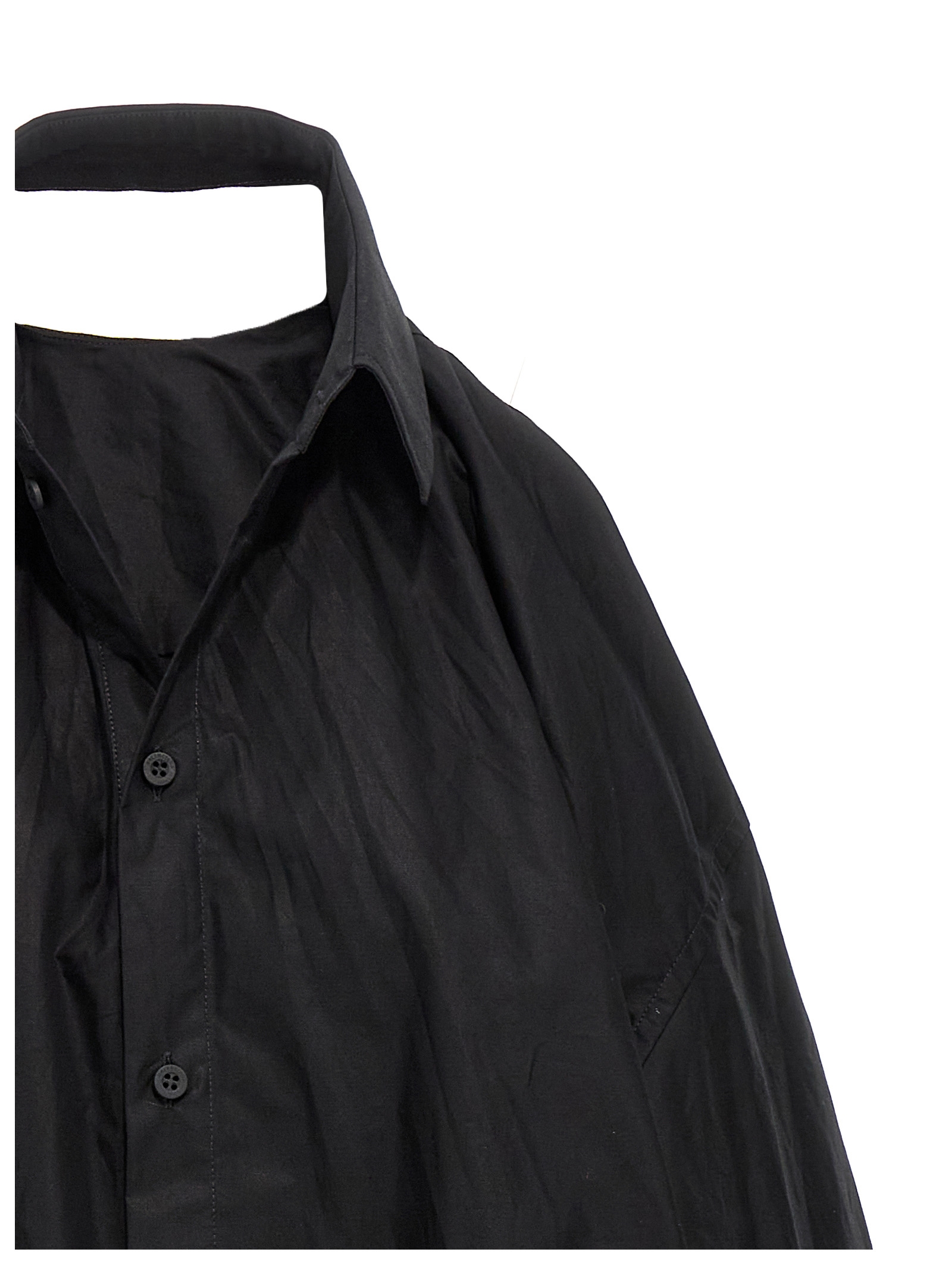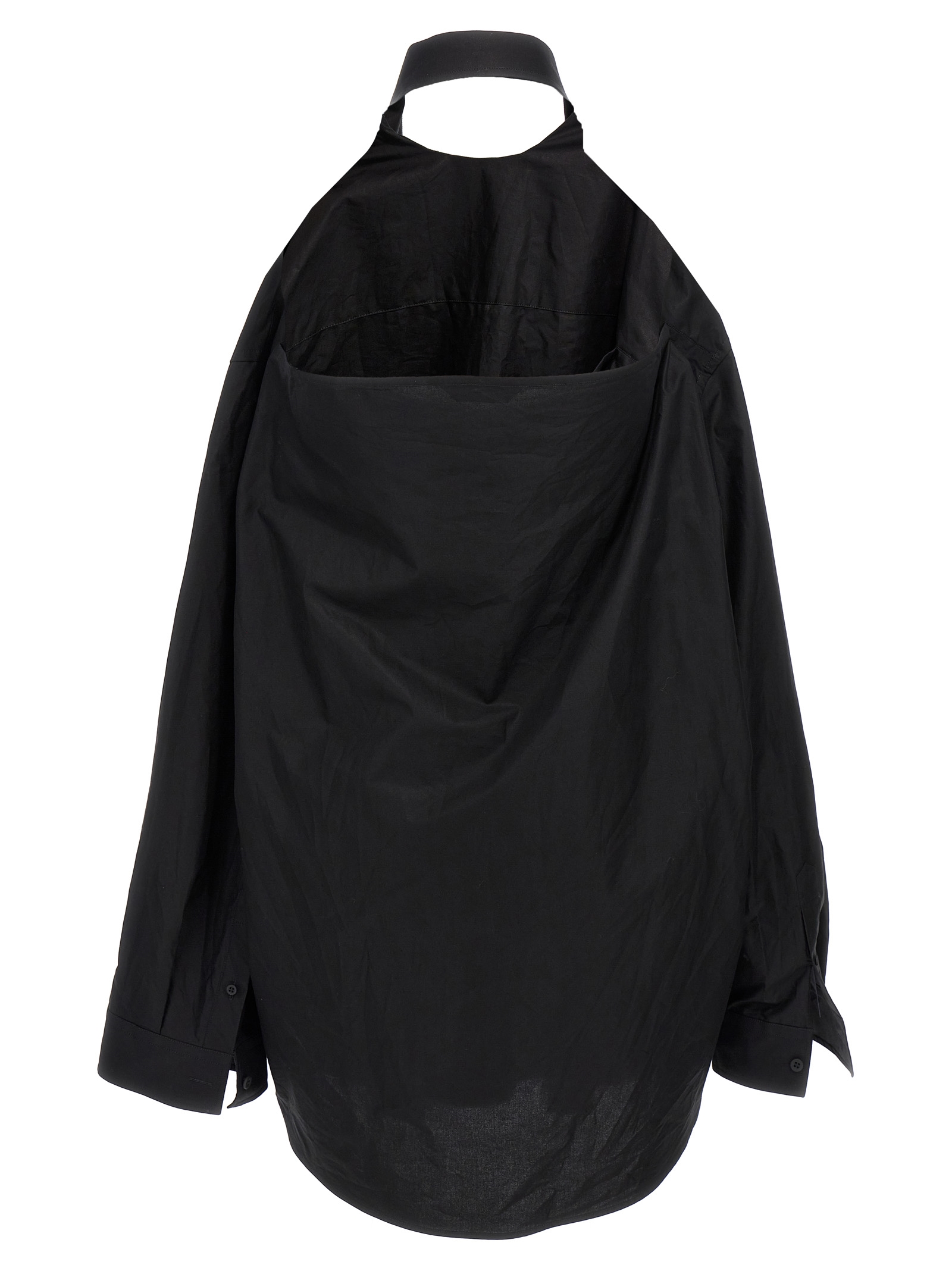 ‘Suspended’ dress in cotton poplin, trompe l’oeil shirt-effect construction, front buttons and collar, bare back. It can also be worn with long sleeves.
