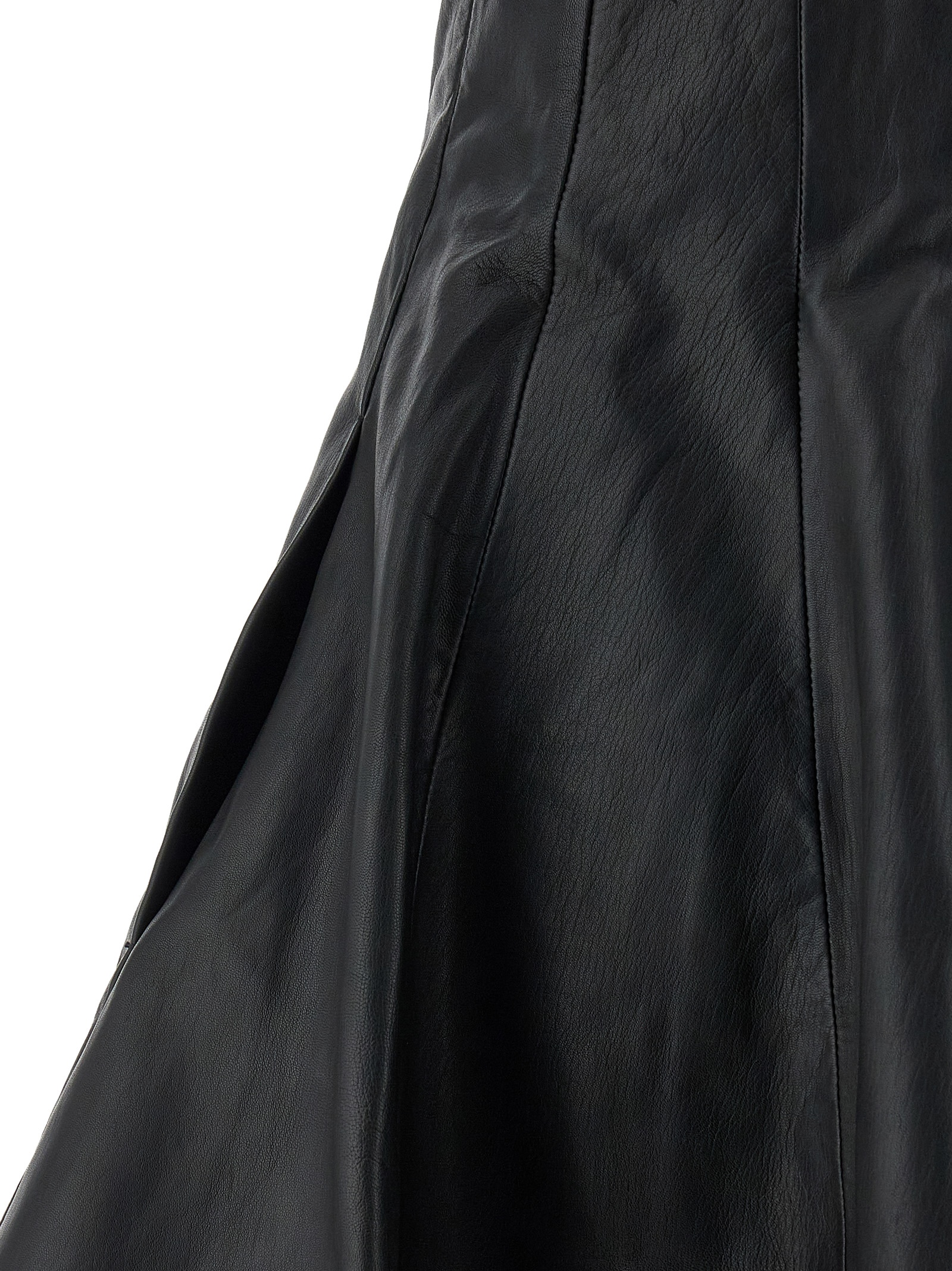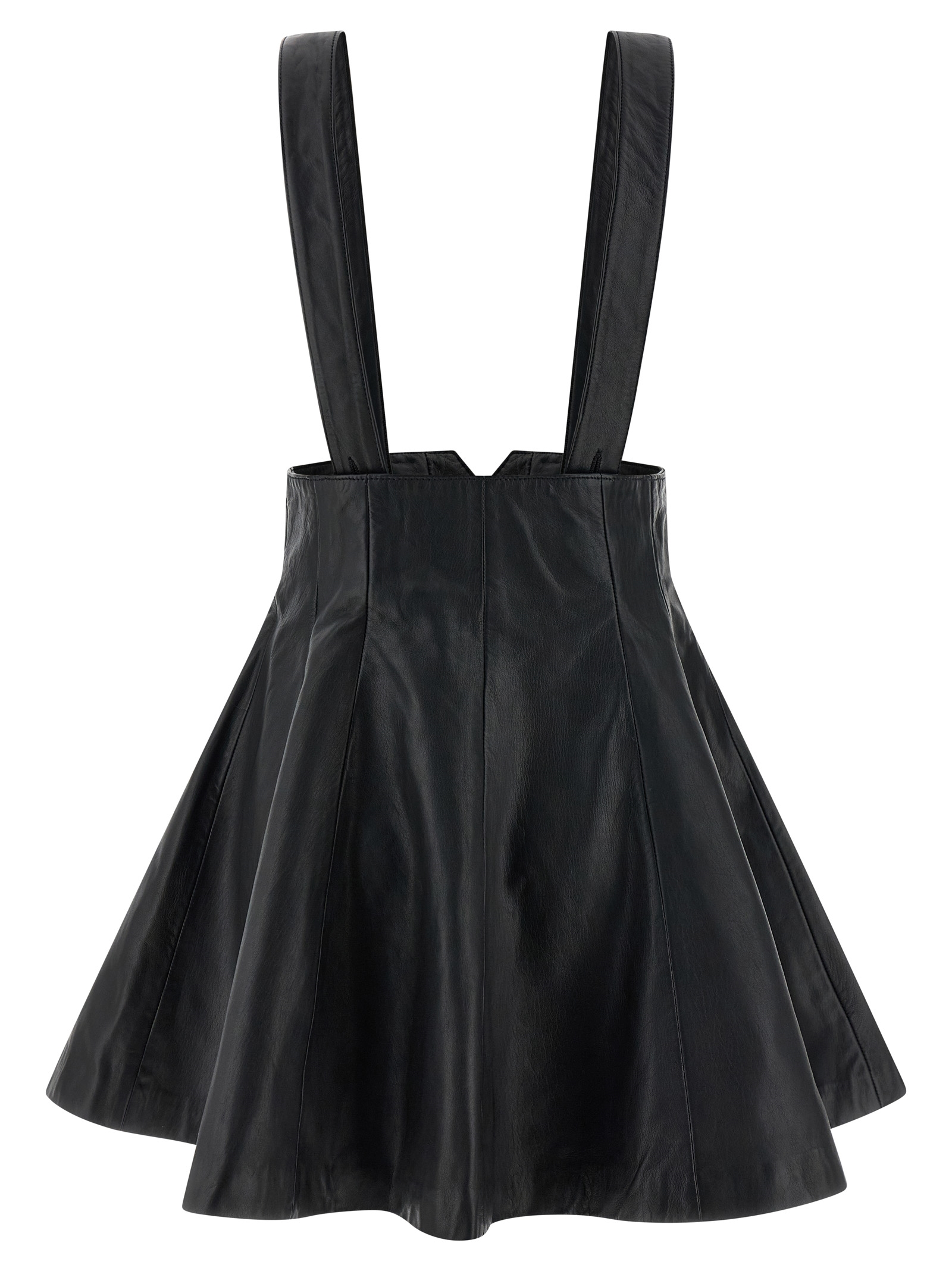 Leather skirt with tight waist, flared silhouette, front button closure, removable braces, lining.