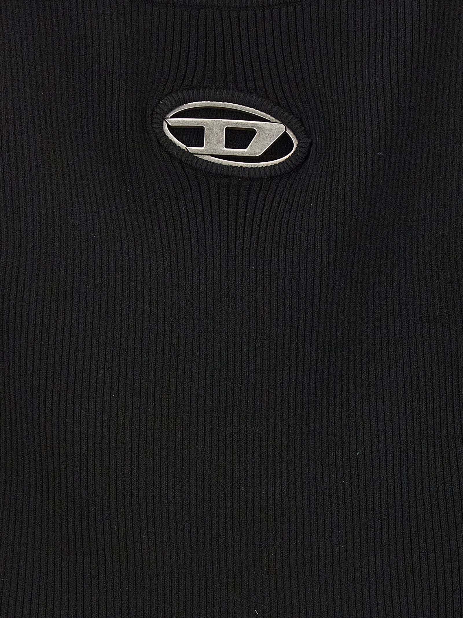 ‘M-Vera-Ls’ jersey in stretch ribbed fabric, front metal logo plaque with cut out detail, crop pattern, boat neckline, long sleeve.