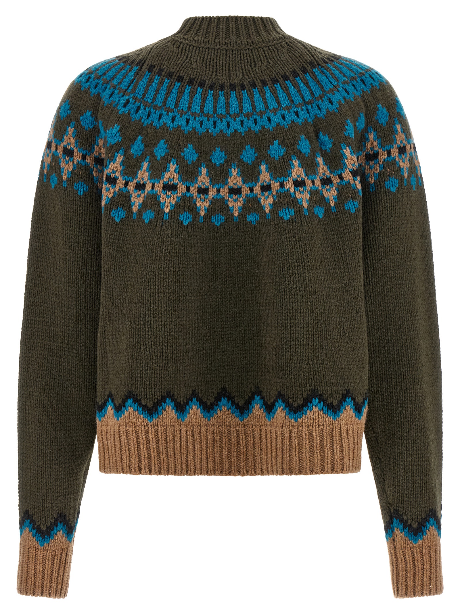 ‘Sweet Winter’ virgin wool jacquard sweater with ‘Fair Isle’ pattern, crew neck, long cuffed sleeves.