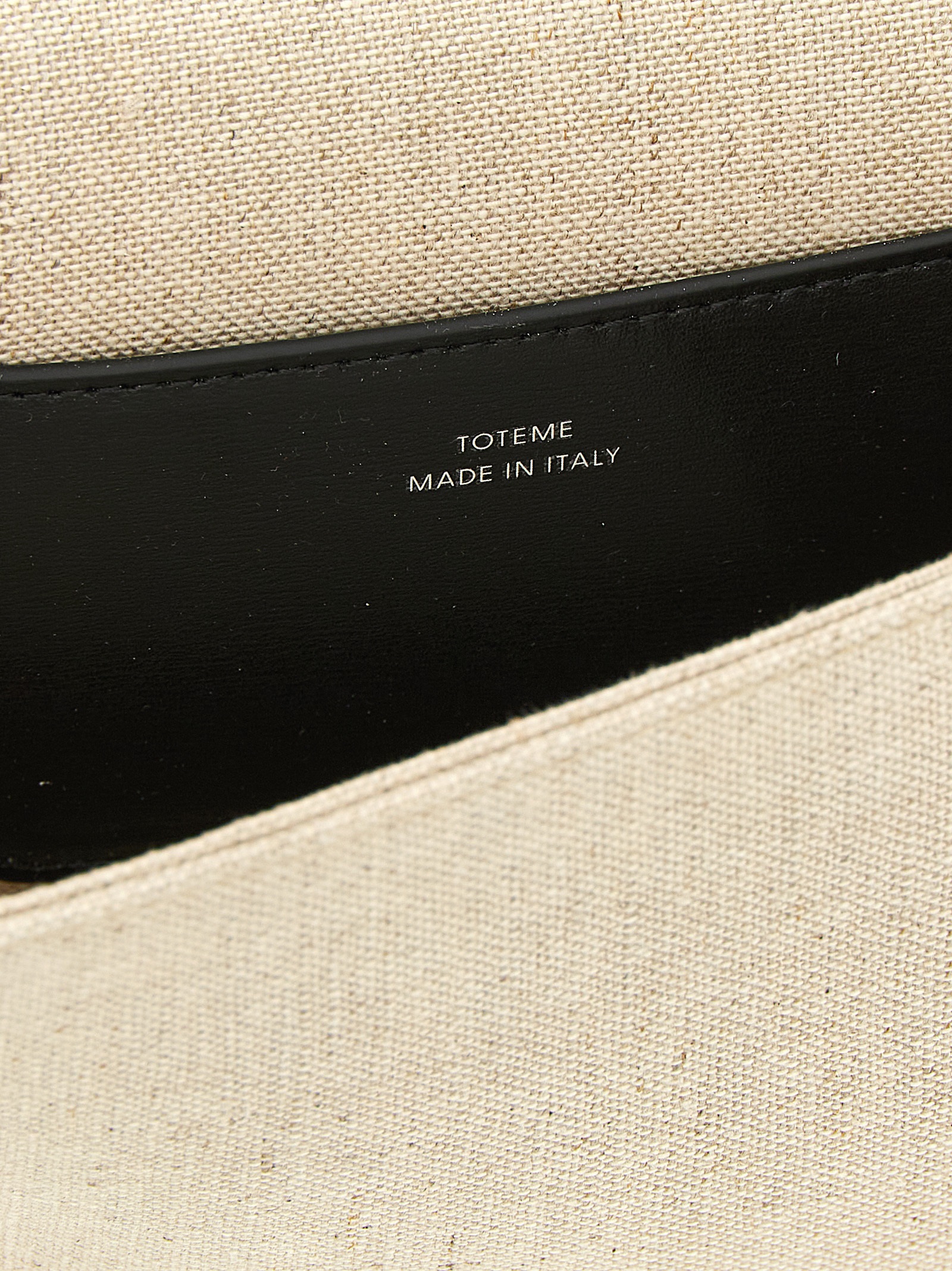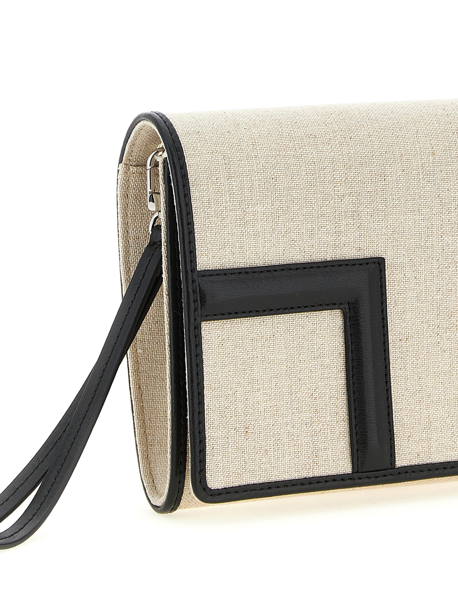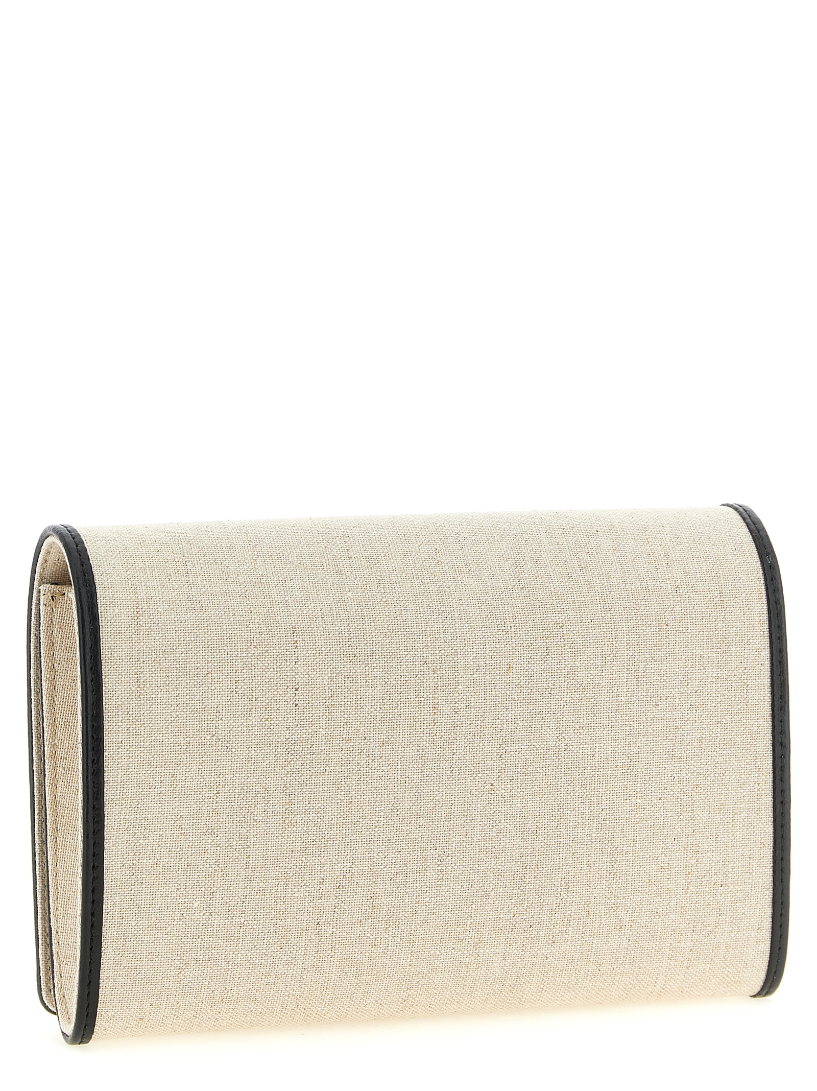 ‘T-Flap Envelope’ cotton and linen blend canvas clutch bag with contrasting smooth leather details, envelope design, T-Flap interlocking closure, removable wrist strap.