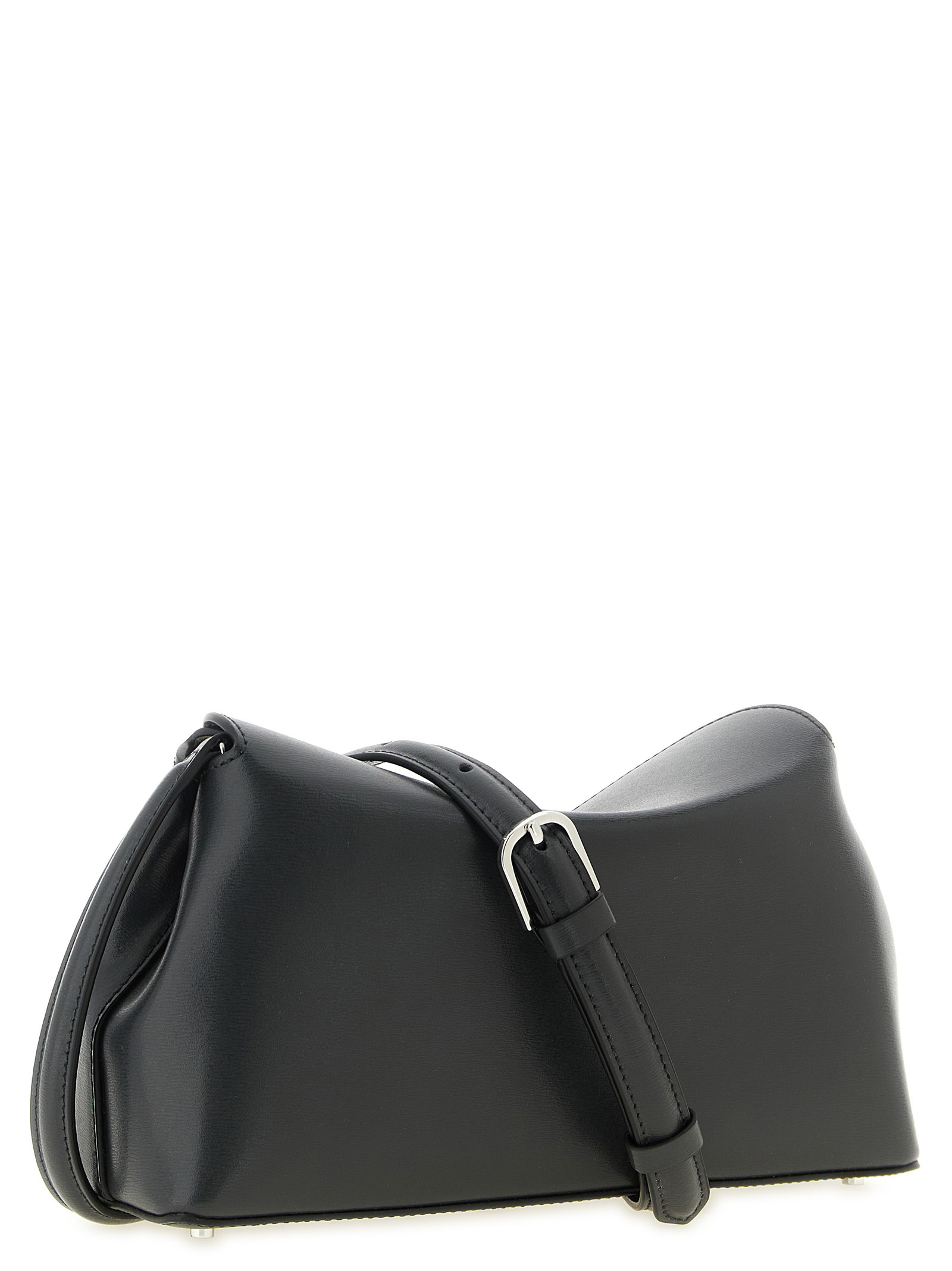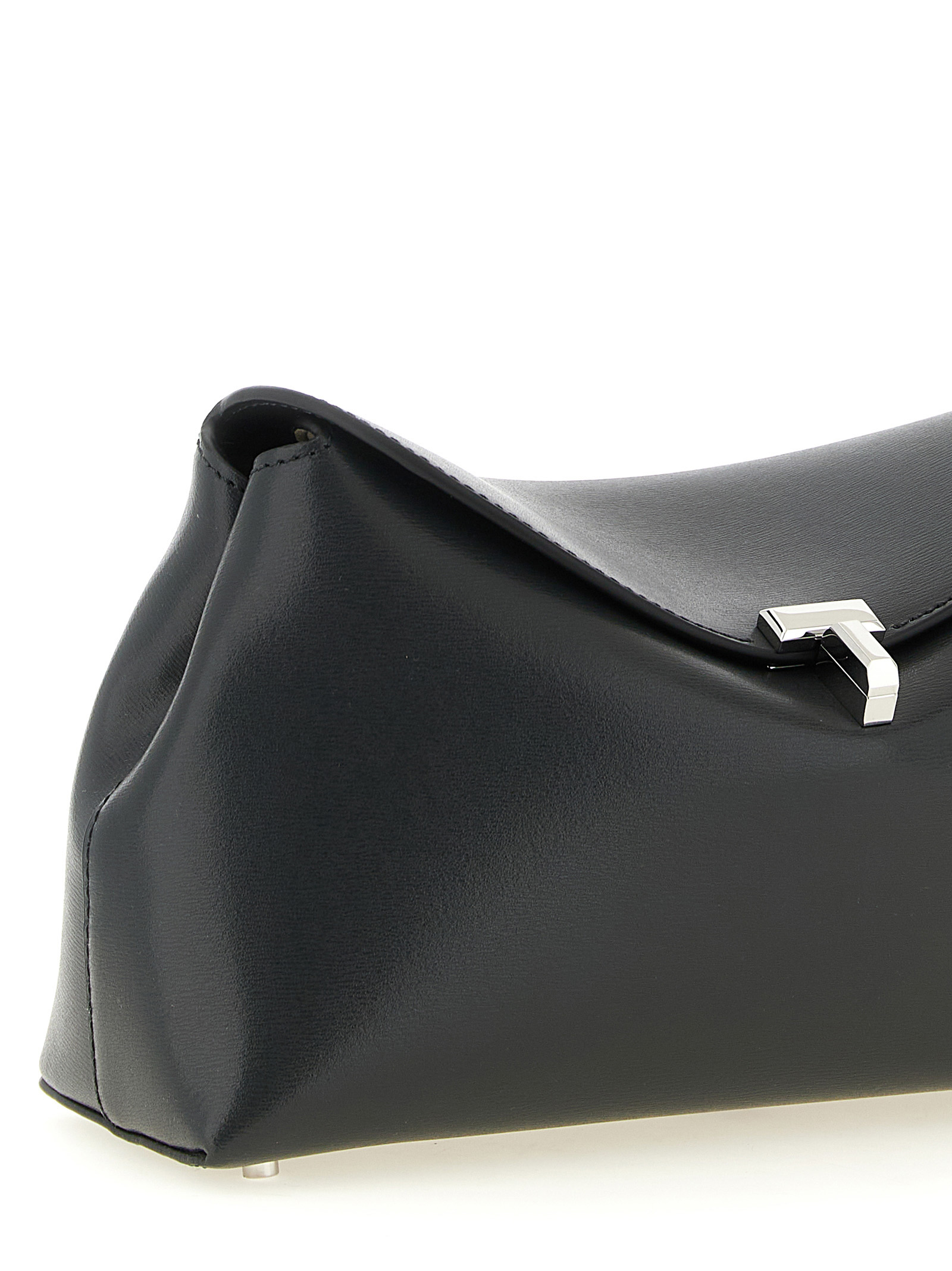 Palmellata leather clutch, suede effect fabric lining, sculptural design with curved top flap, flap closure with front metal ‘T-Lock’ spin, rigid base with metal feet, adjustable and removable shoulder strap.