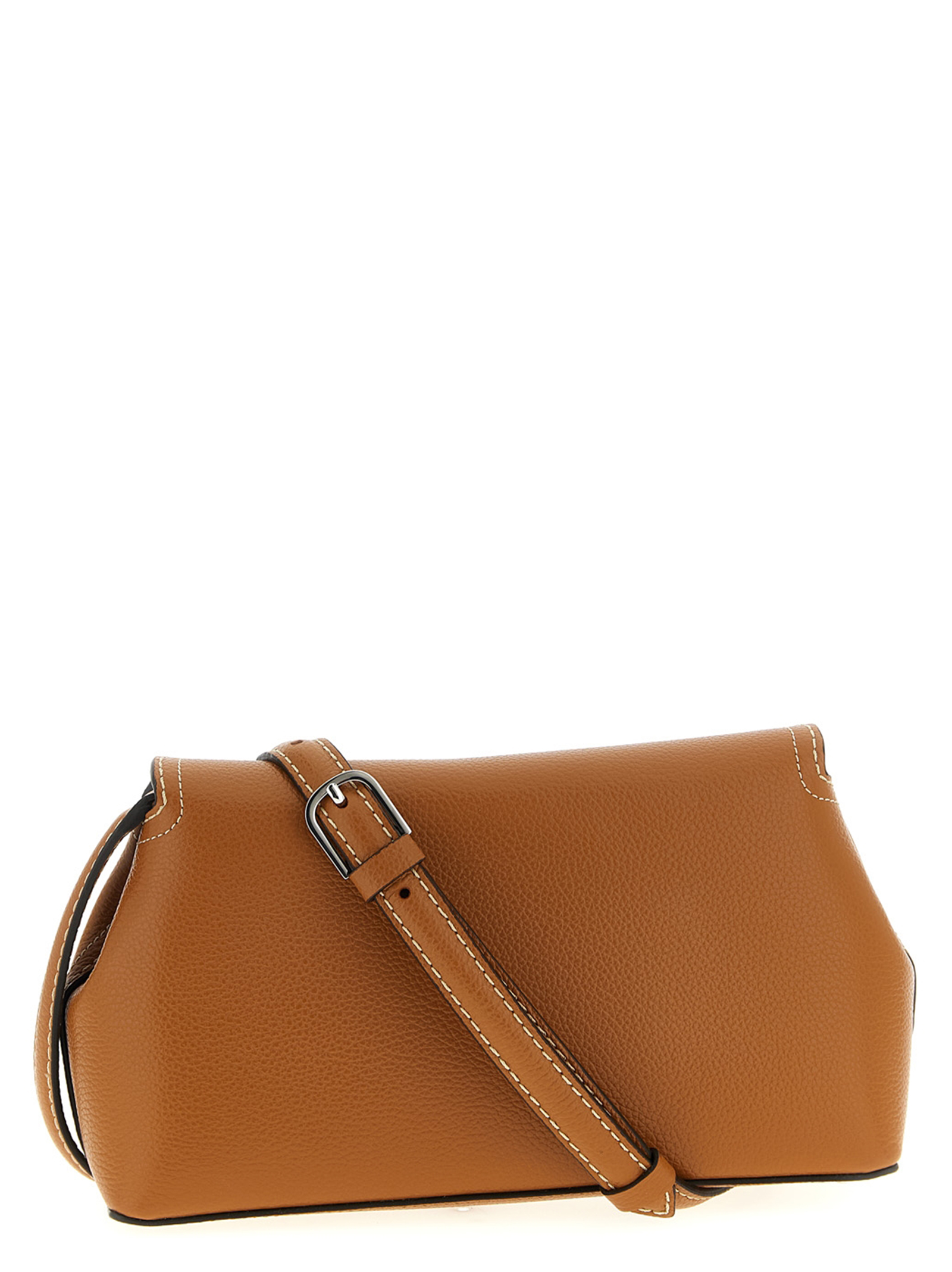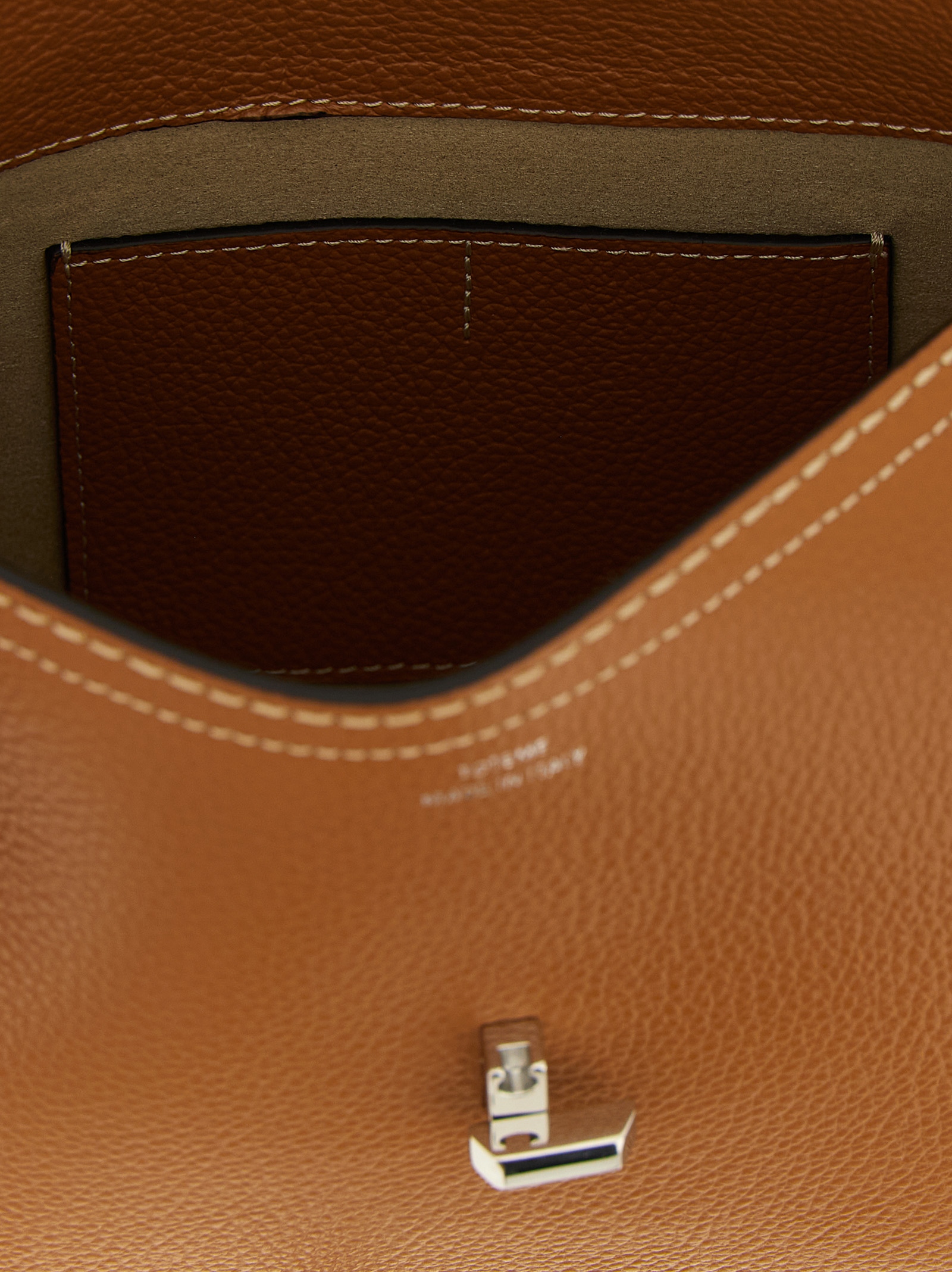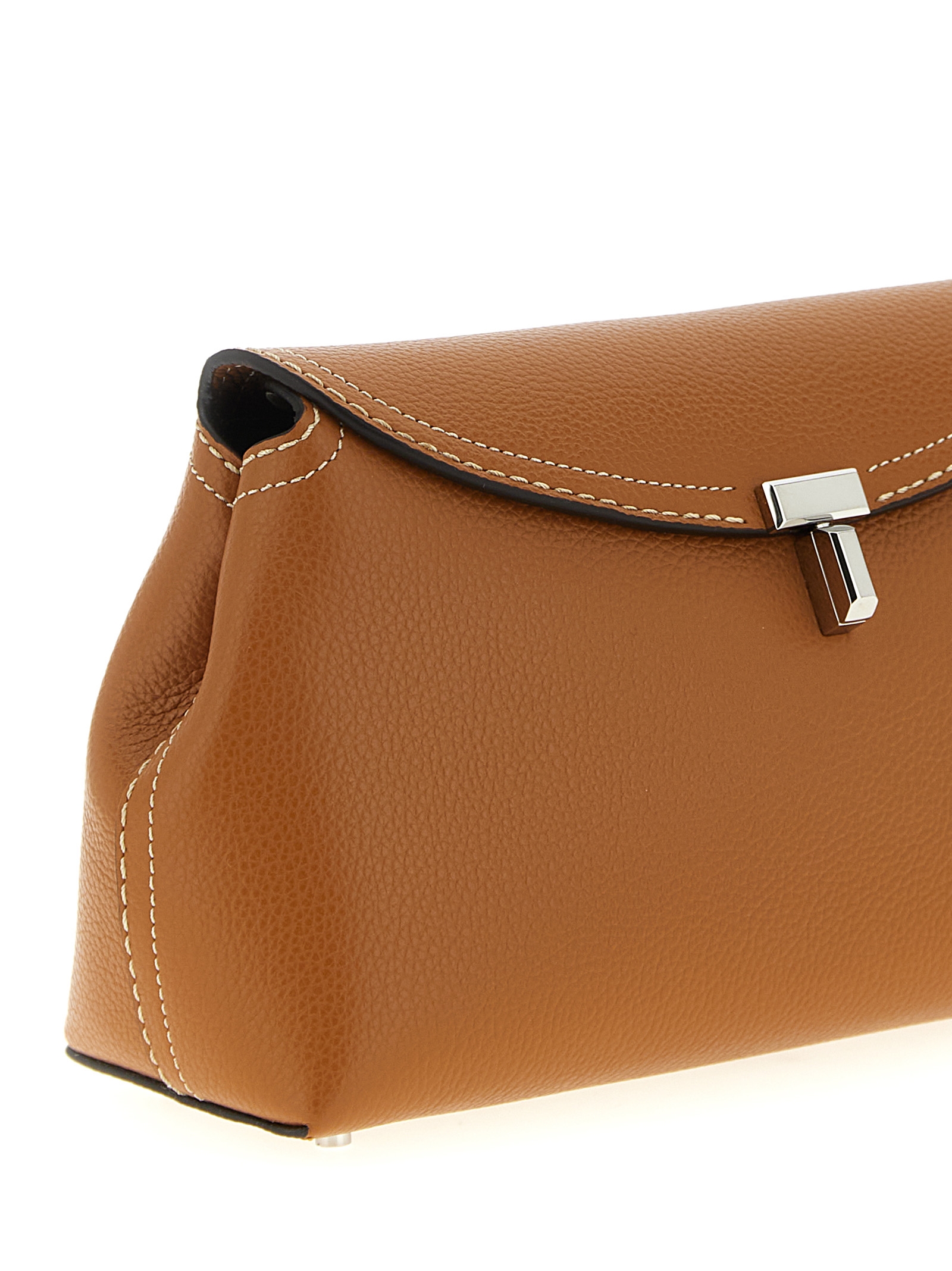 ‘T-lock’ grainy leather clutch with contrast stitching, flap closure with rotating metal mechanism, rigid base with metal feet, adjustable and removable shoulder strap.