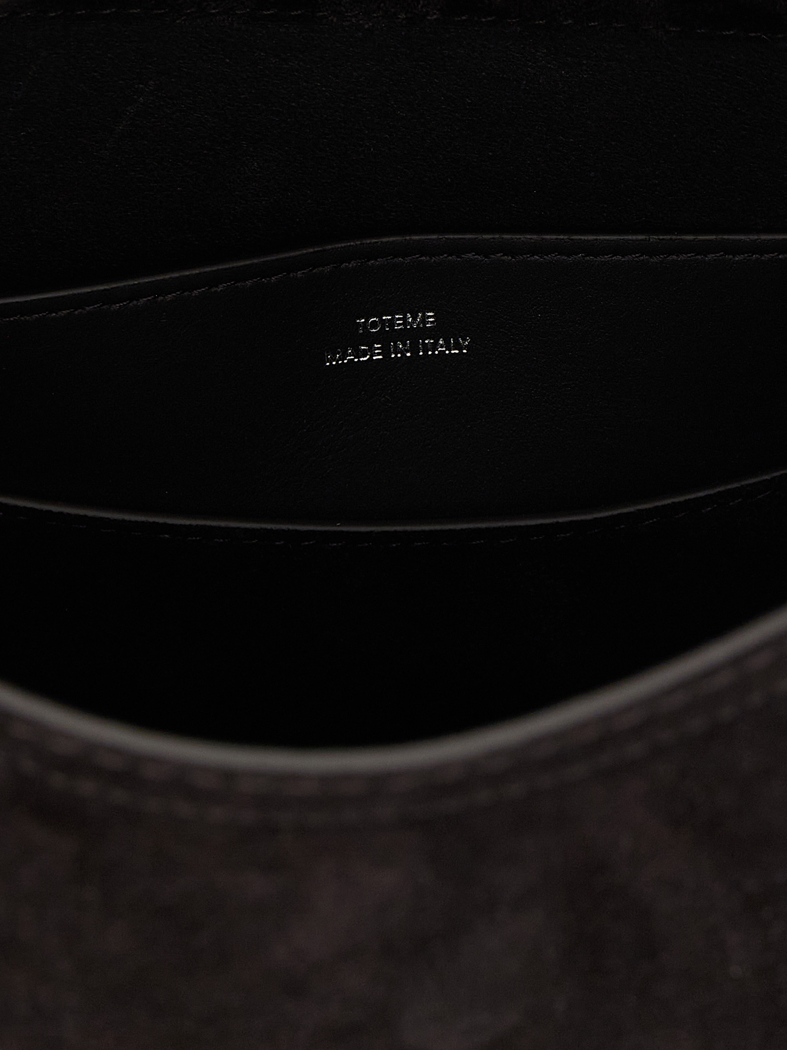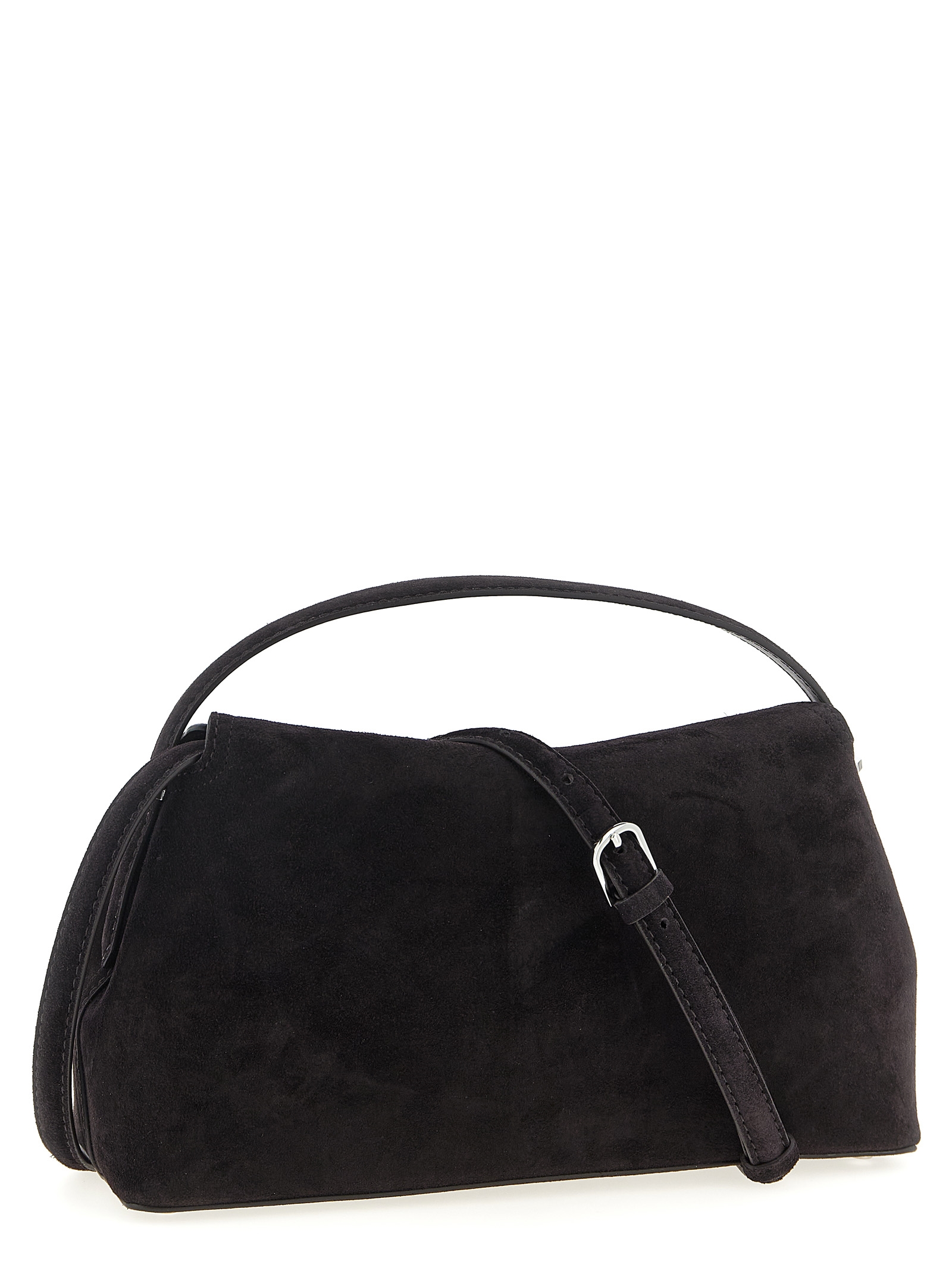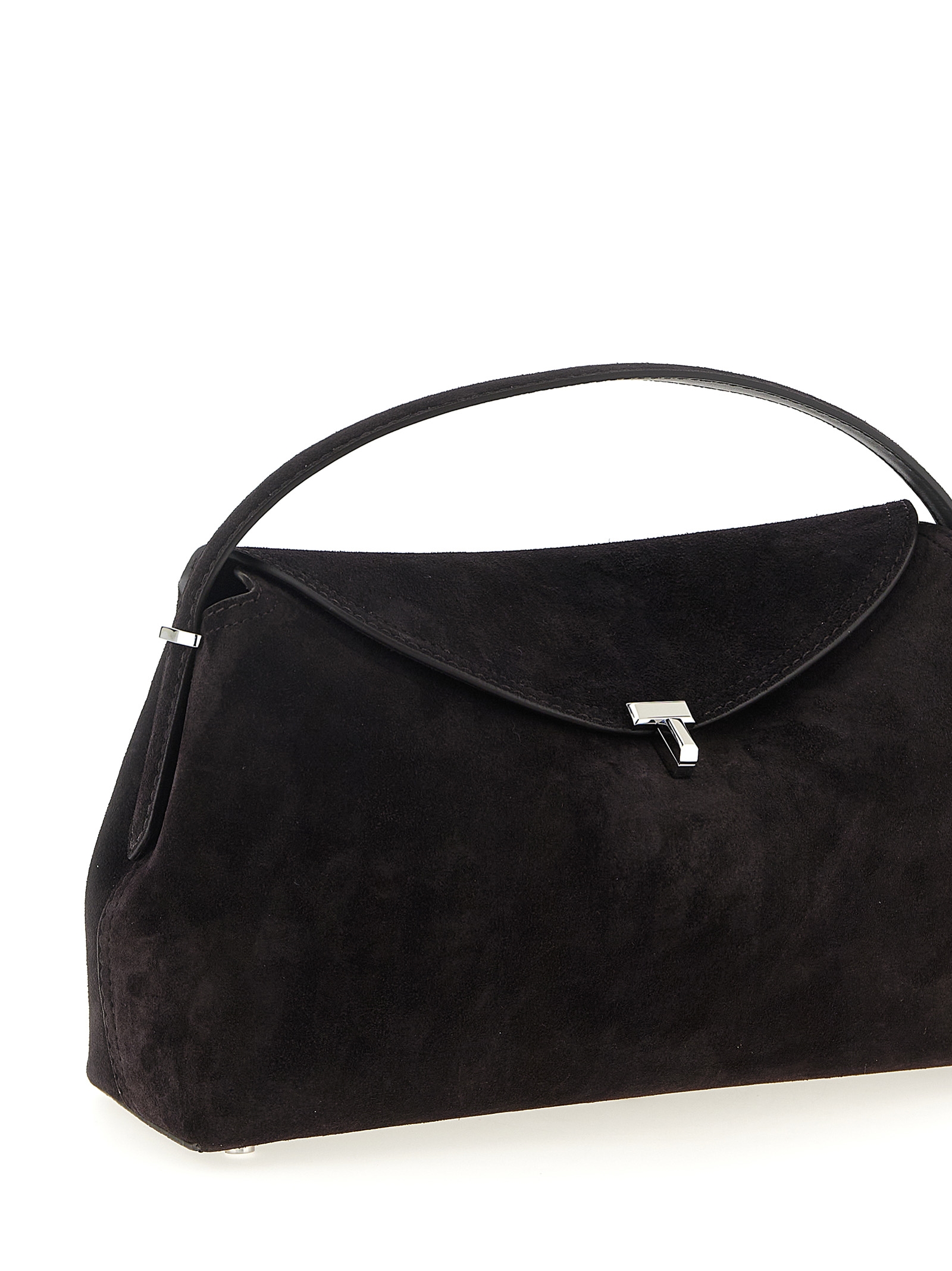 ‘T-Lock’ suede handbag with curved top flap, fixed handle, front metal turn lock, adjustable and removable shoulder strap.