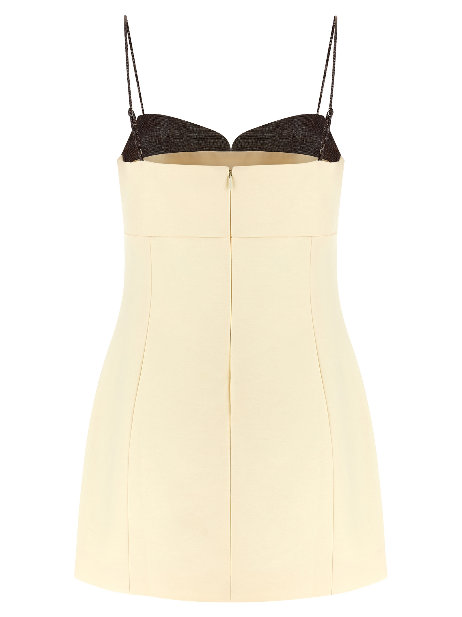 ‘Tailored’ heavy cotton mini dress with contrasting linen details, panel construction, front and back shaping pleats, front heart-shaped neckline, thin adjustable straps, sleeveless, pockets, back zip closure, cupro lining.