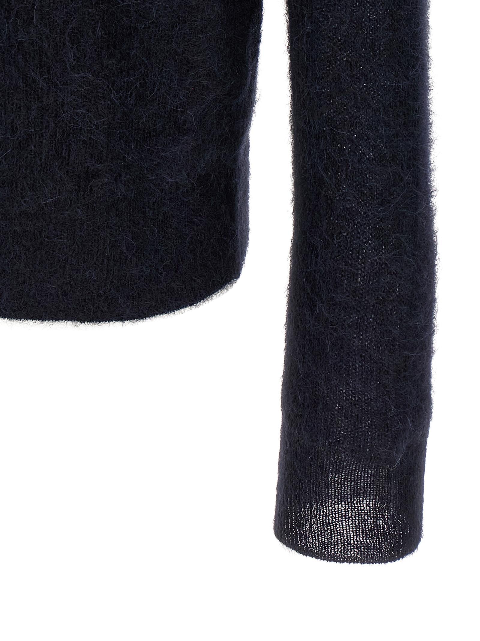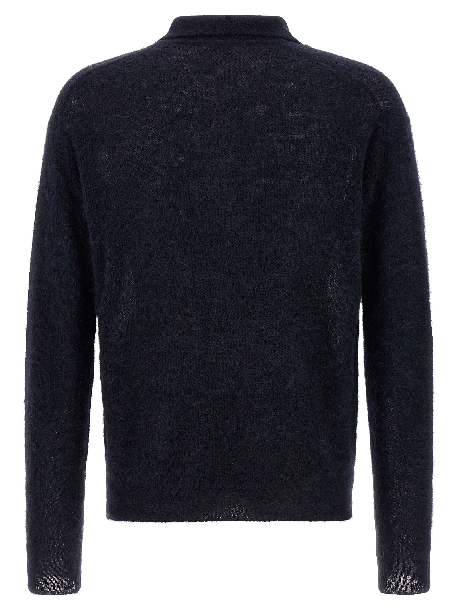 Polo shirt in precious tam yarn of rare suri baby alpacas, V-neck, collar, long sleeves with cuffs and dropped shoulder.