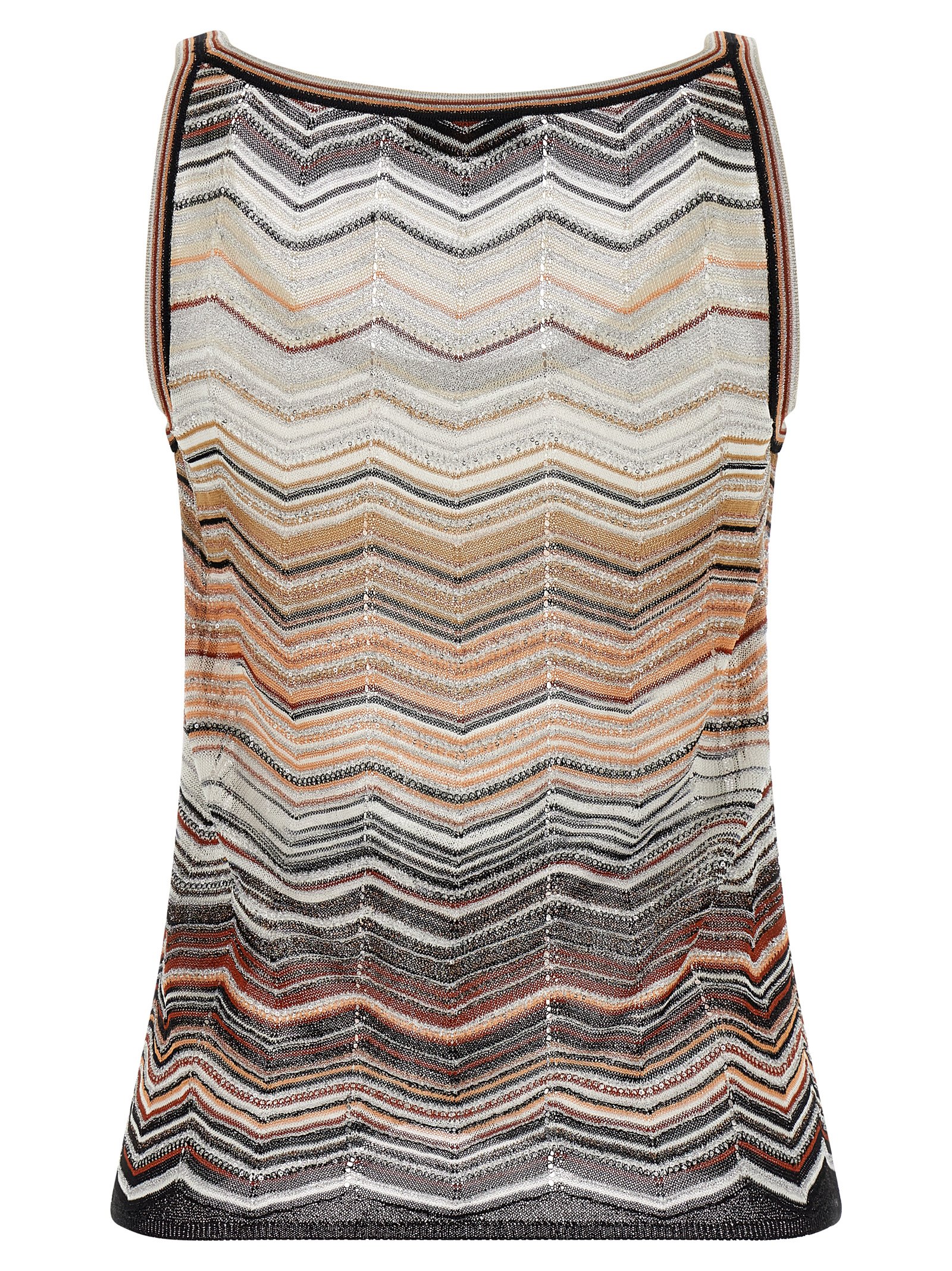 Tank top in viscose chevron lamé pattern with all-over sequin application, wide round neckline on the front.