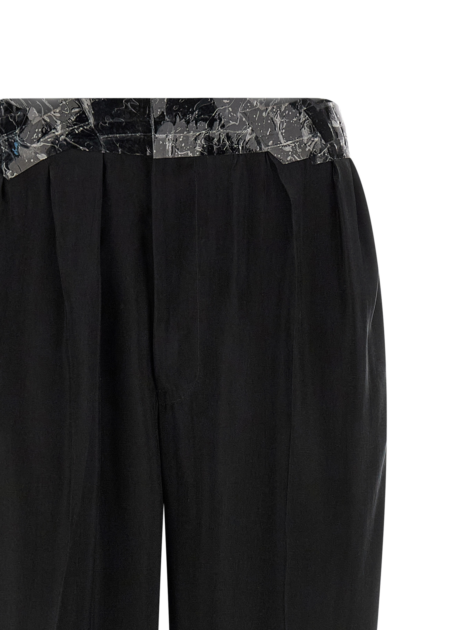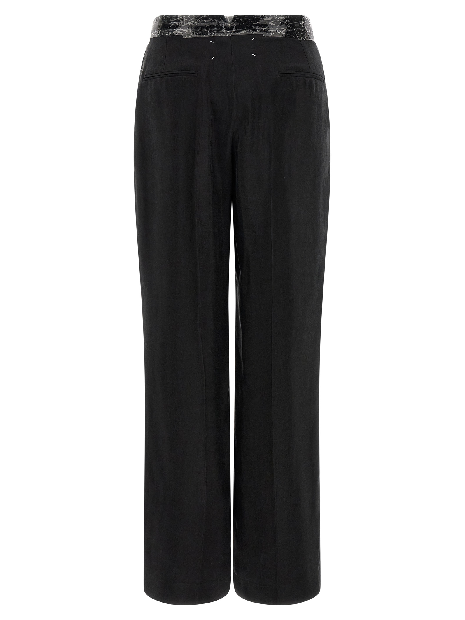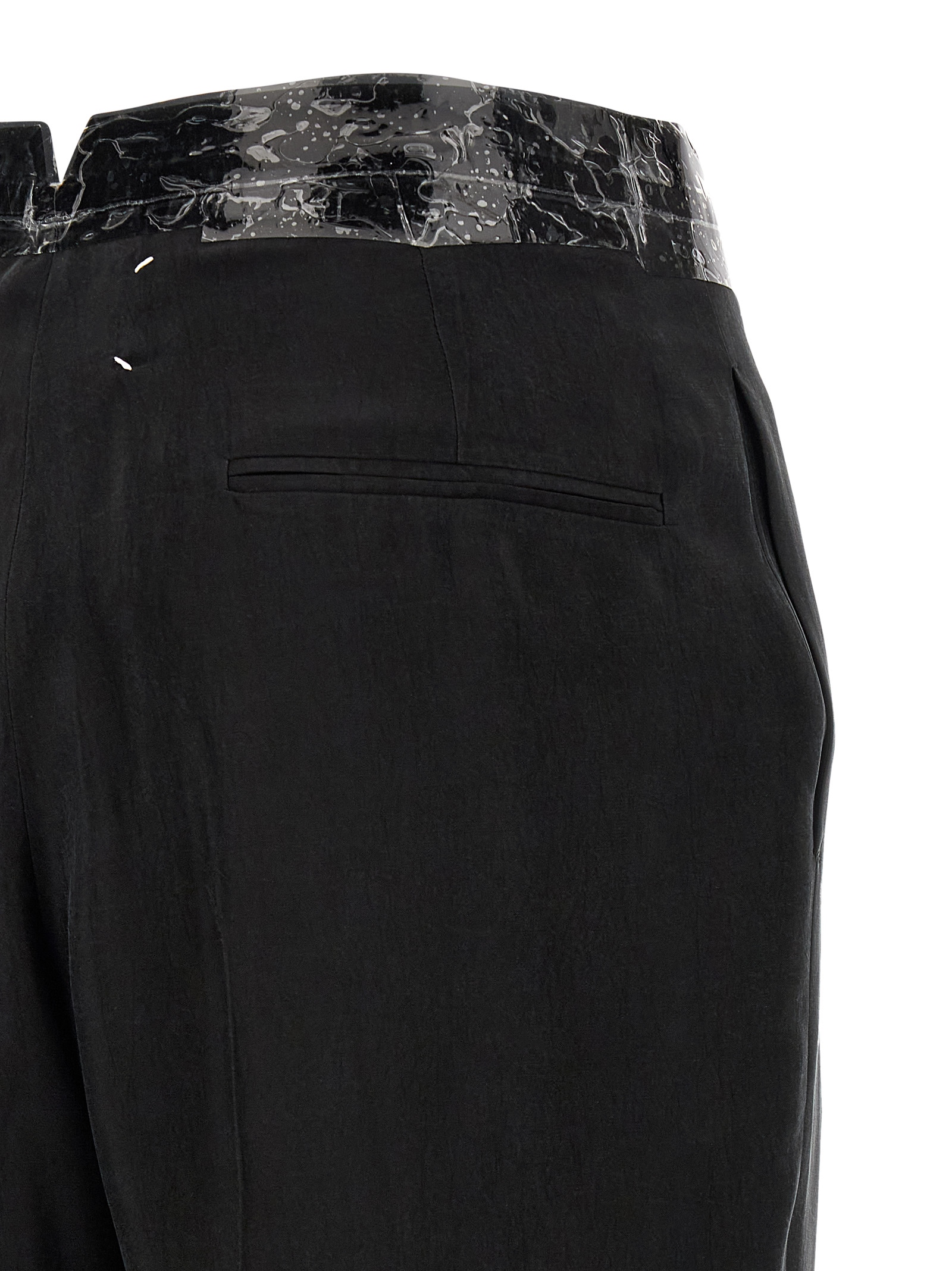 ‘Taped’ fluid cupro pants, pince, stretched pleat, wide and straight leg, transparent tape at the waist, hook and front button zip closure, front French pockets, welt pockets and ‘Four Stitches’ at the back.