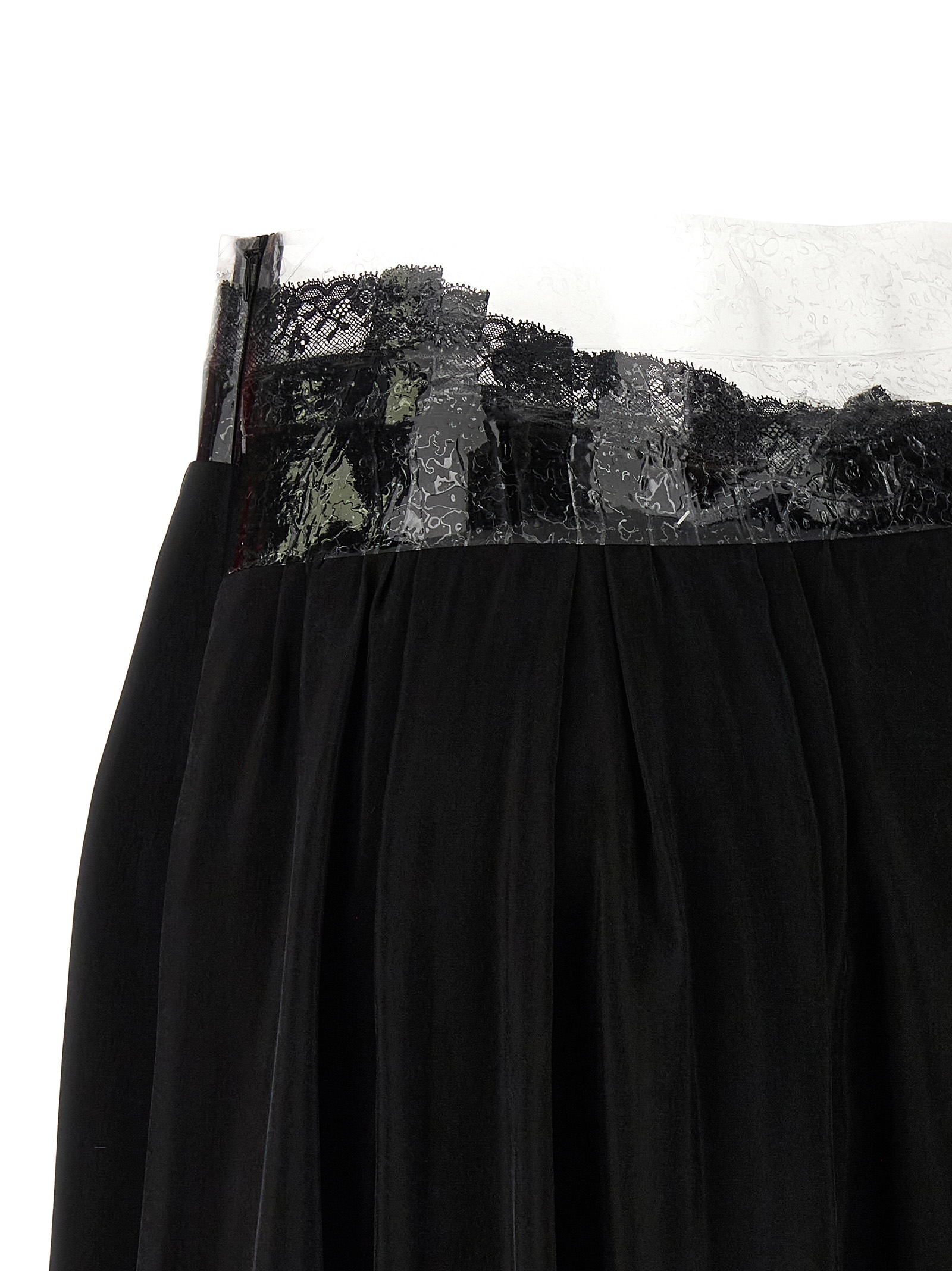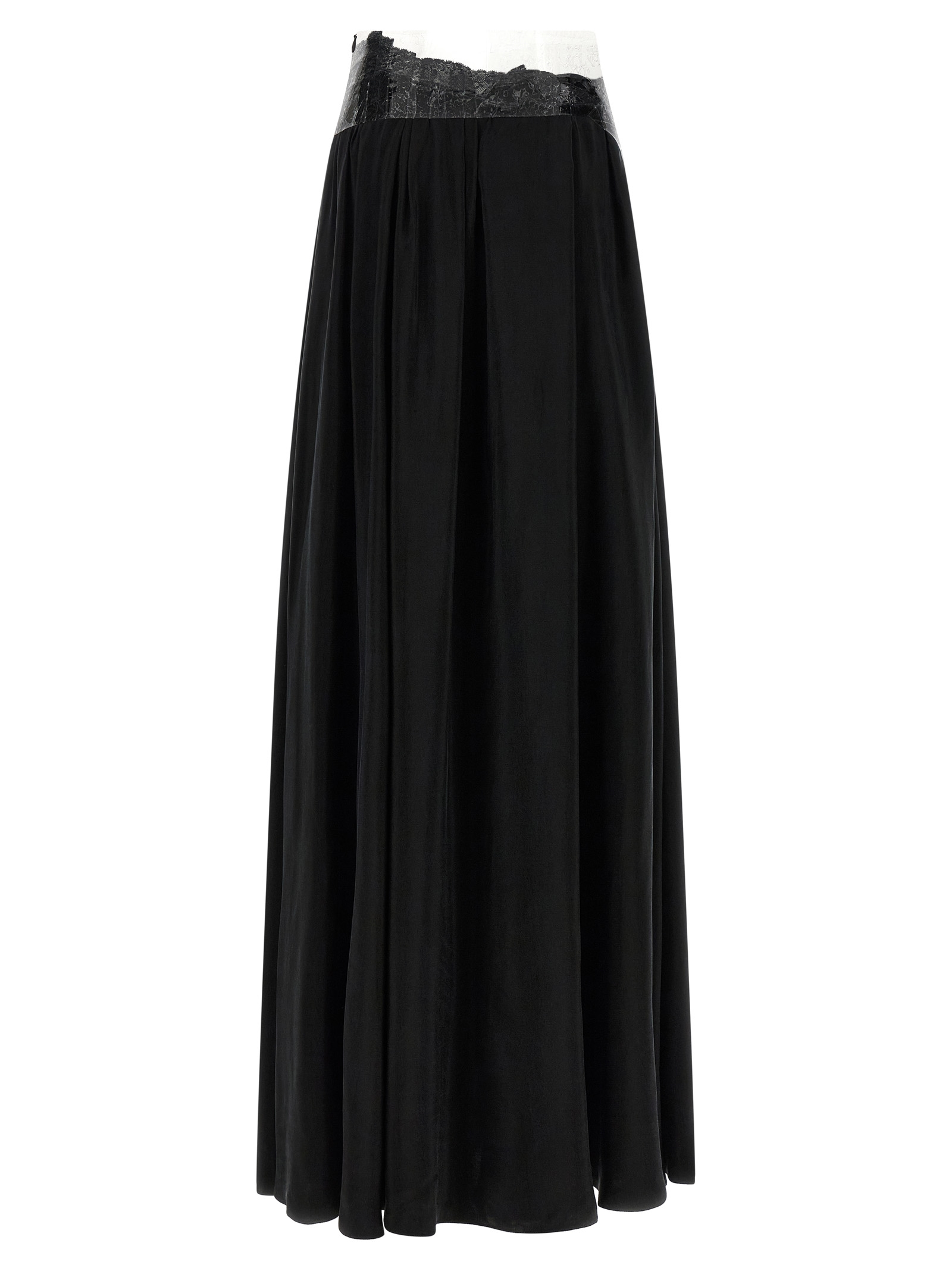 Long ‘Taped’ flowing cupro skirt with flared silhouette, transparent ribbon waist with lace trim underneath, side zip closure, back ‘Four Stitches’.