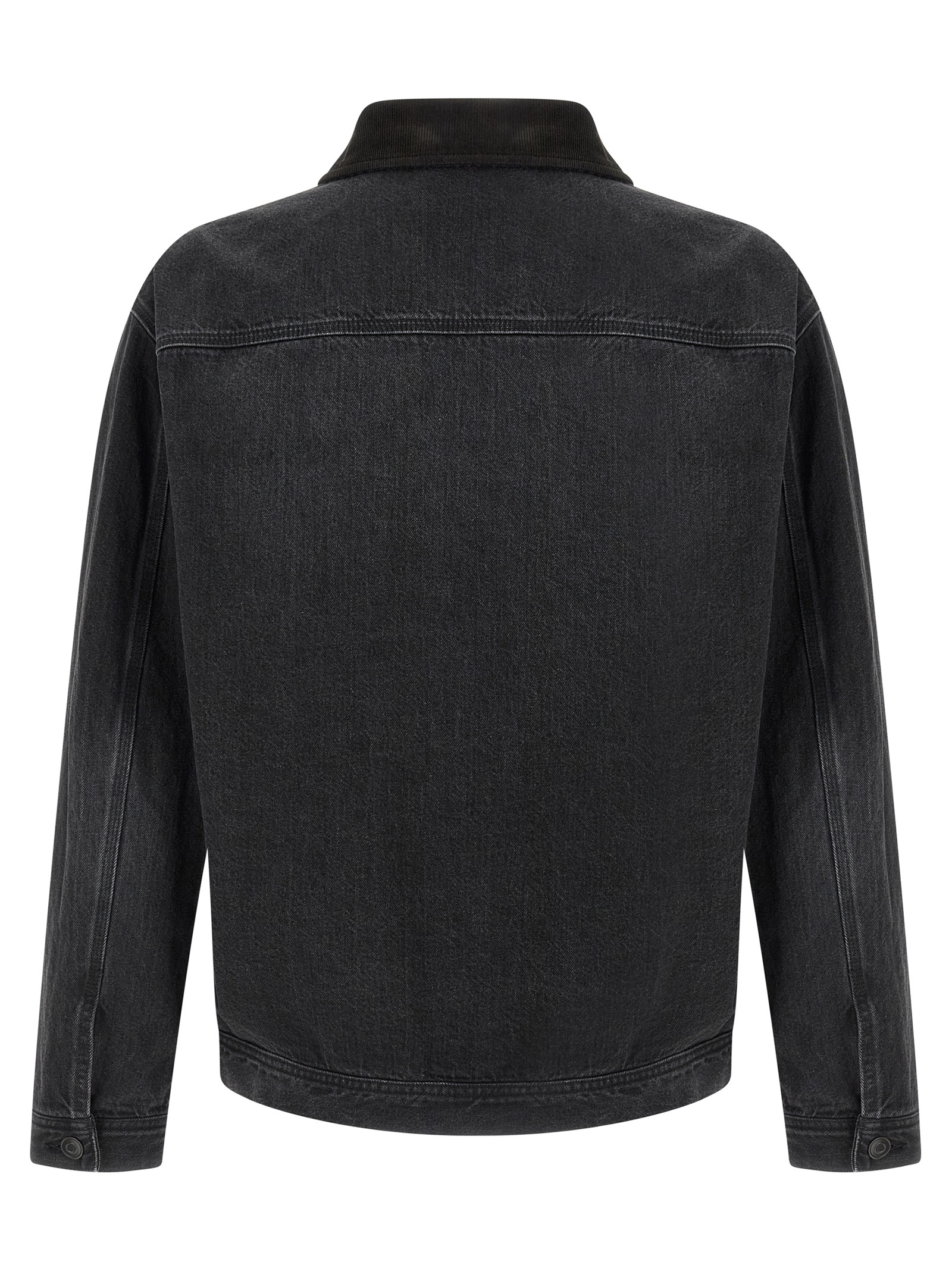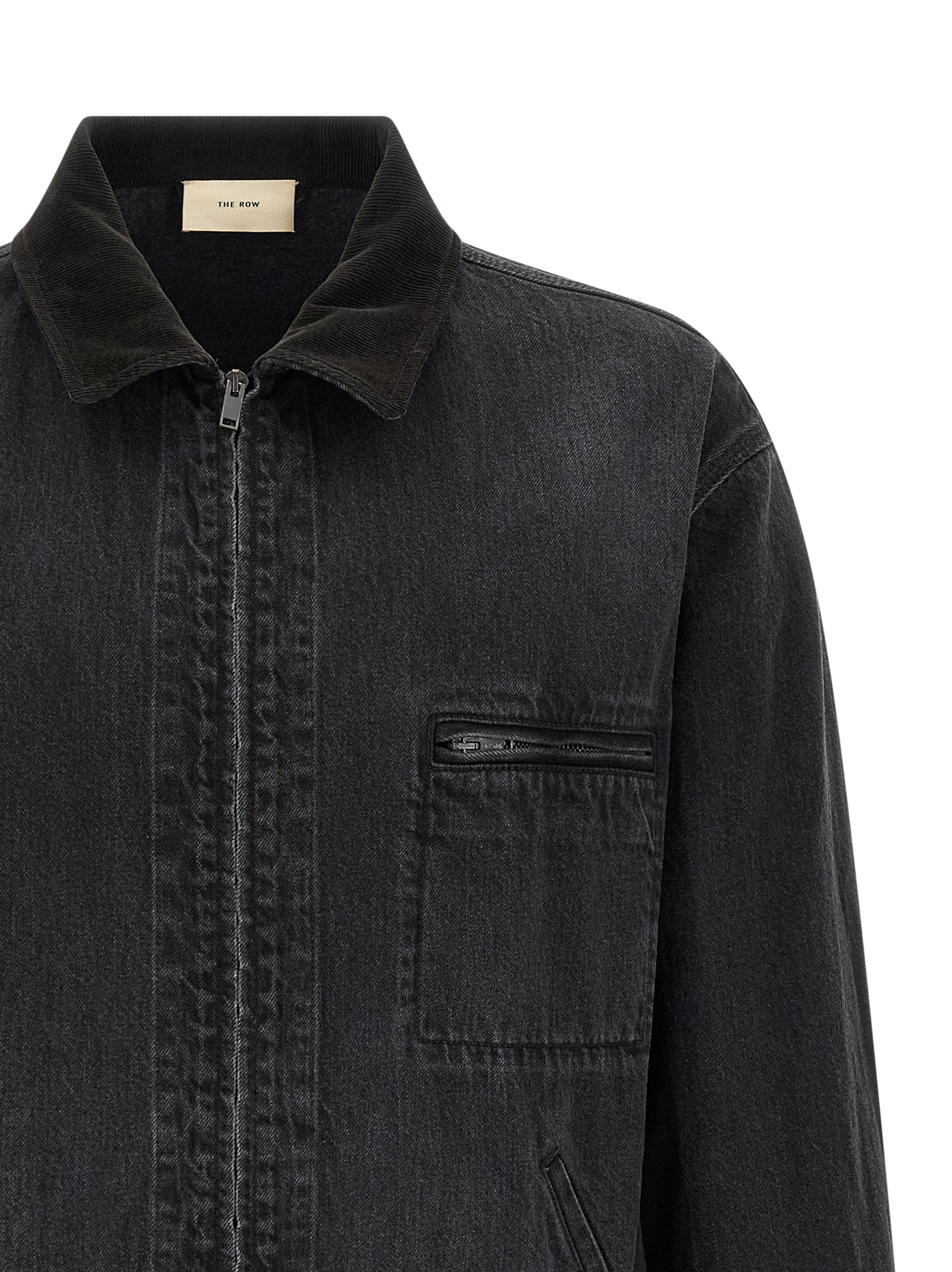 ‘Tarquin’ jacket in natural cotton denim spun and dyed, tone-on-tone corduroy collar, front zip closure, pockets, long sleeves cuffs and dropped shoulder, unlined.