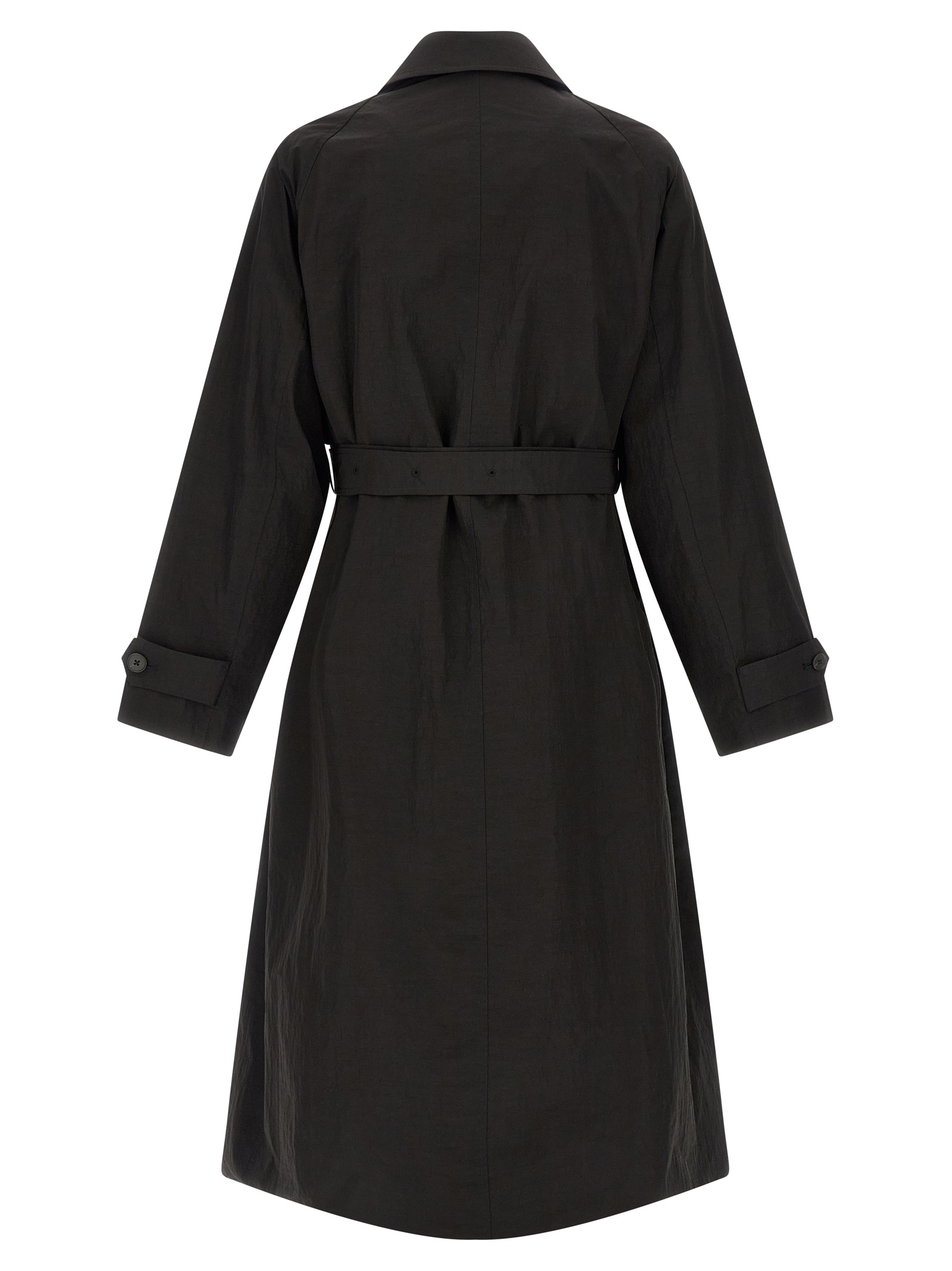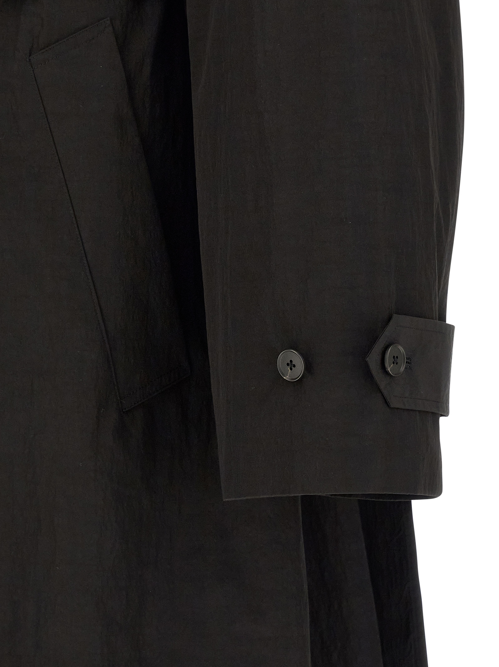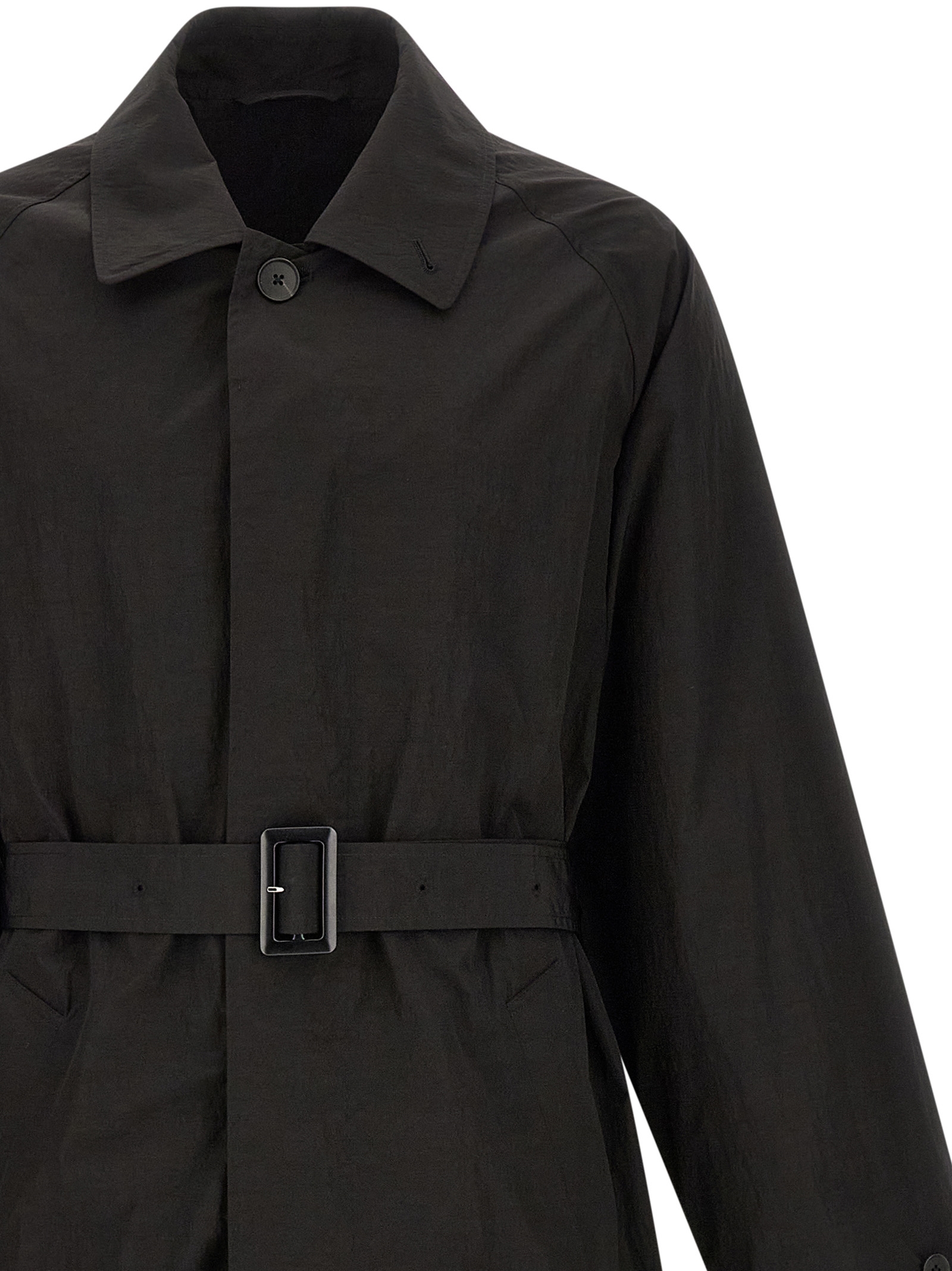 Trench coat in technical fabric and rainproof cotton blend made by OLMETEX, multilayer model with long inner vest, closable collar with button, front button closure and adjustable belt at the waist with buckle, long sleeves with straps and button.