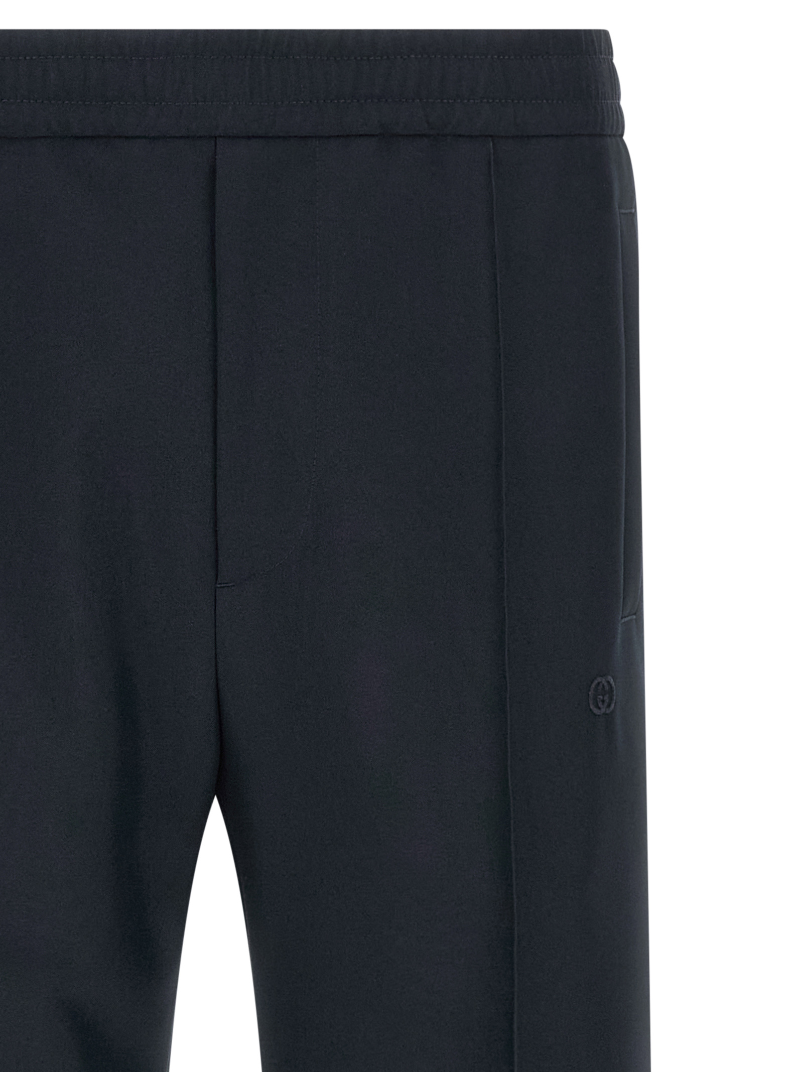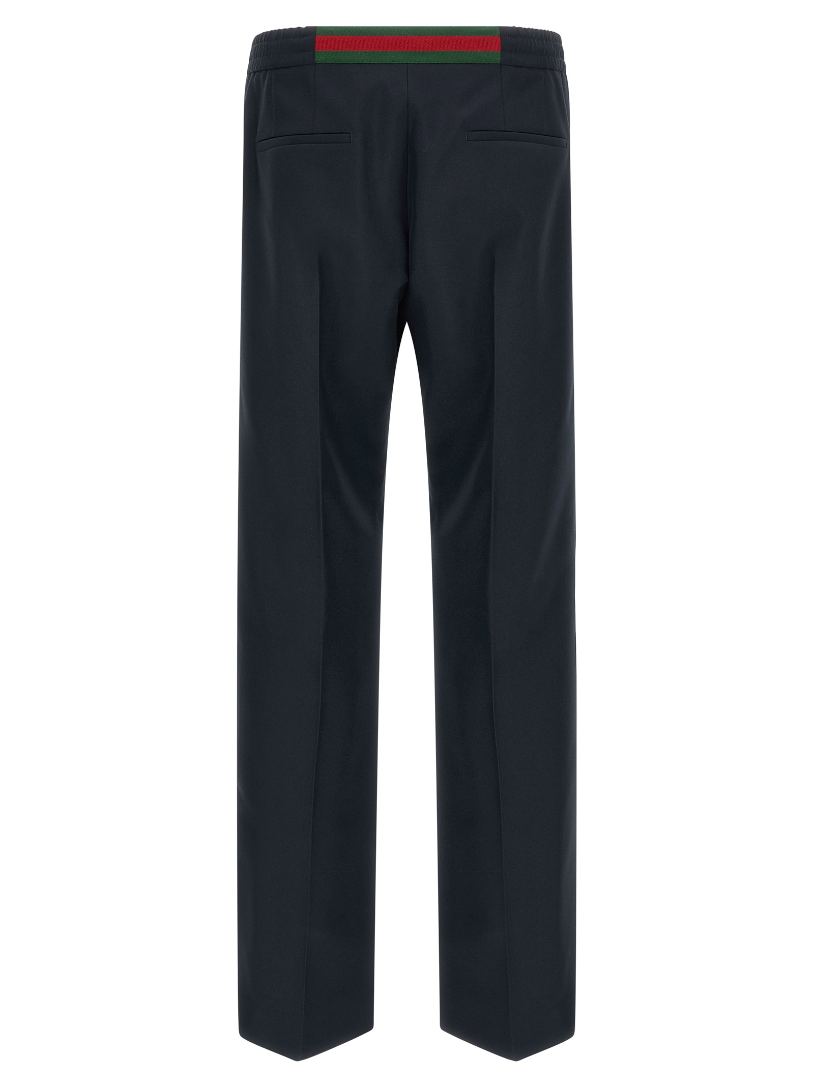 Technical panama pants, elastic and drawstring at the waist with back Web ribbon detail, tone-on-tone logo embroidery on the front, zip flap, pockets, central stitching, straight leg.