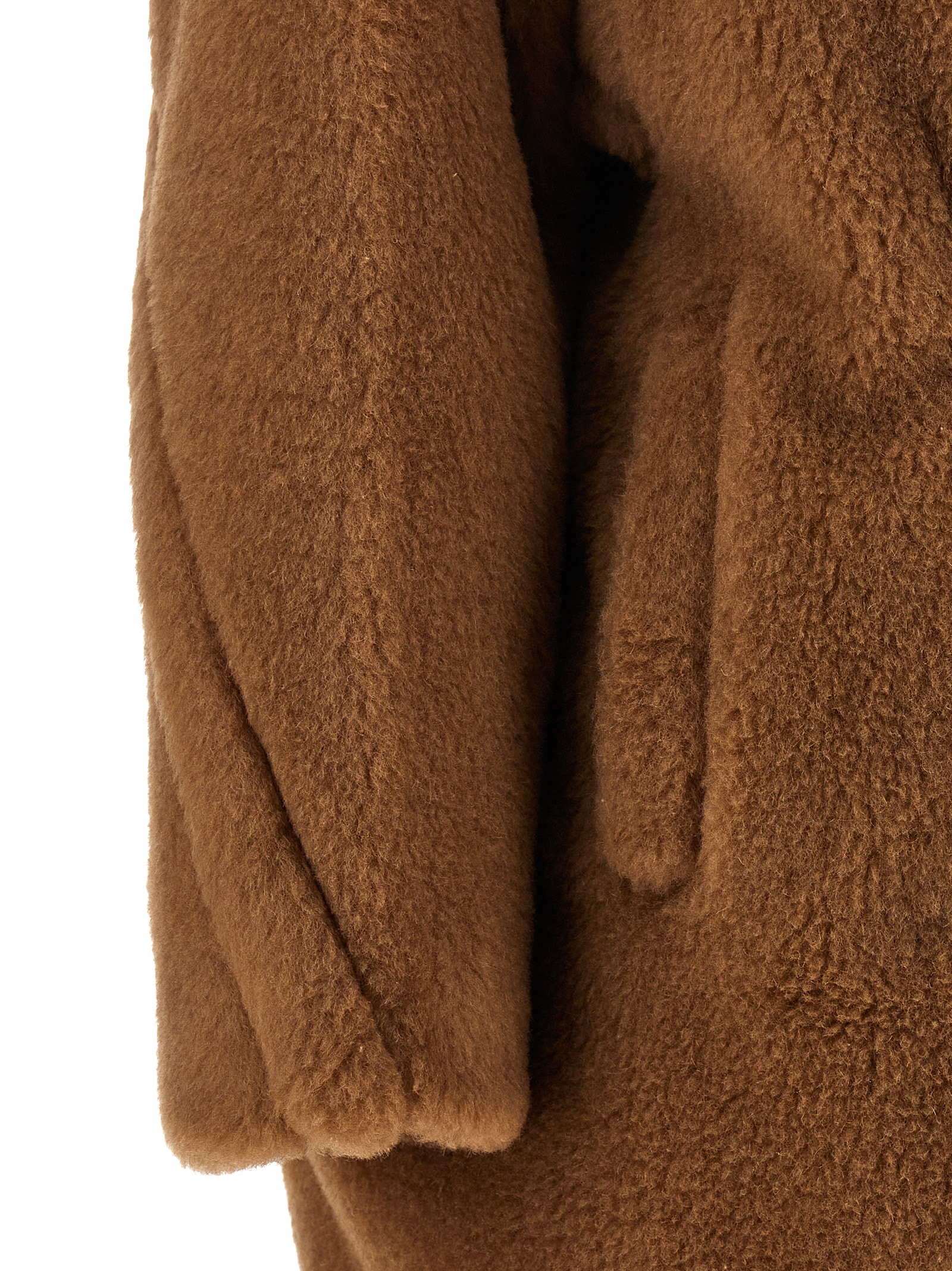 ‘Teddy’ fur coat, V-neck with lapels, double-breasted style with buttons, side pockets, long sleeves.