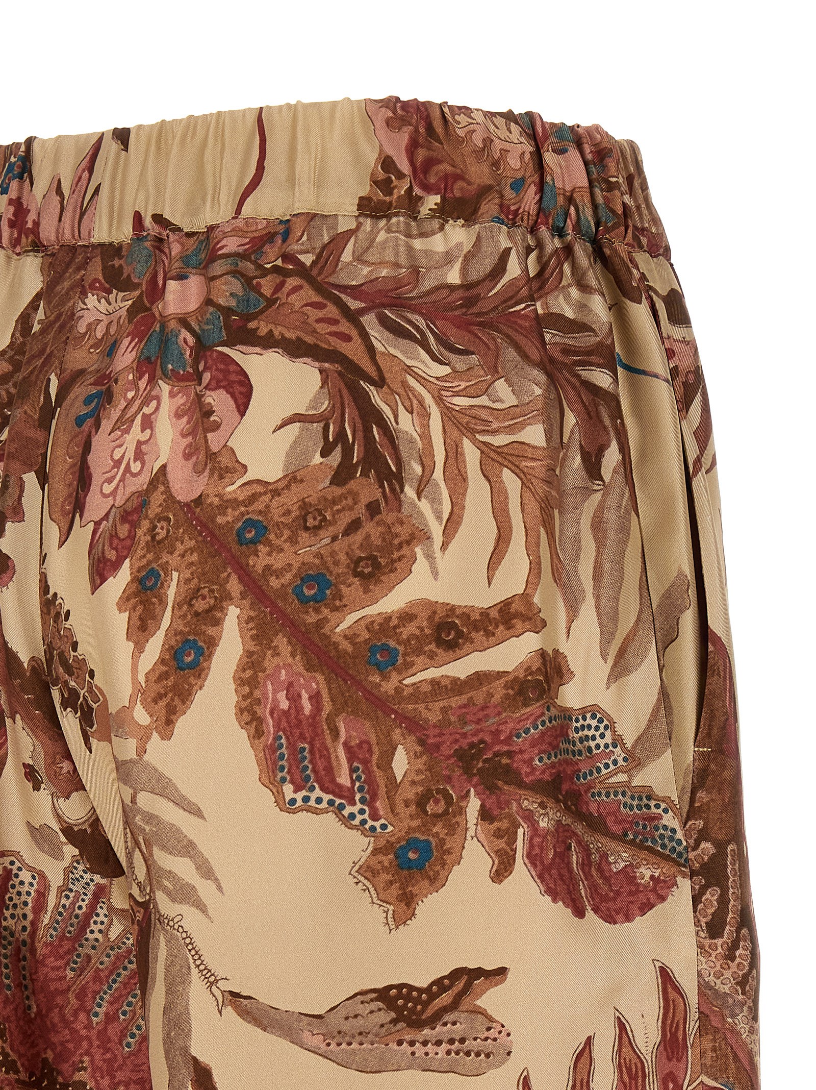 ‘Temide’ pure silk twill pants with all-over print, pajama style with crop cut, wide leg, elastic waistband, pockets.