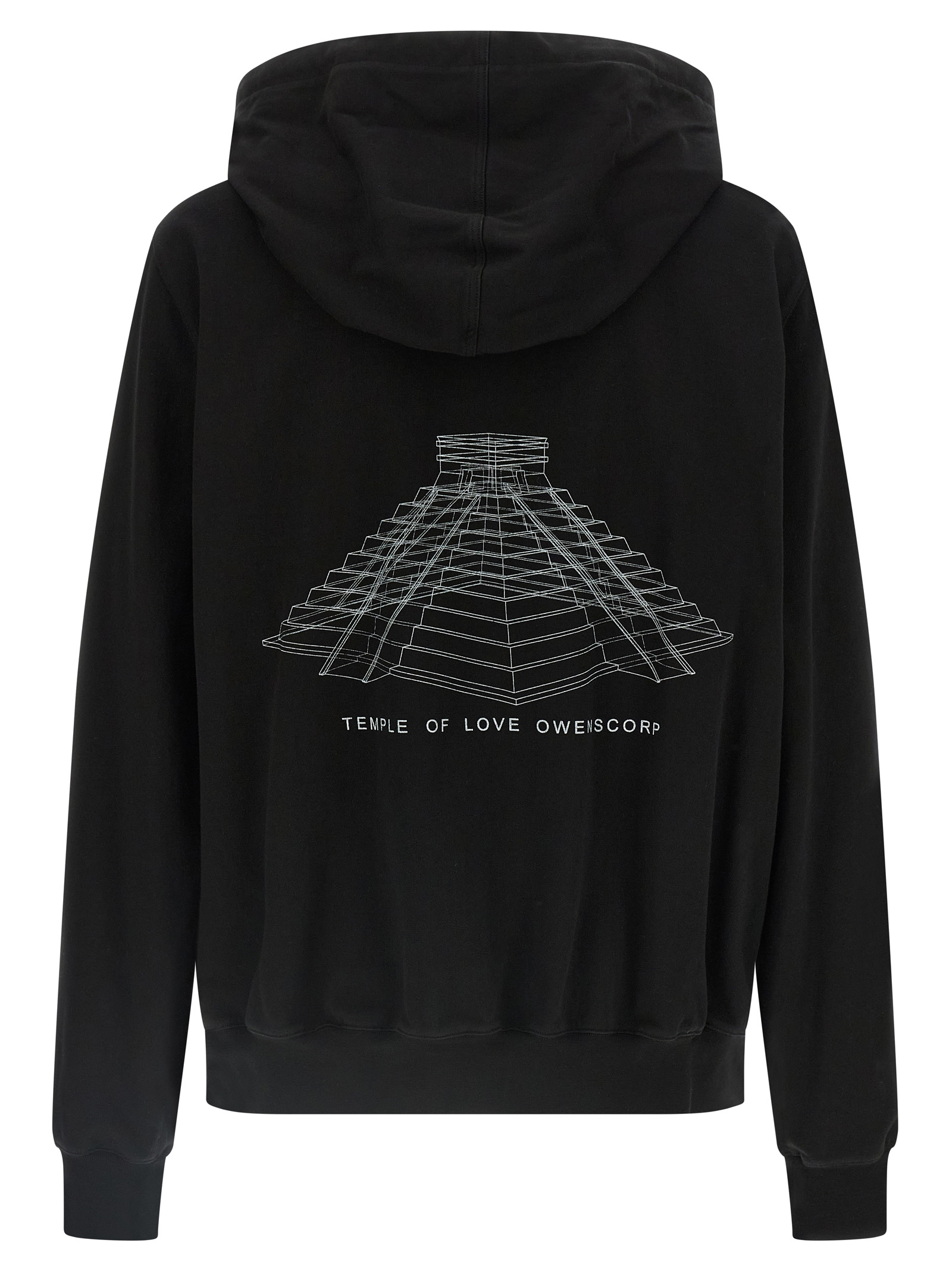 Heavy cotton jersey hoodie with Temple of Love Owenscorp Temp print on the back, long sleeves with cuffs and dropped shoulders, and headband.