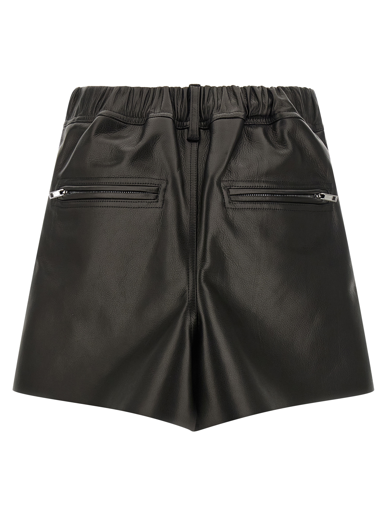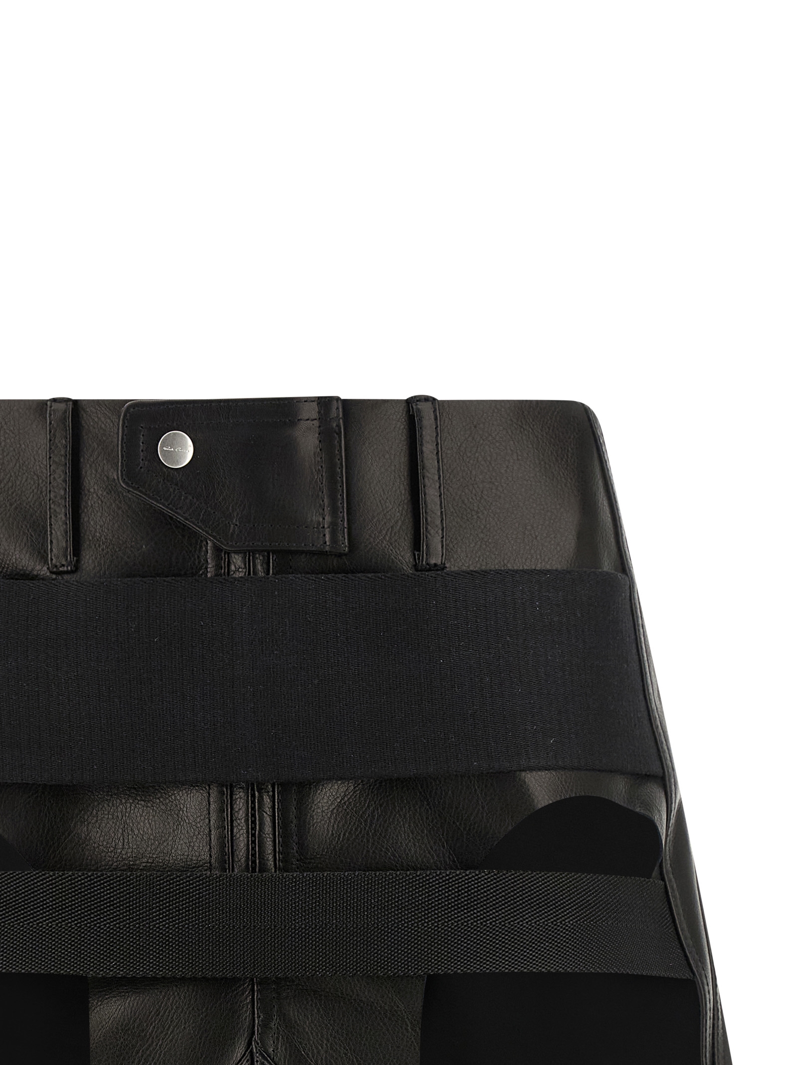 Leather mini skirt, cupro lining, ribbon tape and tone-on-tone grosgrain tape webbing on the front, front ‘Temple’ design, zip and snap button closure, elastic waistband and back split, pockets, and asymmetrical hem.