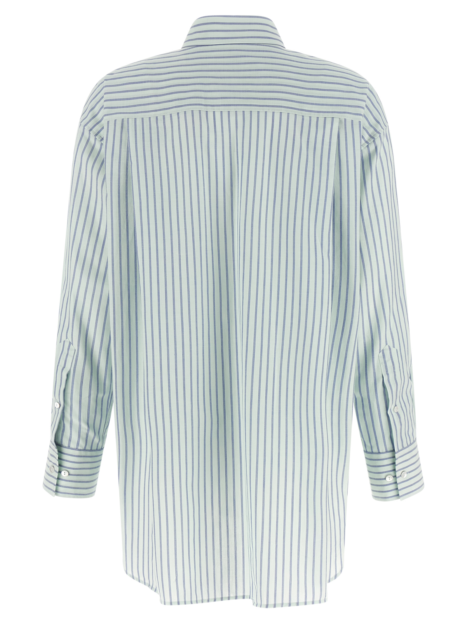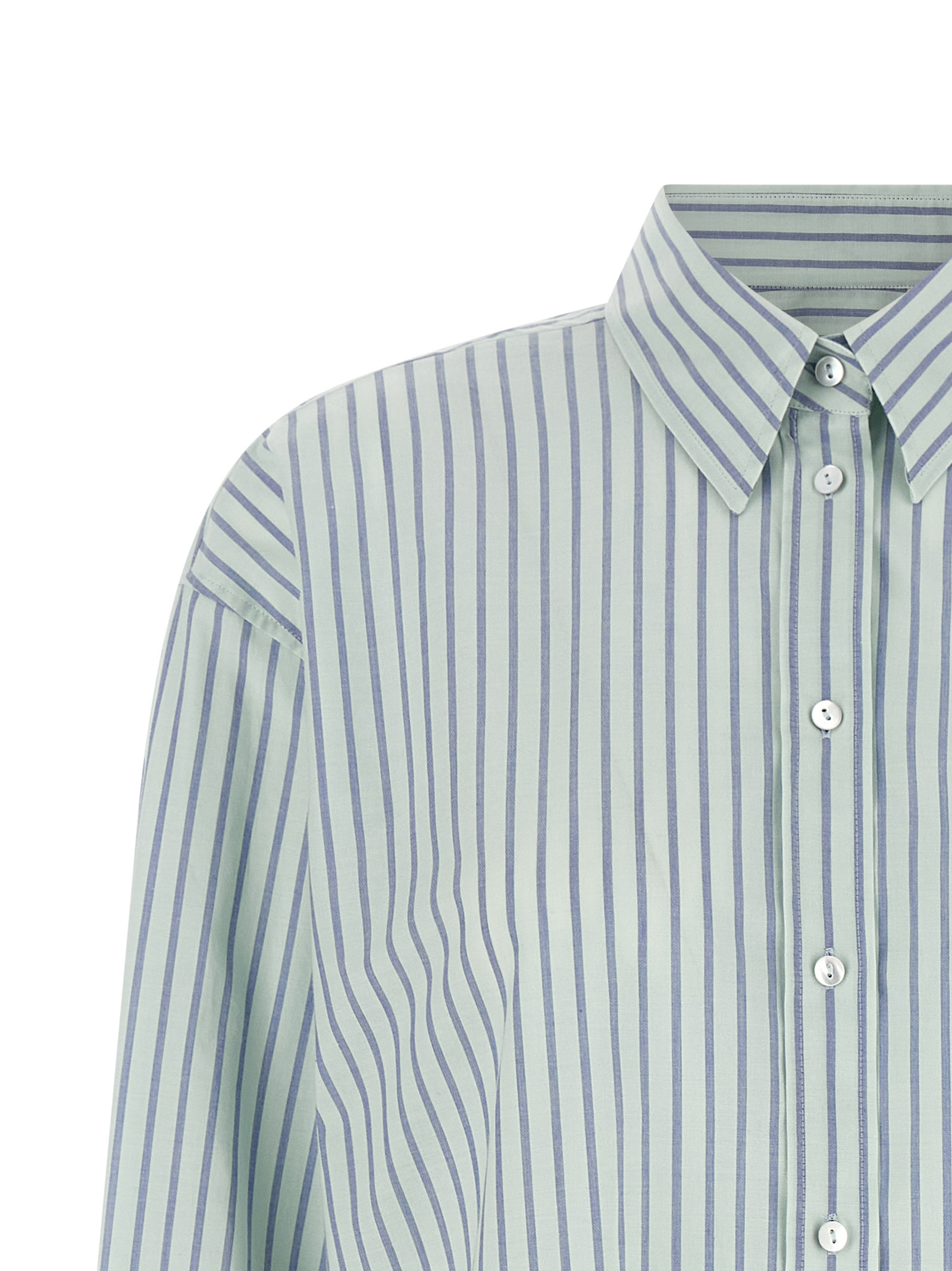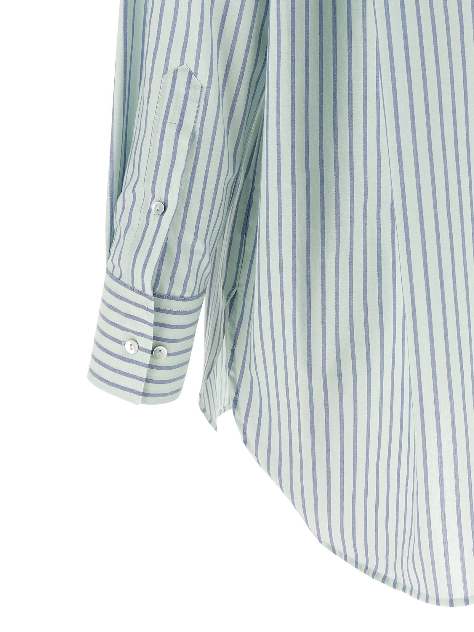 ‘Tessa’ shirt in cotton poplin striped pattern, pointed collar, front mother-of-pearl button closure, long sleeves with adjustable cuffs and dropped shoulder, rounded and asymmetrical hem.