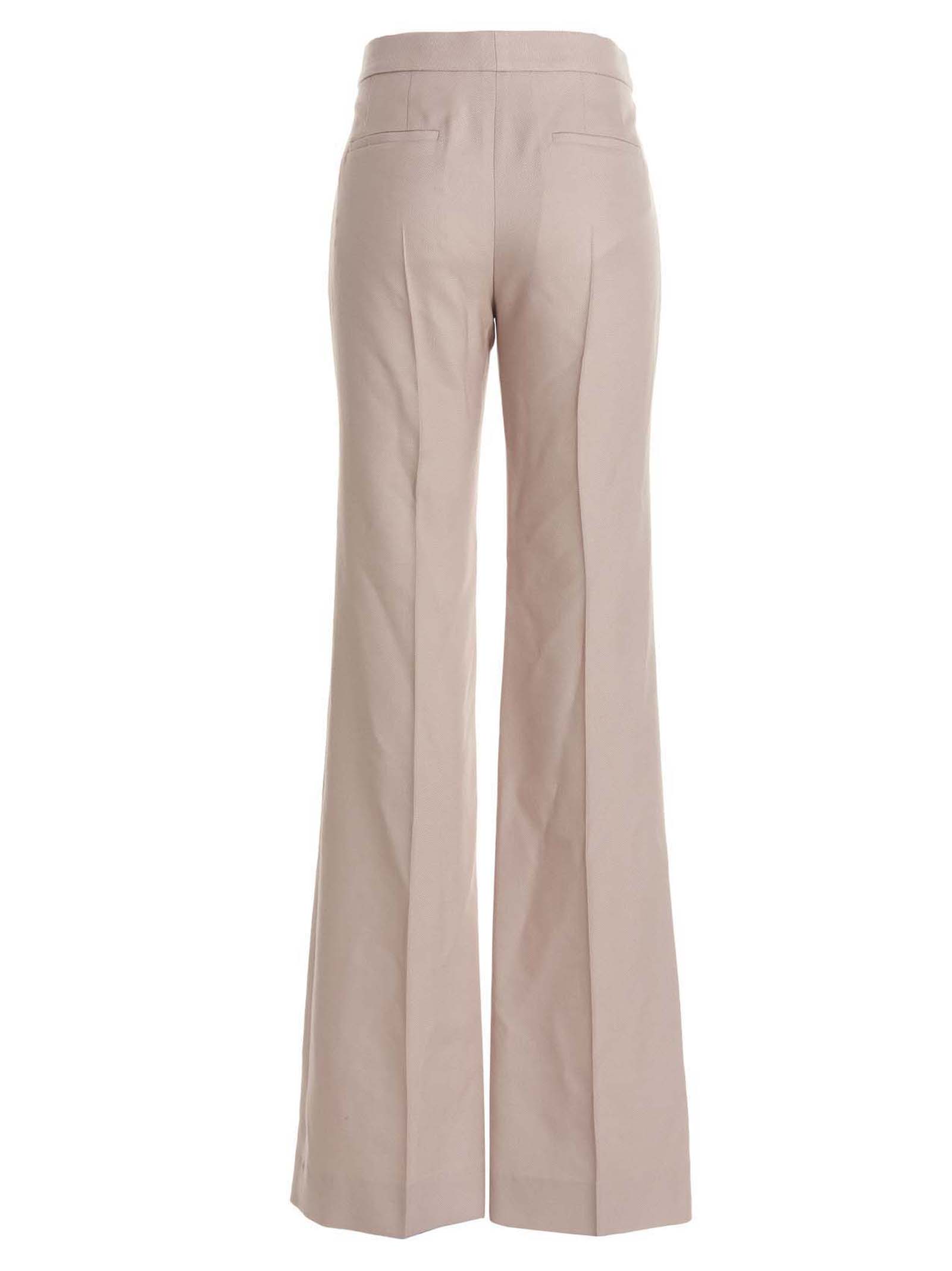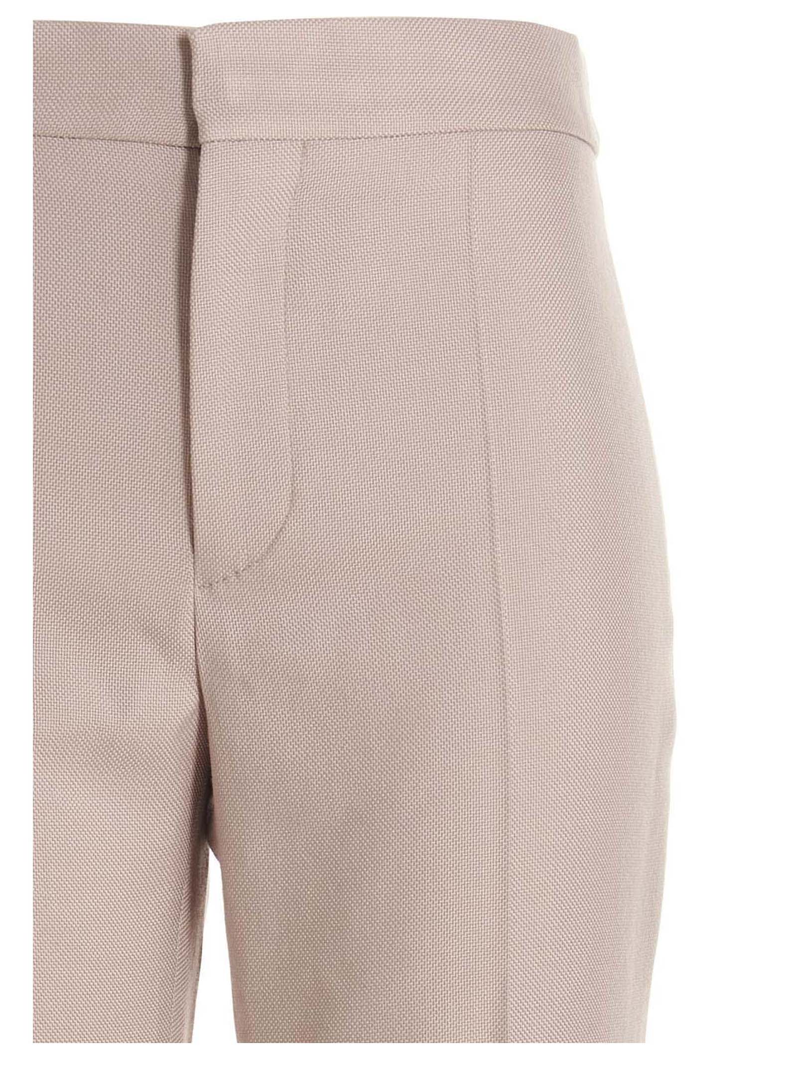 Pants in textured fabric, with a hook-and-eye, zip and button fastener, pockets, a straight leg with central pleat.