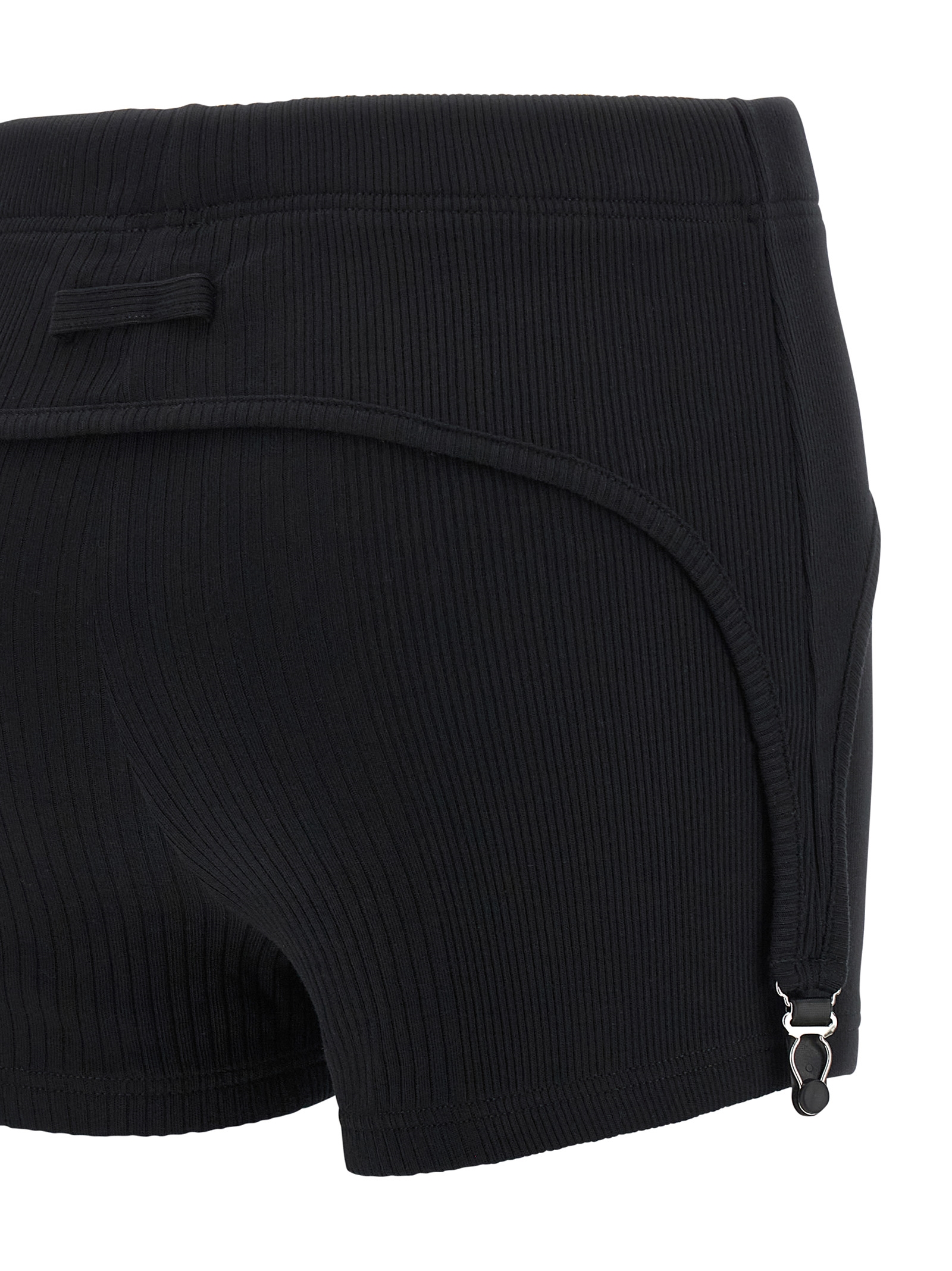 ‘The Black Garter’ ribbed stretch cotton shorts with front engraved logo tag, elastic waistband with garter details.