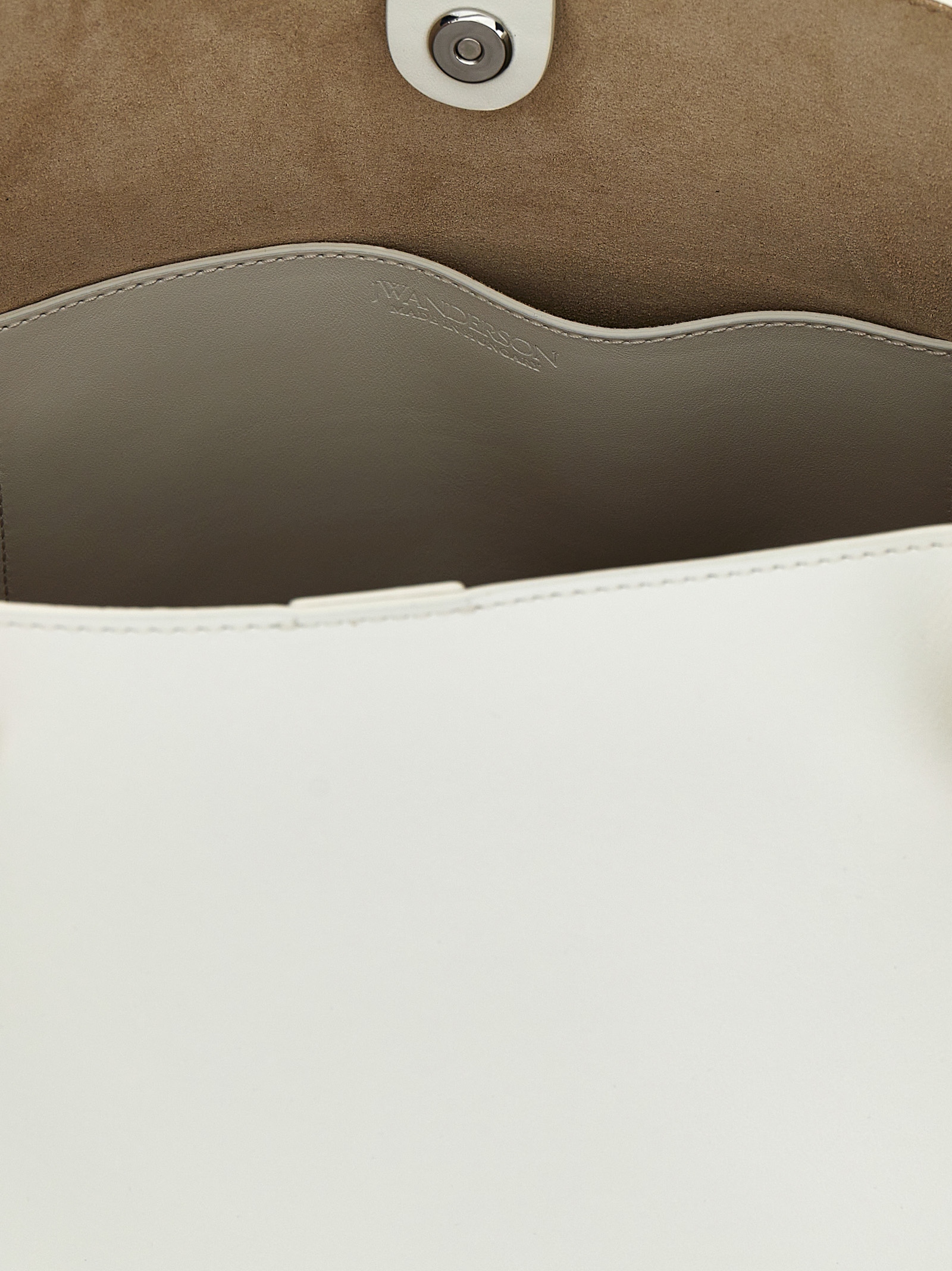 ‘The JWA Corner Bucket’ leather shopping bag with fixed handle with tone-on-tone chain detail, front embossed logo, magnetic closure.