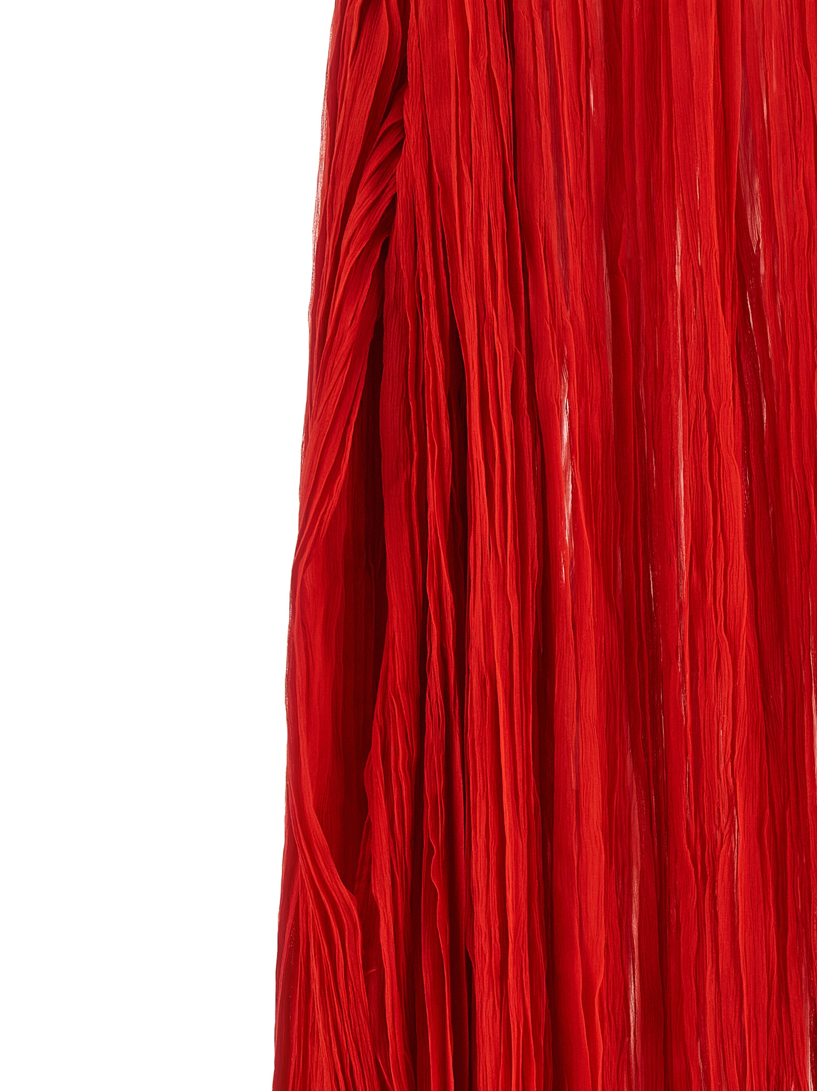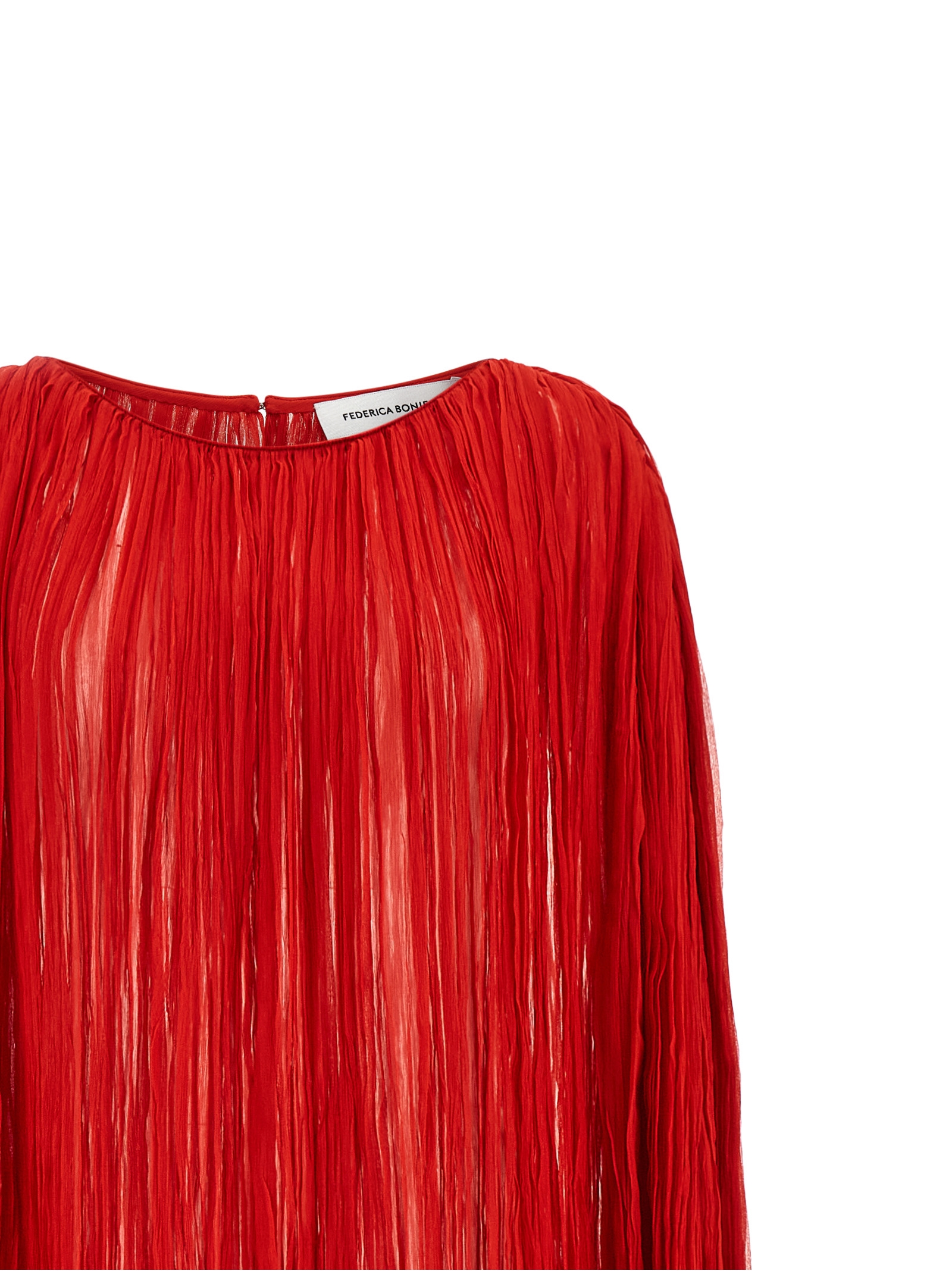 Long ‘The Pleated Dress Cape’ dress in wrinkled silk pleat, hood model with two-cut structure, round neckline, arm opening, back button closure with teardrop cut-out detail, side slits on the hem.