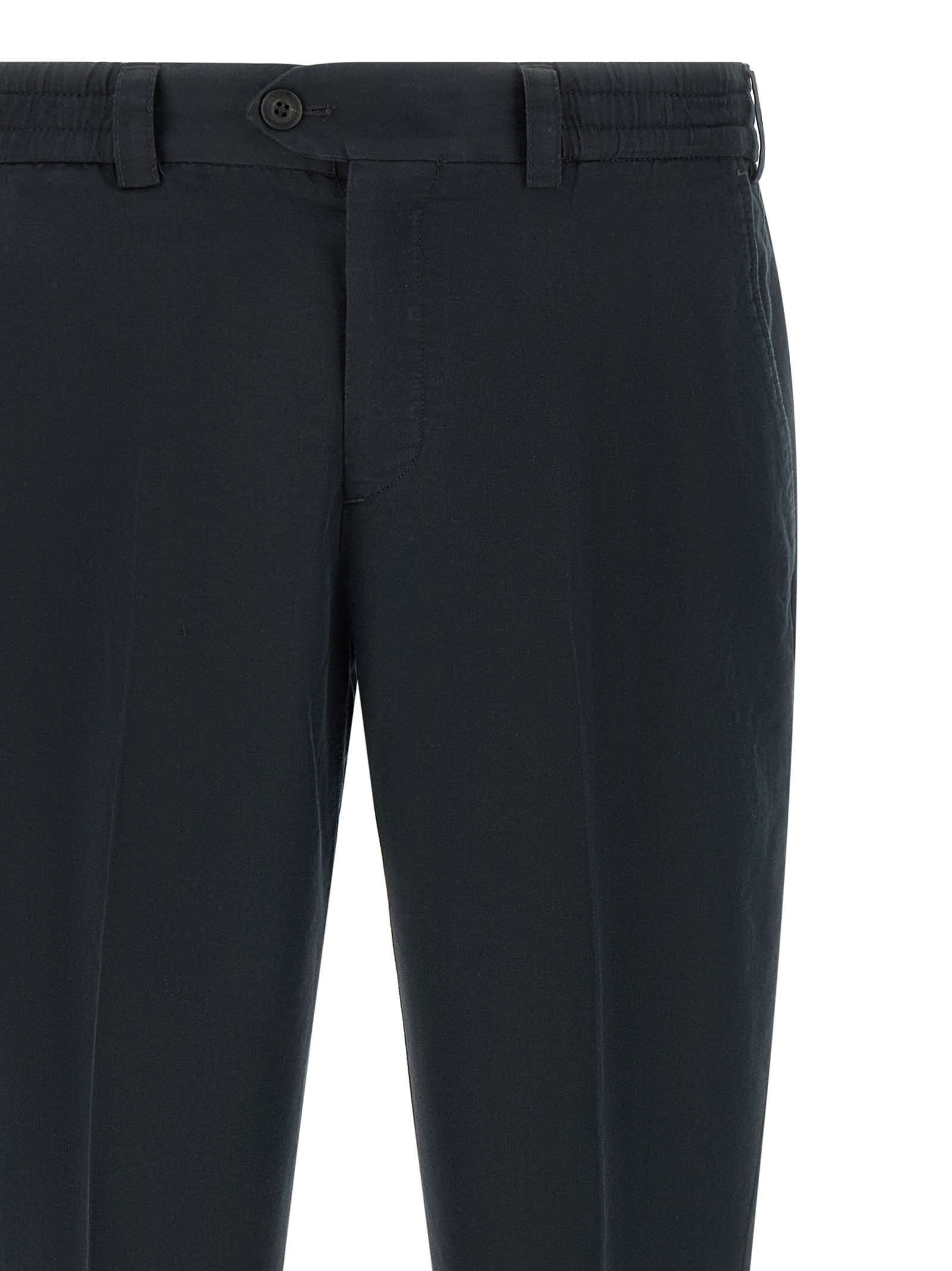 ‘The Rebel’ cotton and linen blend trousers, slightly carrot silhouette, ankle length, stretched crease, low waist, front button closure, elastic waistband, front French pockets, back welt pockets, turn-up hem.