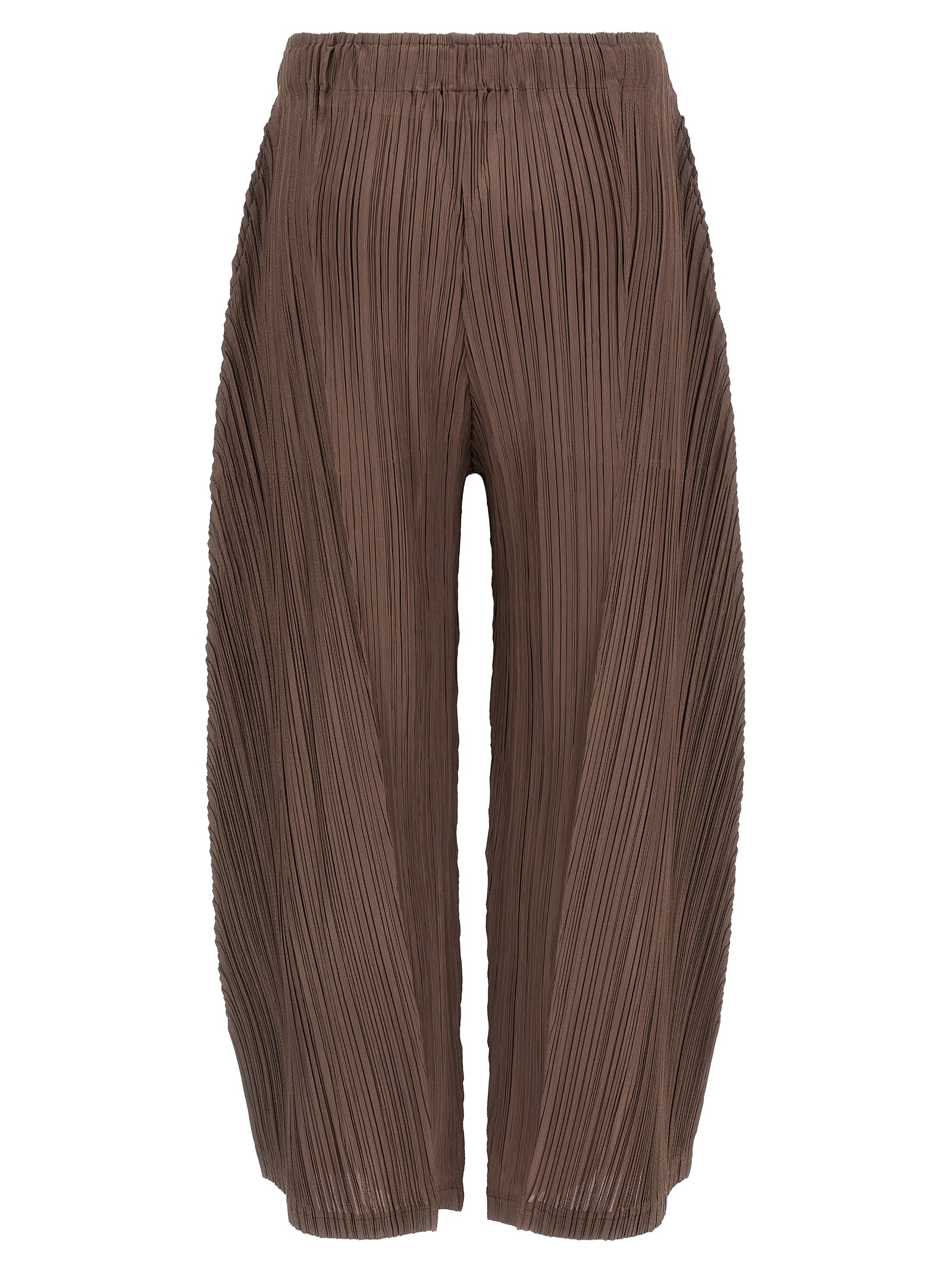 ‘Thicker Bottoms 2’ pleated fabric trousers, barrel silhouette, elastic waistband, pockets, split on the leg bottom, characterized by central pleats and a partial diagonal pleating created by folding the garment before subjecting it to the pleating process.