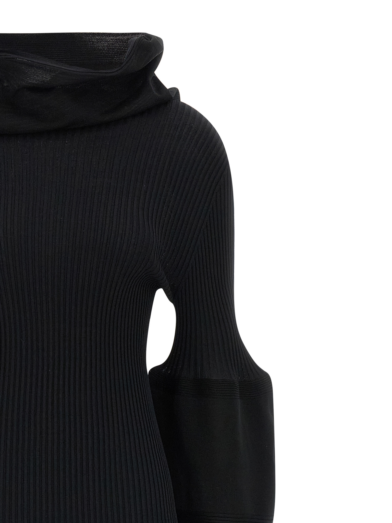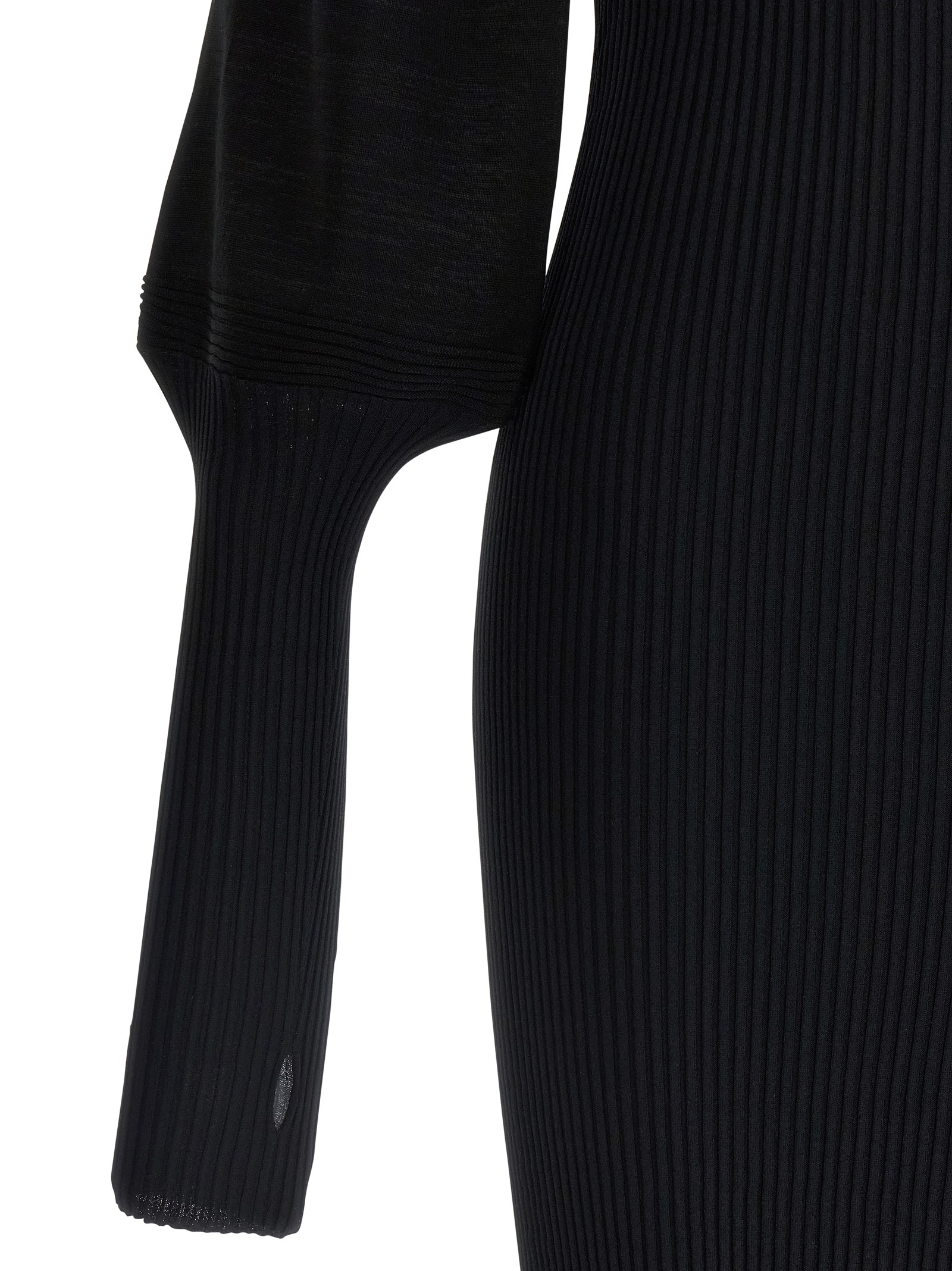 Long ‘Thin And Thick Knit’ knitted dress with fusion bonded yarns, long sleeves characterized by the contrast between voluminous and tight sections, draped high neck, sheath skirt.