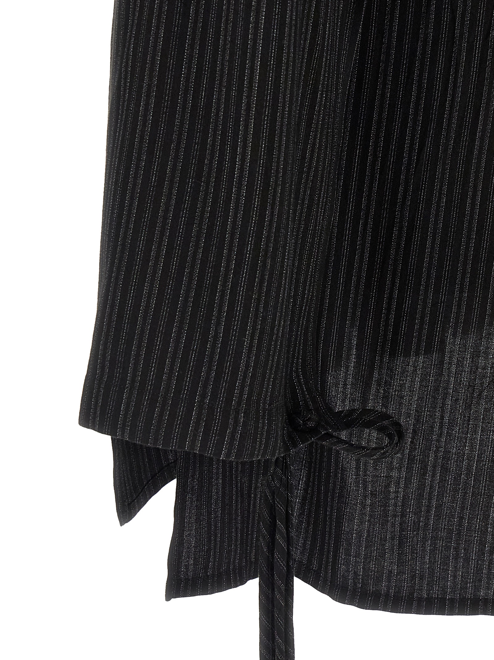 ‘Thin stripe’ jacket in lightweight fabric, unlined with thin stripe workmanship, narrow and rounded lapel neckline, front lace closure, back split and deep side slits, long sleeves with lacing on the cuffs.