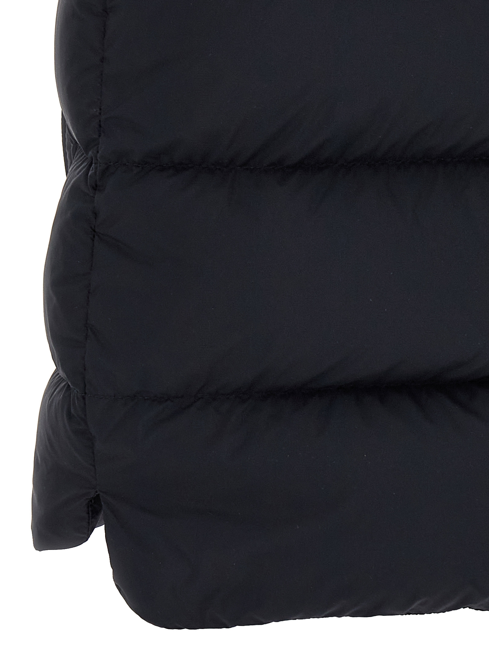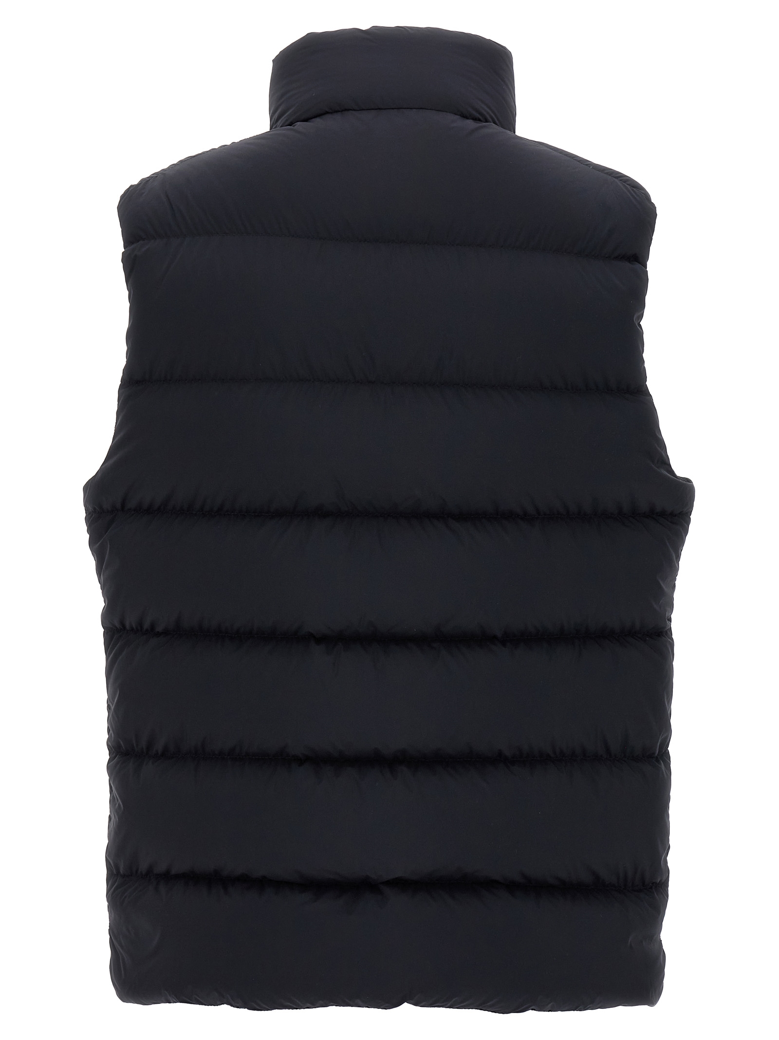 ‘Tibb’ longue vest saison goose down padding, felt logo patch and front zip and snap button closure, standing collar, pockets, side vents.