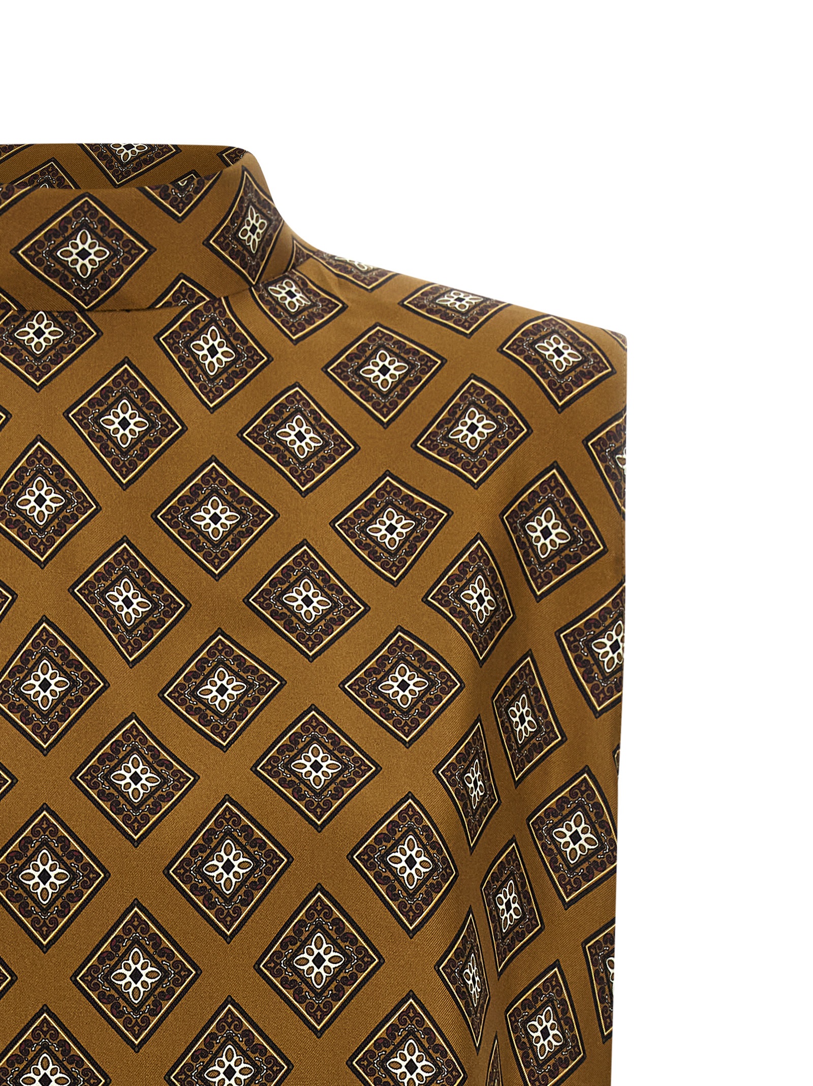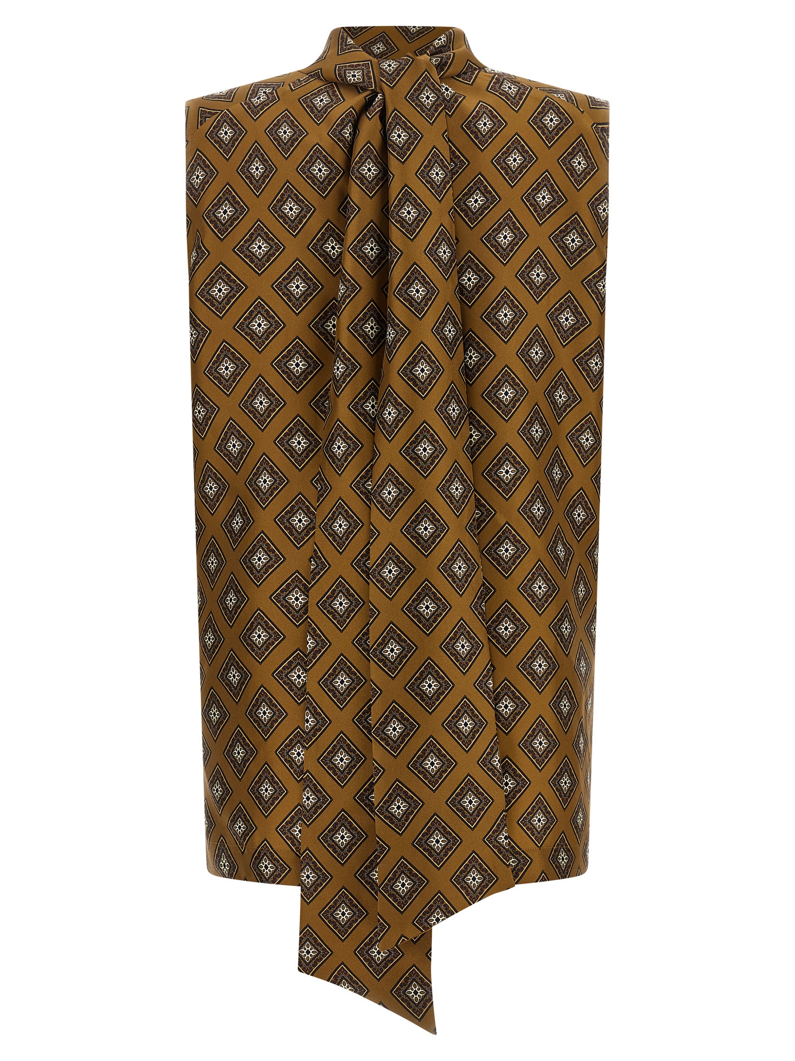 All-over tie-print silk twill top, lavallière high neck with back cut-out, wide side slits on the hem.