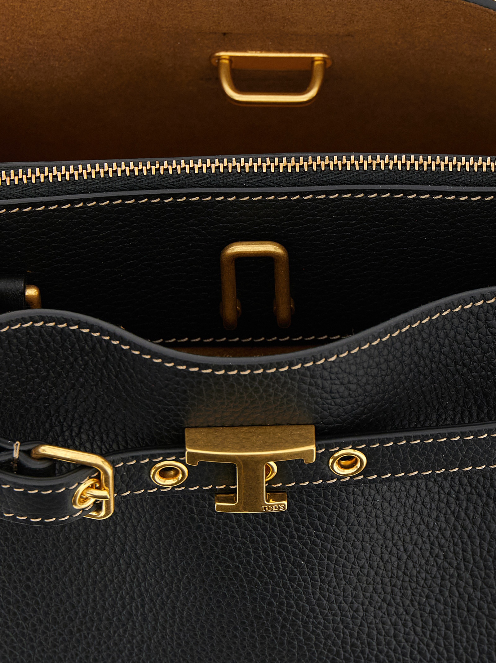 ‘Tim’ mini hammered calf leather handbag with two compartments separated by a central zip pocket, front metal ‘T Timeless’ buckle belt, fixed tubular handle, inner hook closure for both compartments, rigid base with metal feet, adjustable and removable shoulder strap.