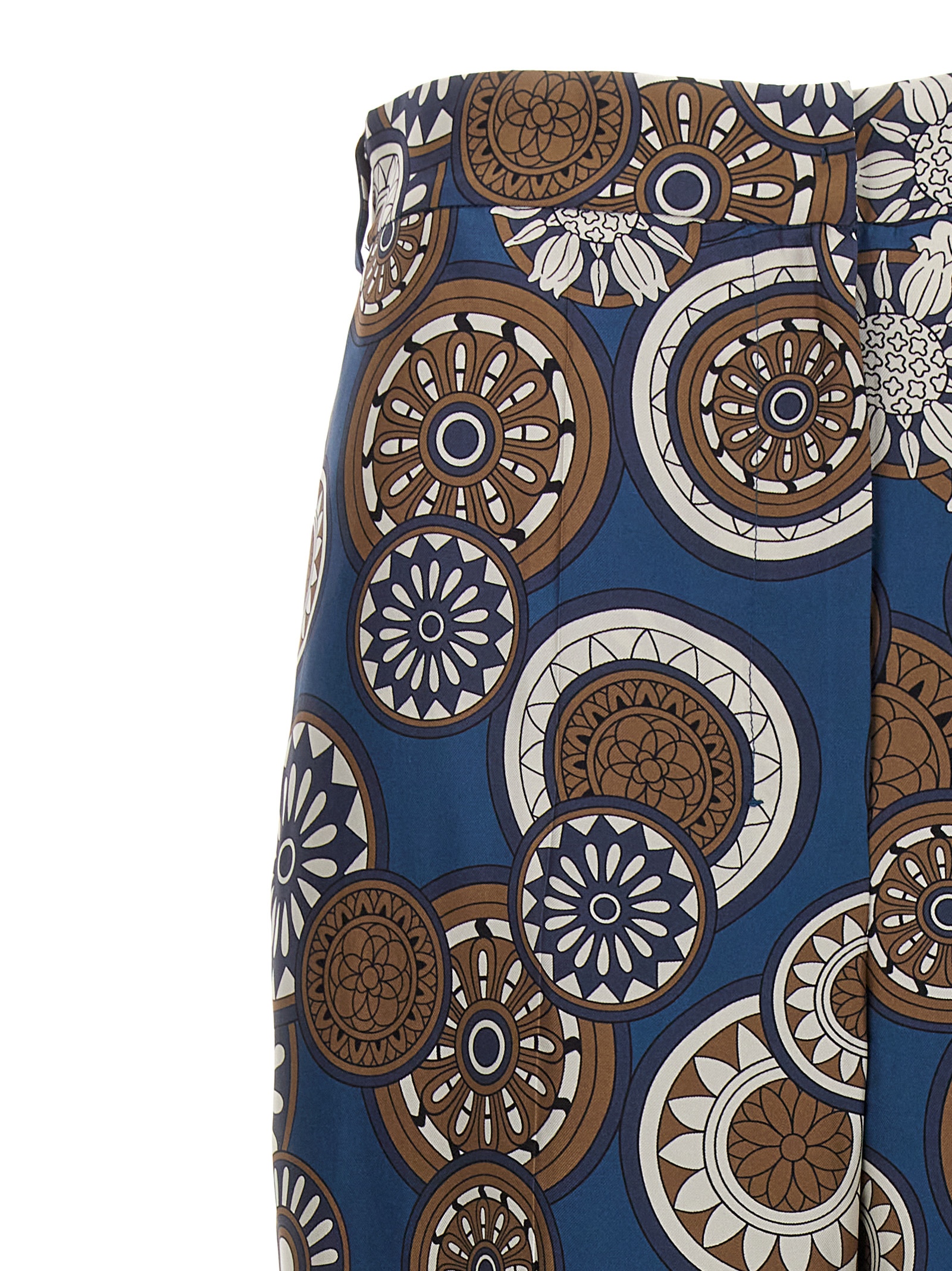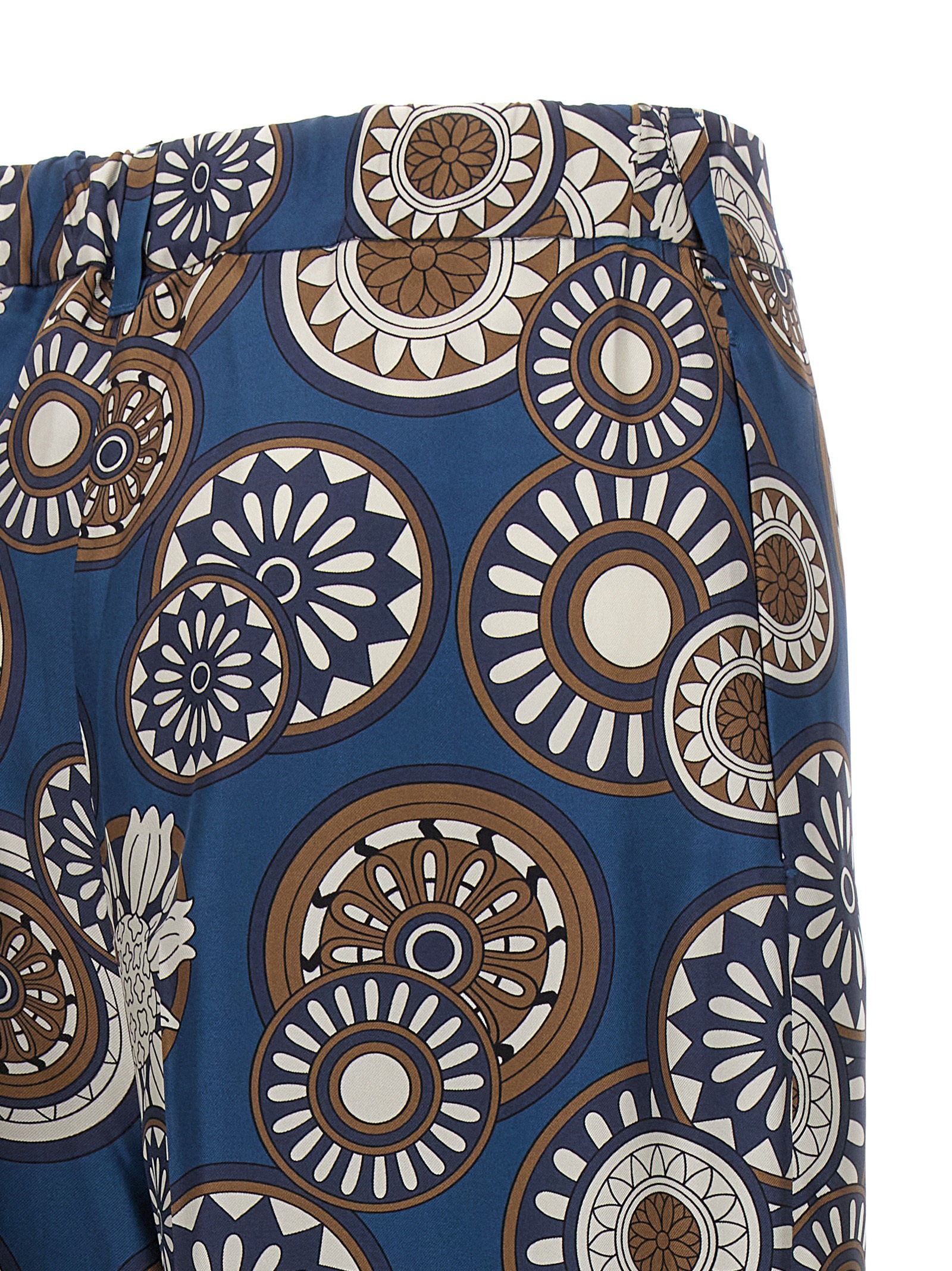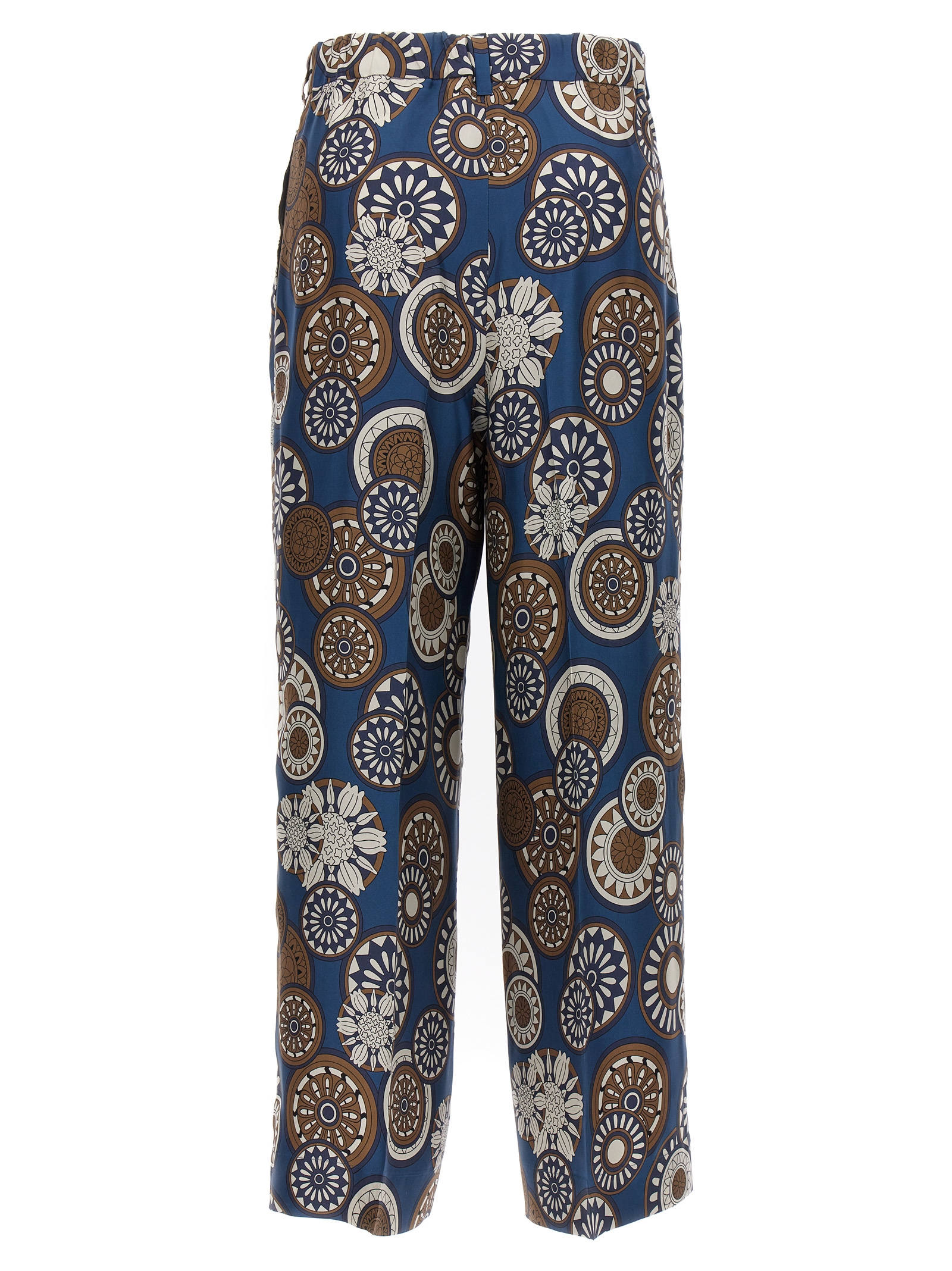 Timeb silk pants with all-over pattern, elastic waistband at the back, hook-and-eye zipper closure, pockets, and wide leg.