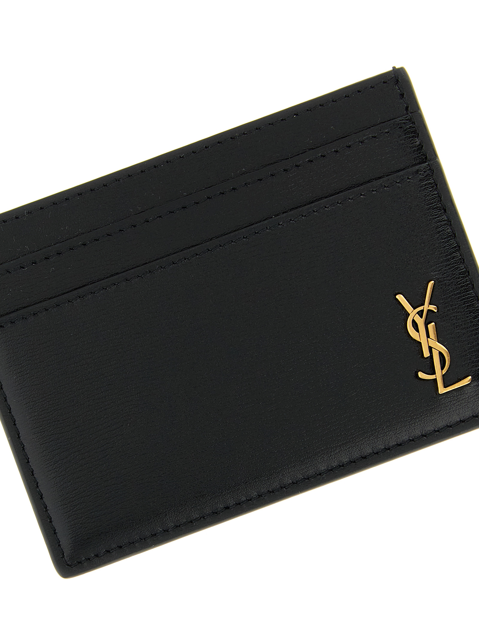 ‘Tiny Cassandre’ leather card holder with gold metal logo.