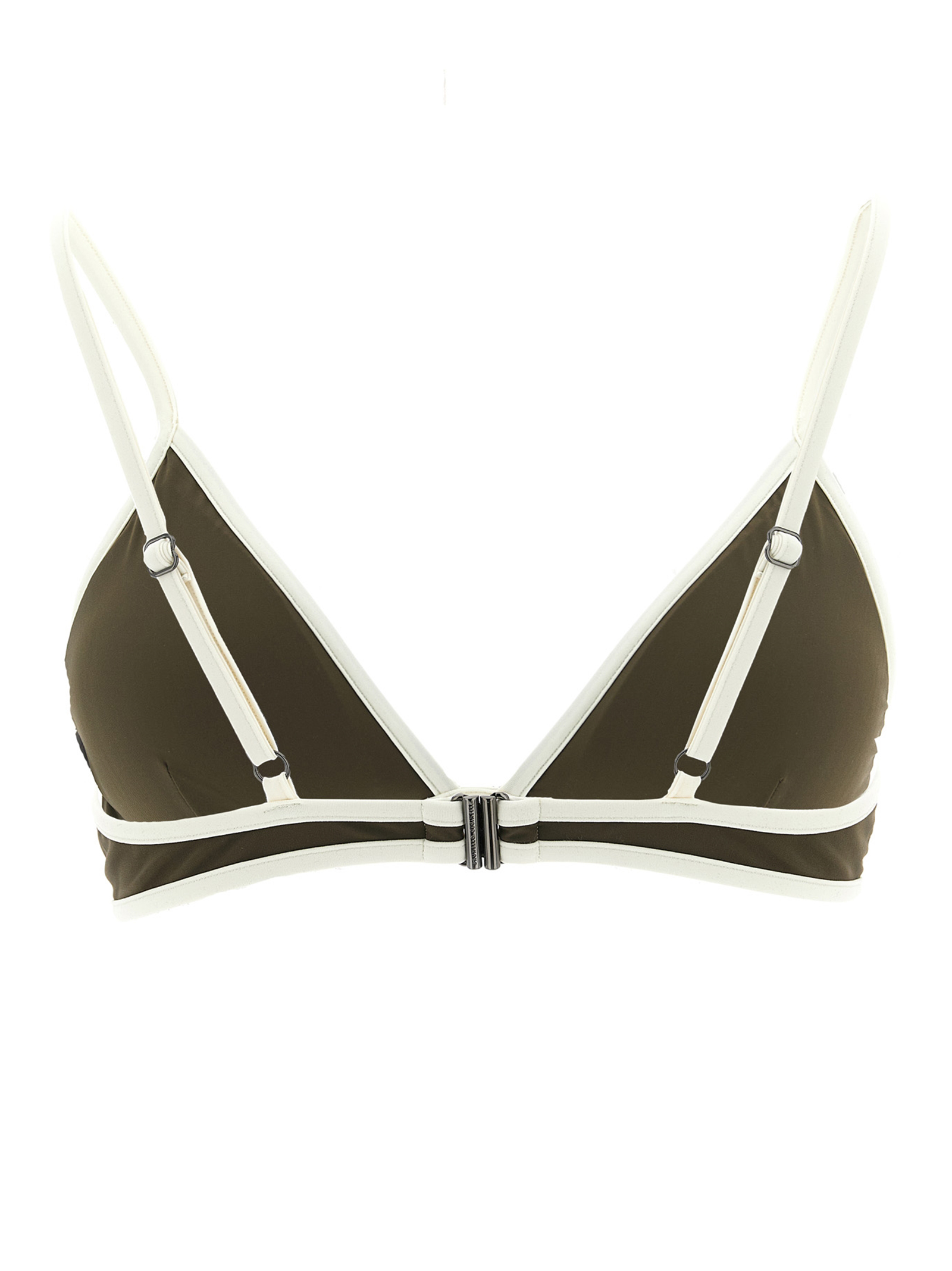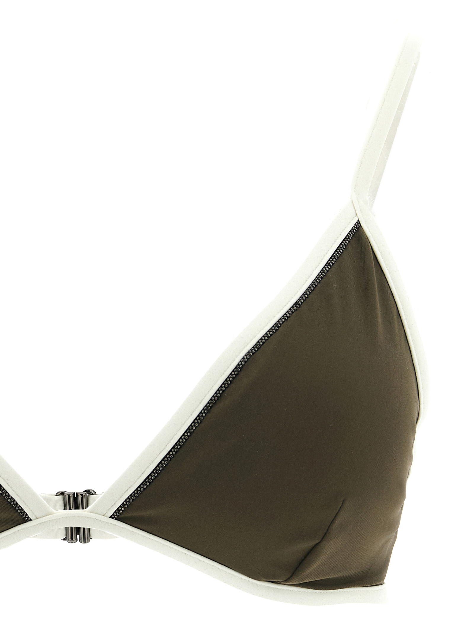 Triangle bikini top in techno jersey with contrasting piping with front ‘Monile’ detail, removable padded cups, adjustable shoulder straps, and back hook closure.
