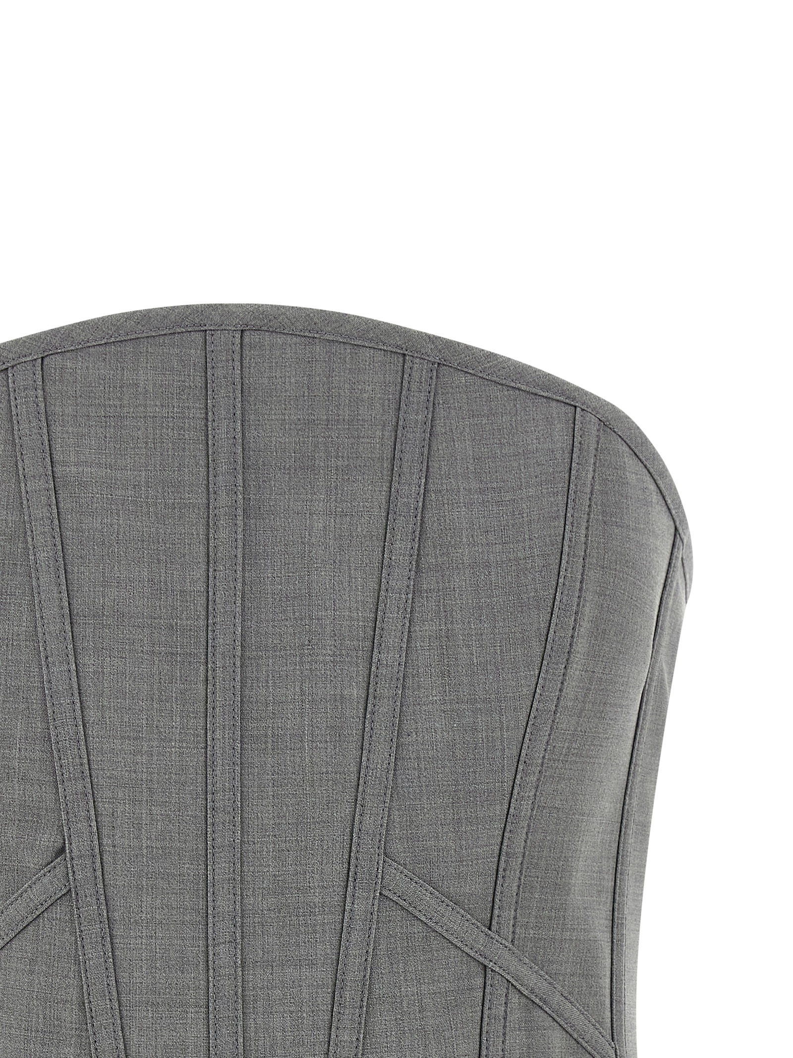 Cool mélange virgin wool top, off-the-shoulder bustier style with semi-rigid splints, back zip closure, and asymmetrical hem.