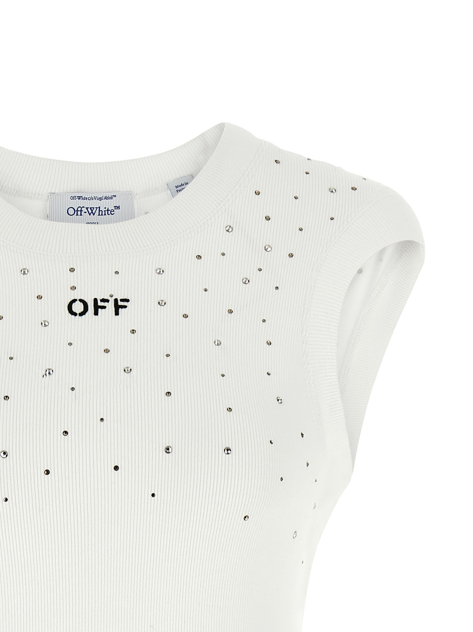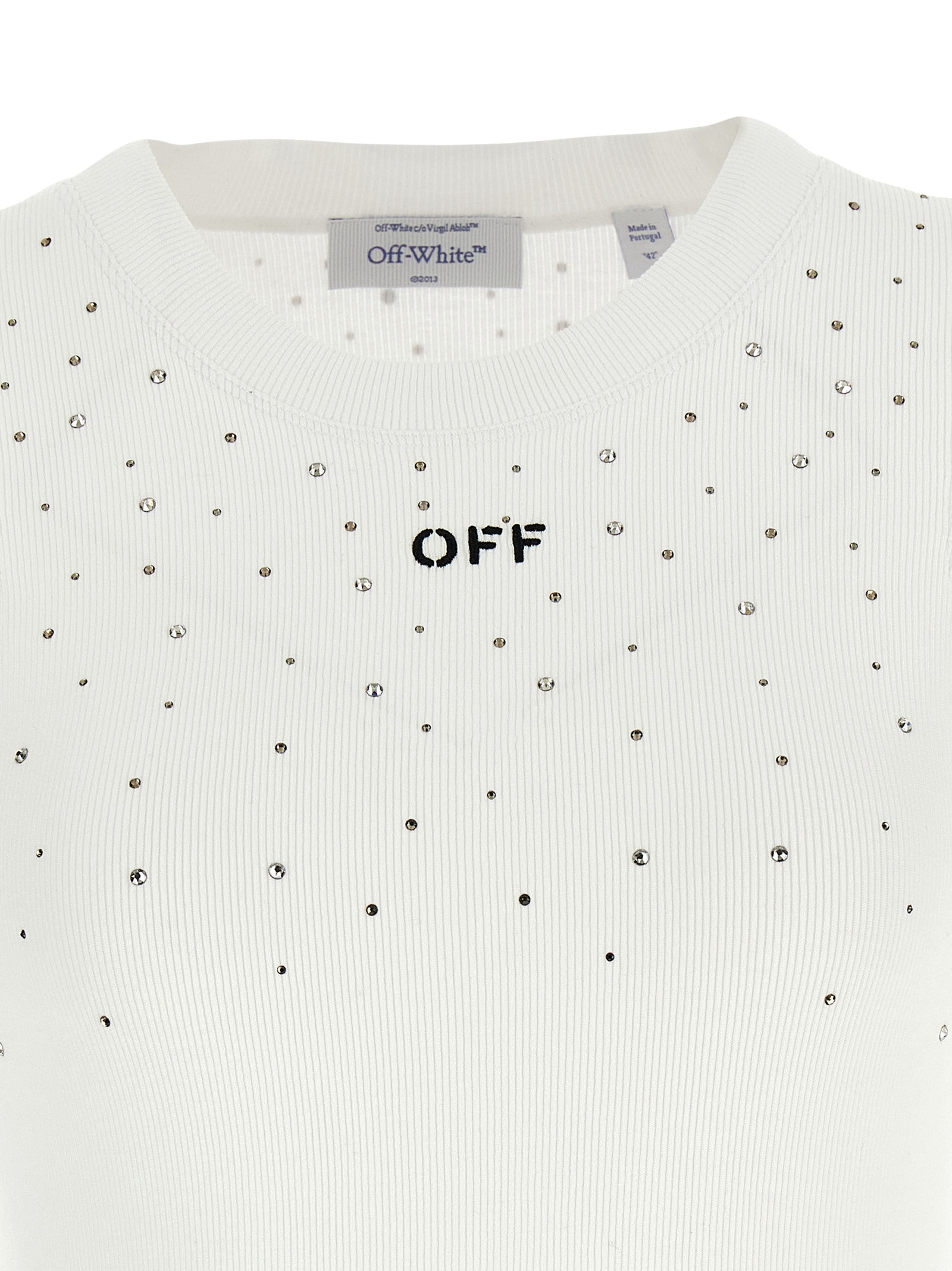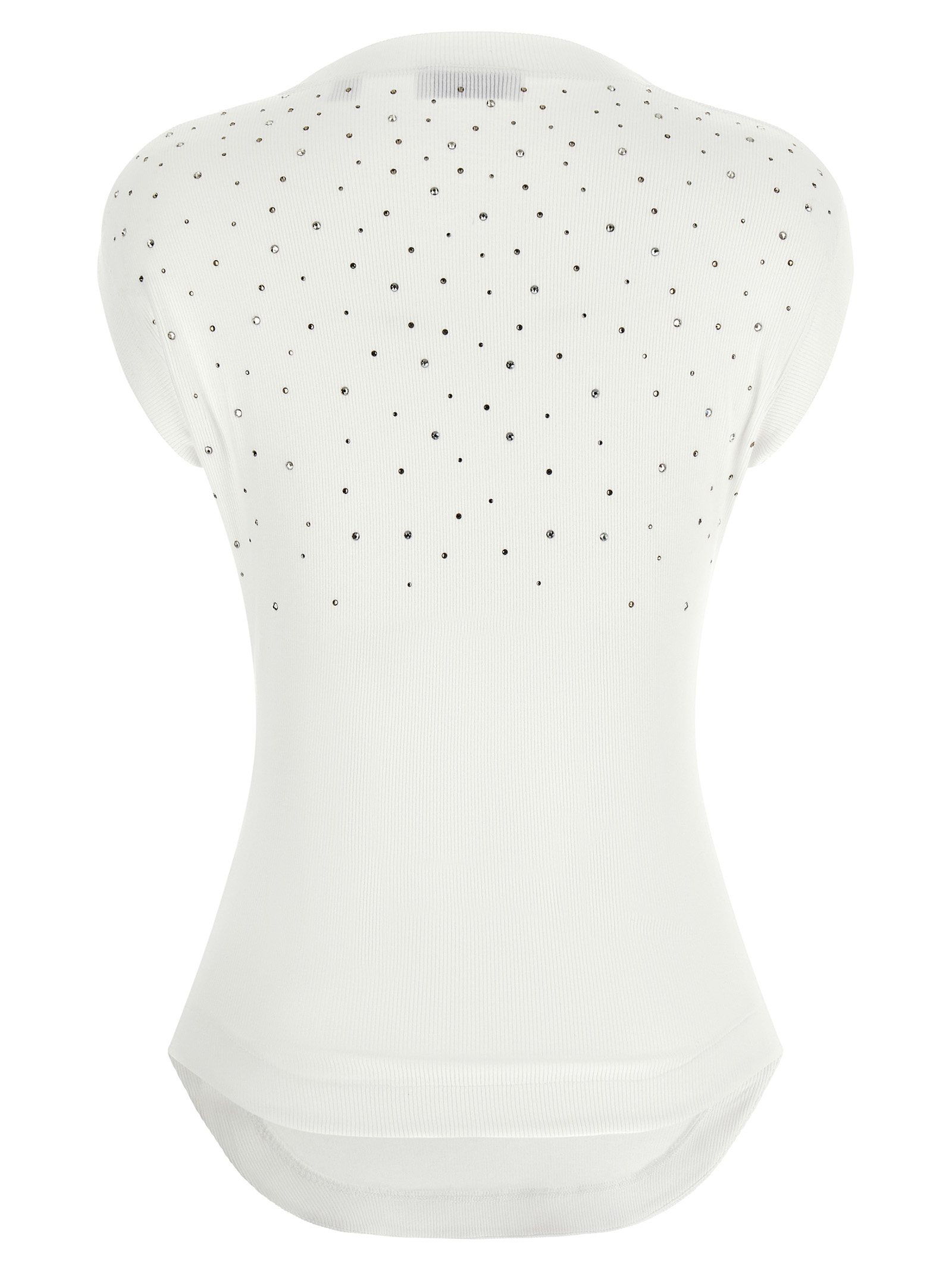 Ribbed stretch viscose jersey top with Swarowski application on the front and back, crew neck, rounded and asymmetrical hem.