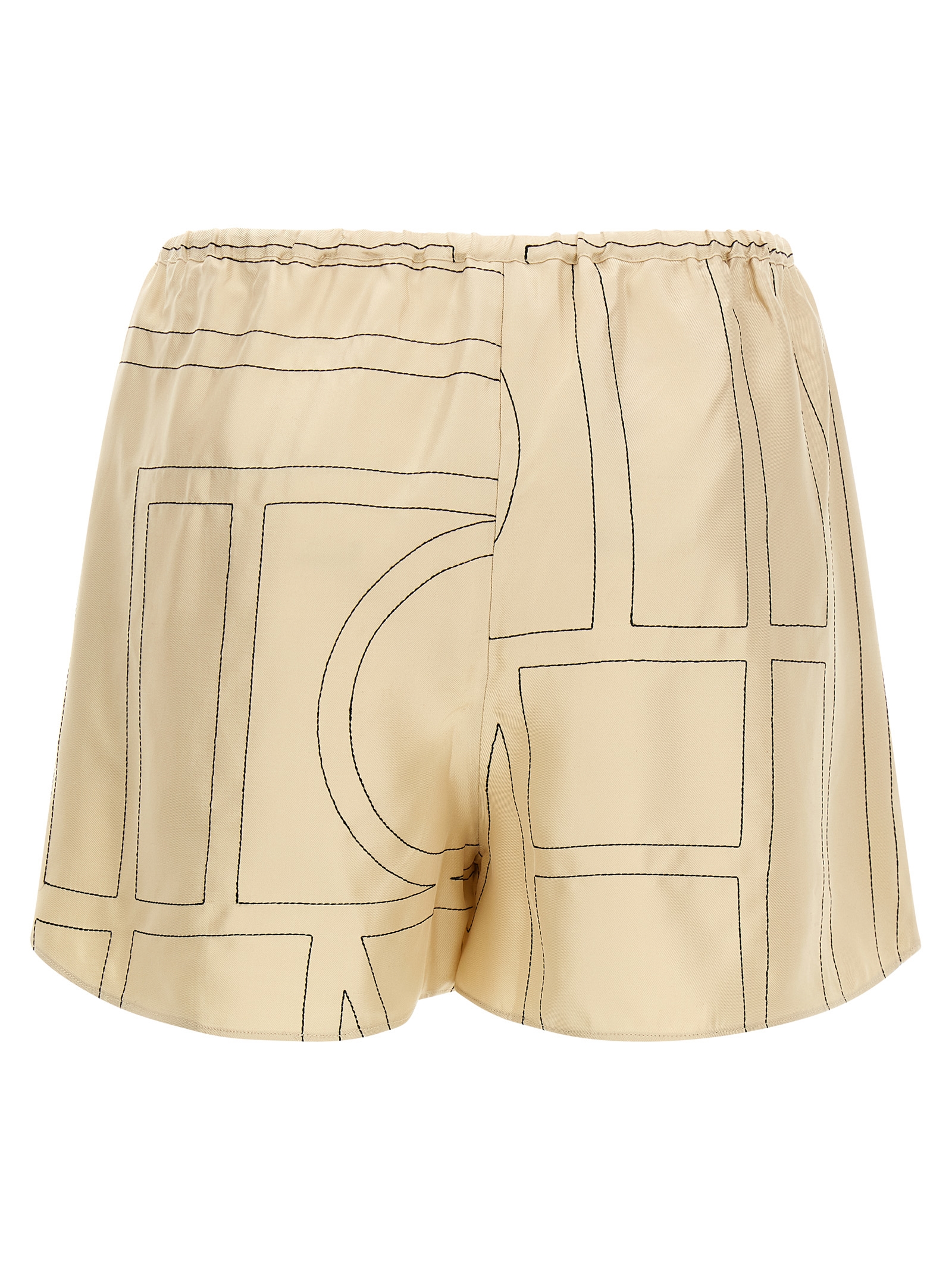 ‘Toteme’ short in medium-weight silk twill embroidered with contrast black thread monogram pattern, pajama model, elastic waistband, pockets.