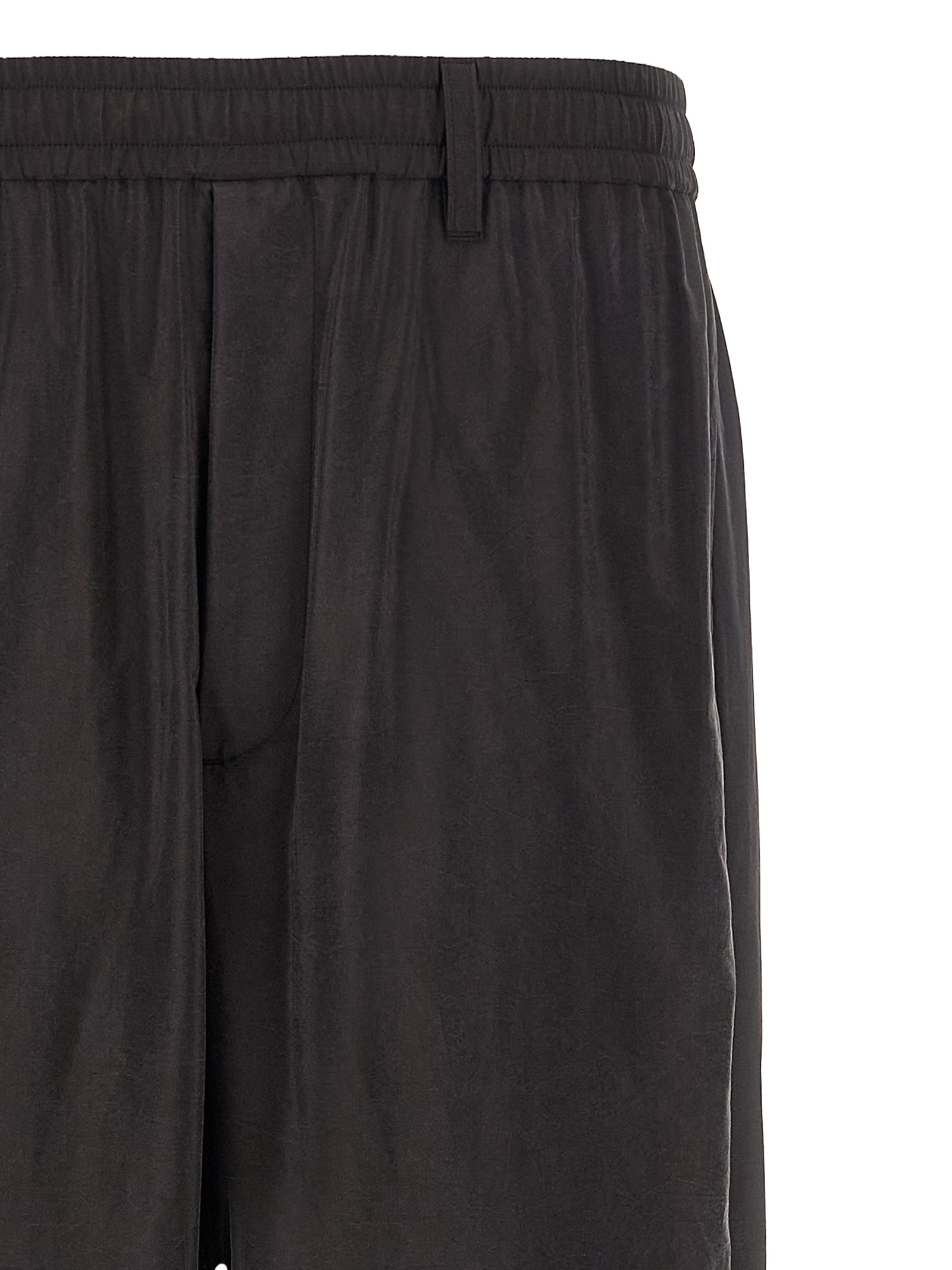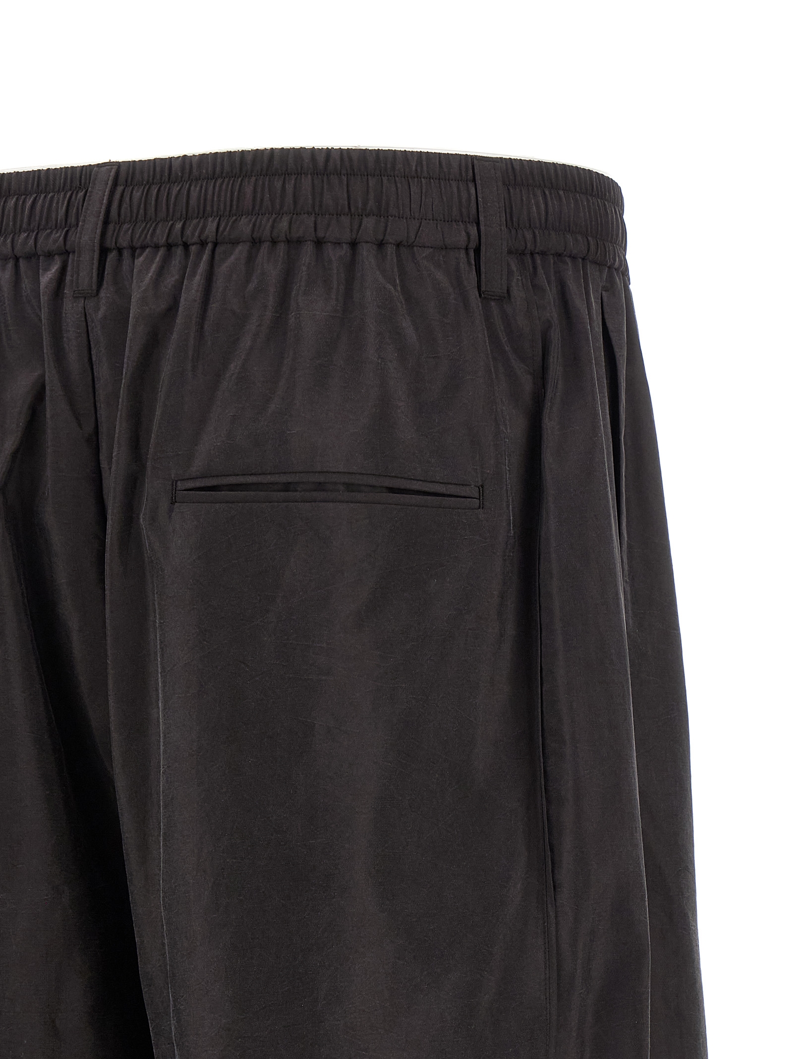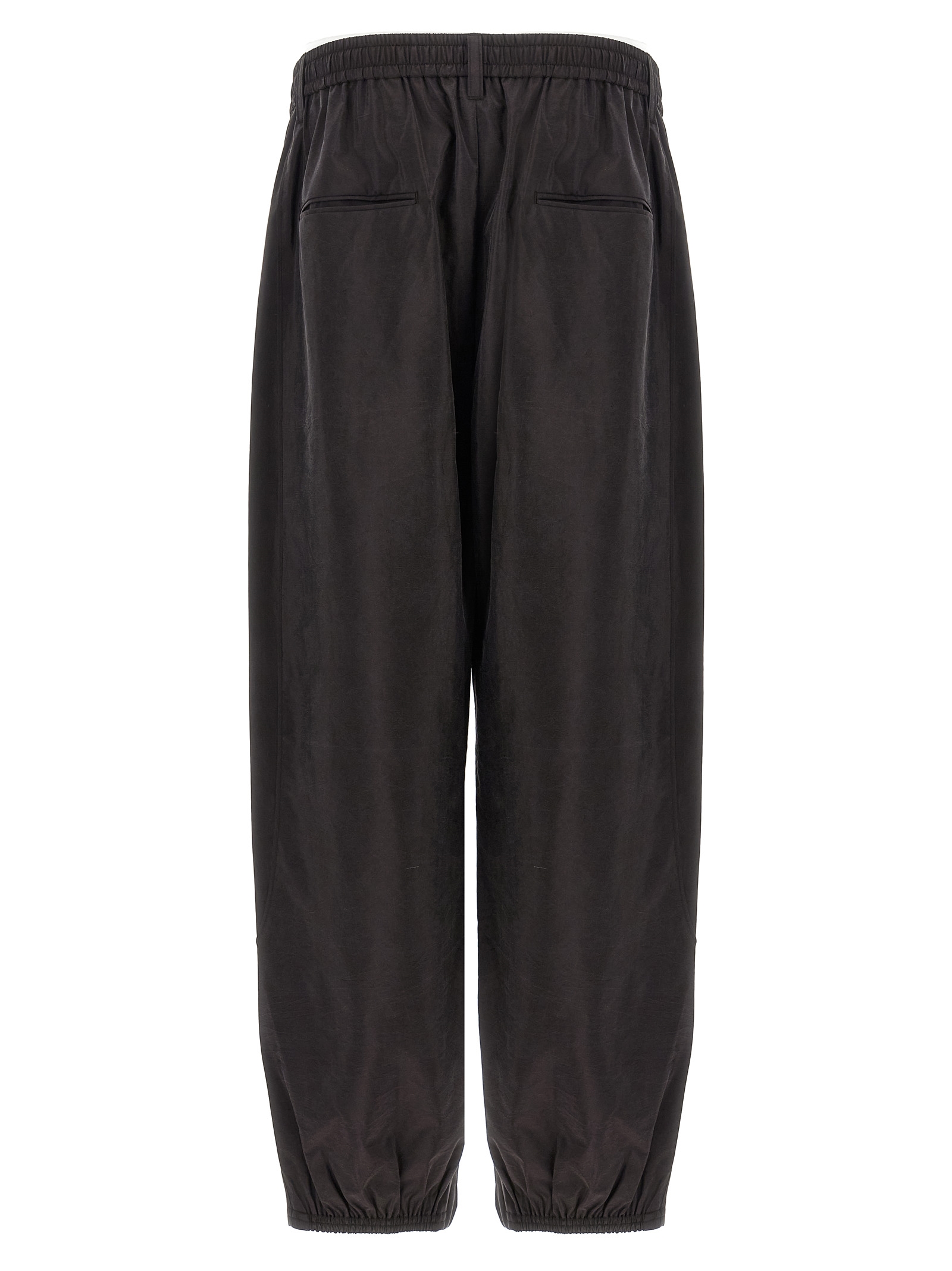 ‘Track’ wrinkled shiny silk and nylon blend trousers, wide tapered leg, drawstring elastic waistband, zip flap, front French pockets, back welt pockets, elastic and zip on the leg bottom.