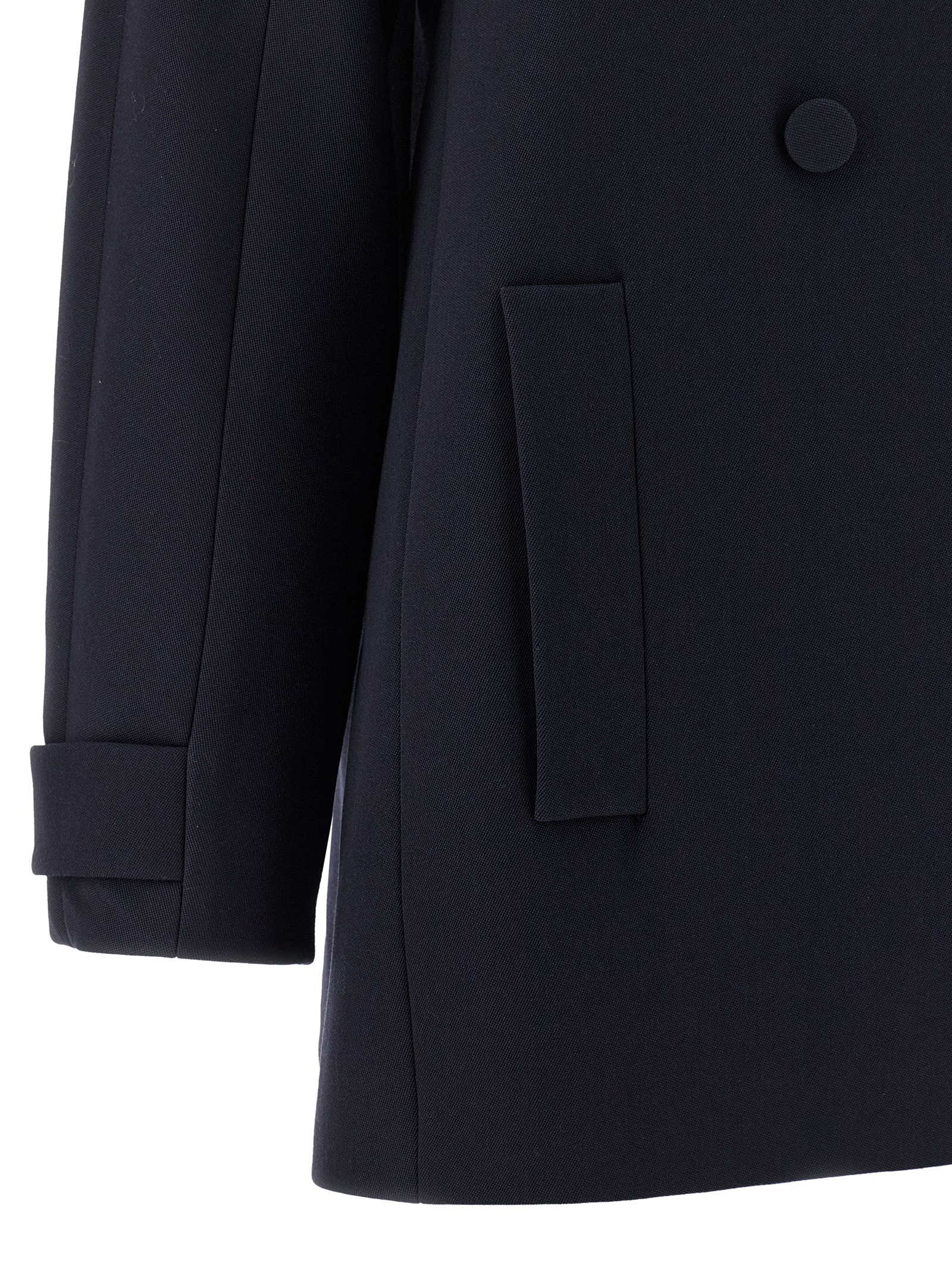 Wool coat, slightly padded monogram cupro lining, trapeze silhouette, double-breasted style with front button closure, shirt collar, long cuffed sleeves.