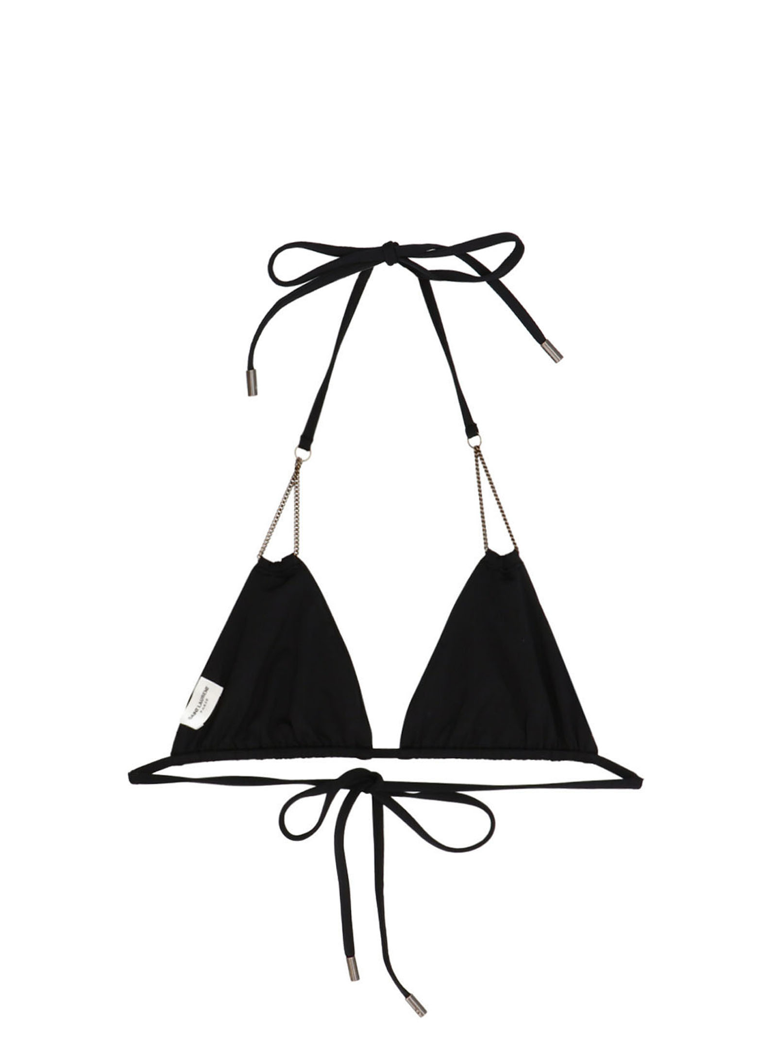 Triangle bikini top with pony neck with chain details on the shoulders and adjustable laces.