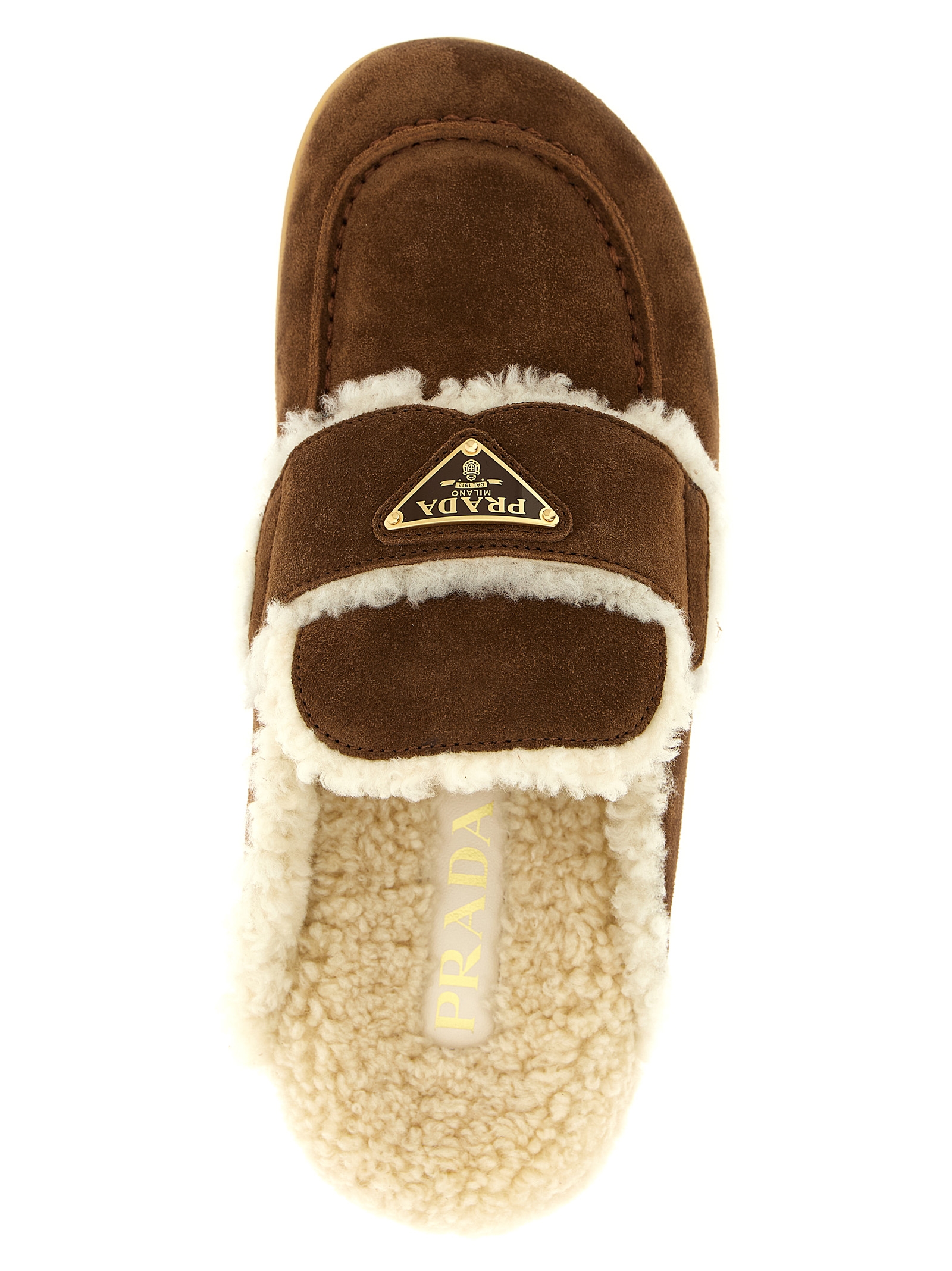 Suede sabots, shering lining, front enameled metal triangle logo, rubber sole.