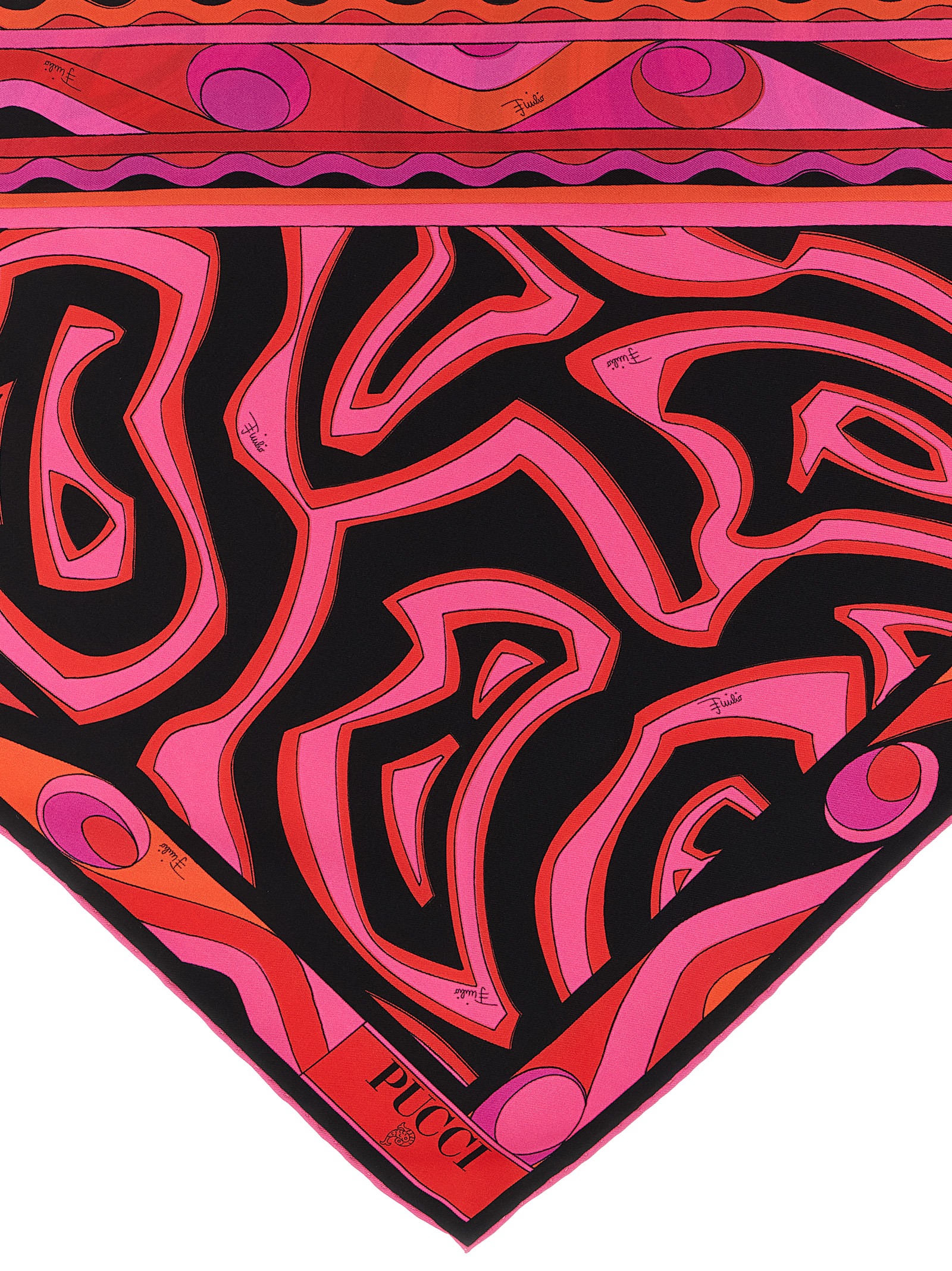 Printed silk twill scarf with a mix of Pucci prints, triangle design with band to tie as desired.