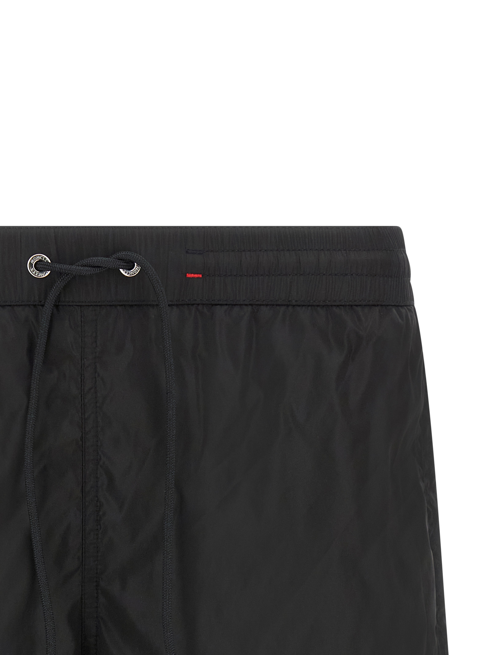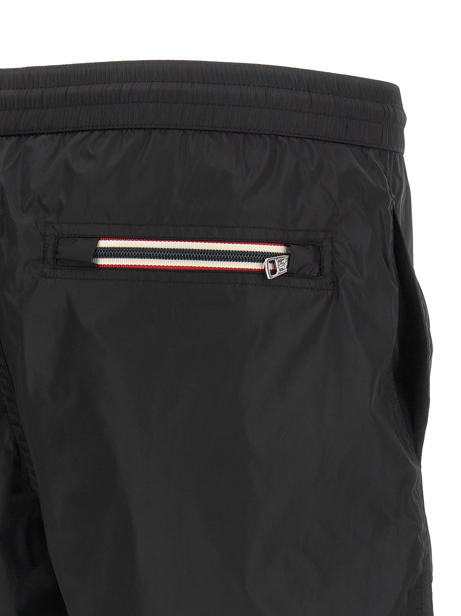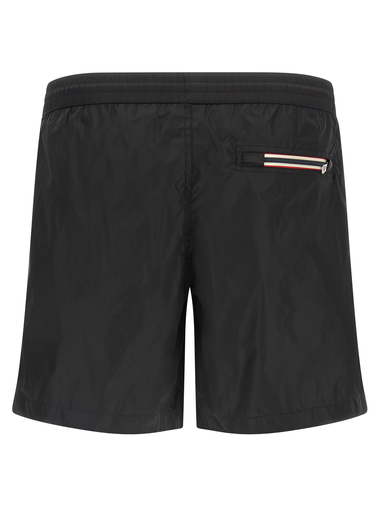 Technical nylon swimsuit, front tricolor logo patch, drawstring elastic waistband, pockets, inner mesh briefs.