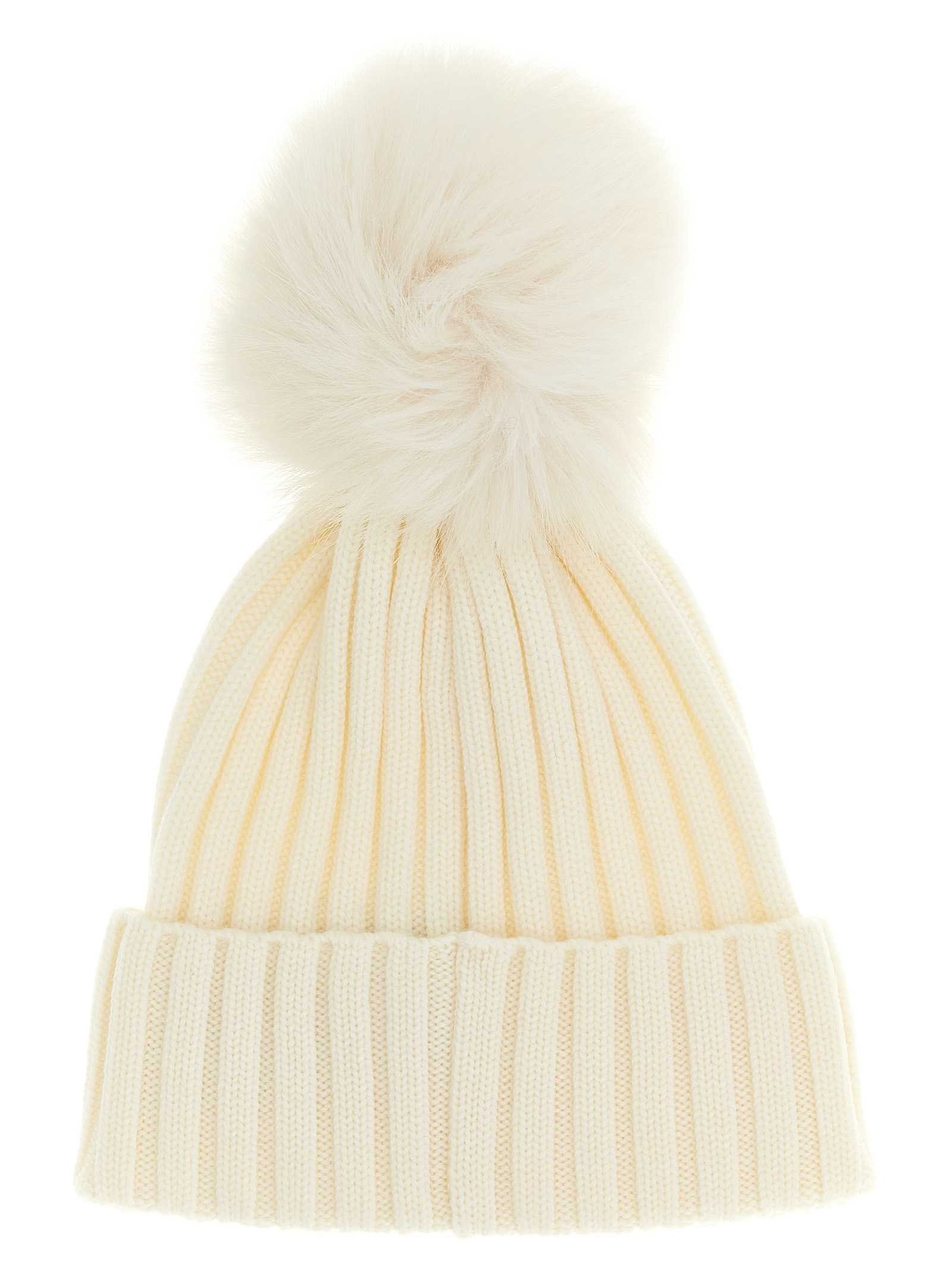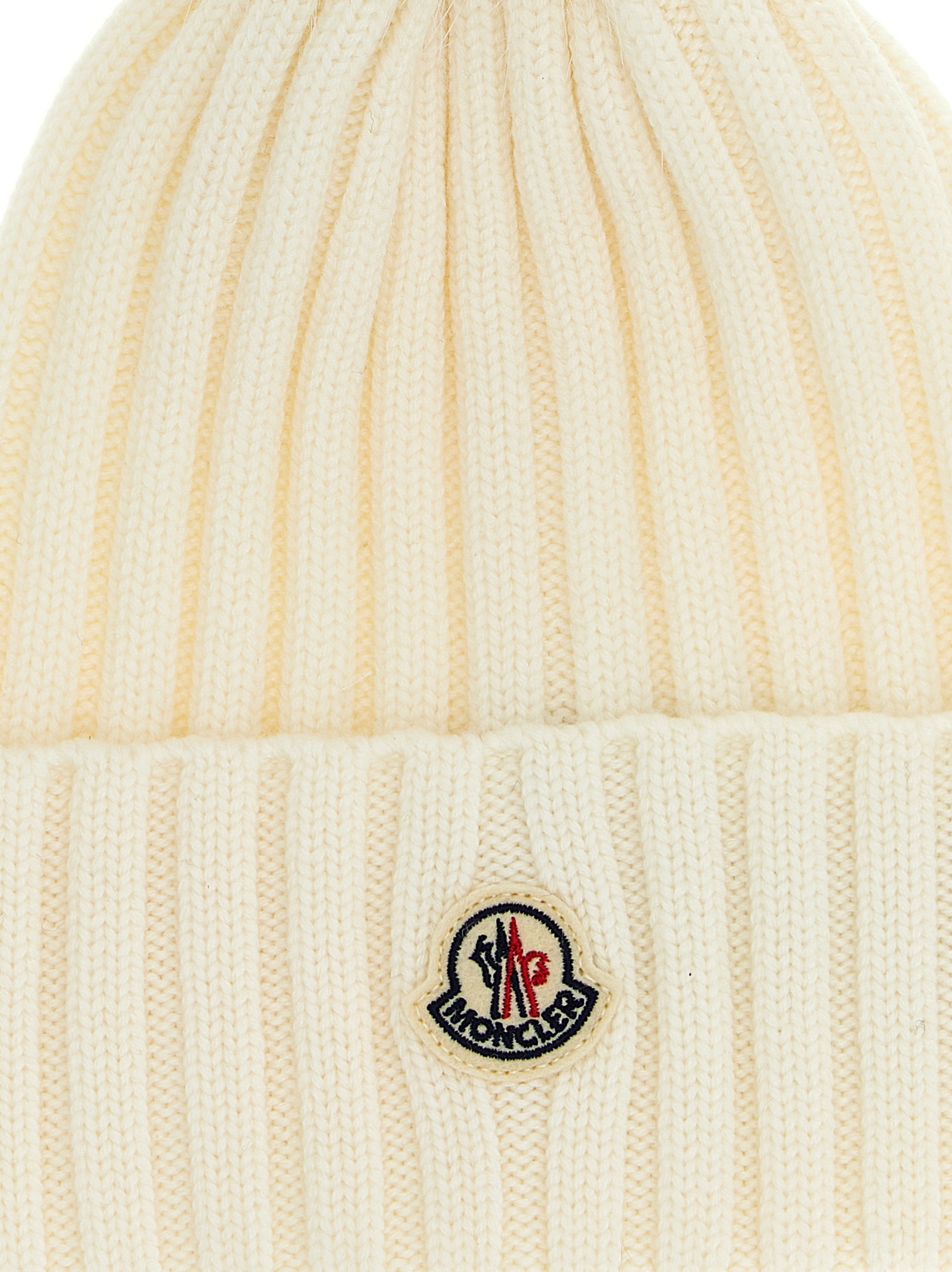 ‘Tricot’ ribbed wool beanie, front logo detail, fur pompom pom.