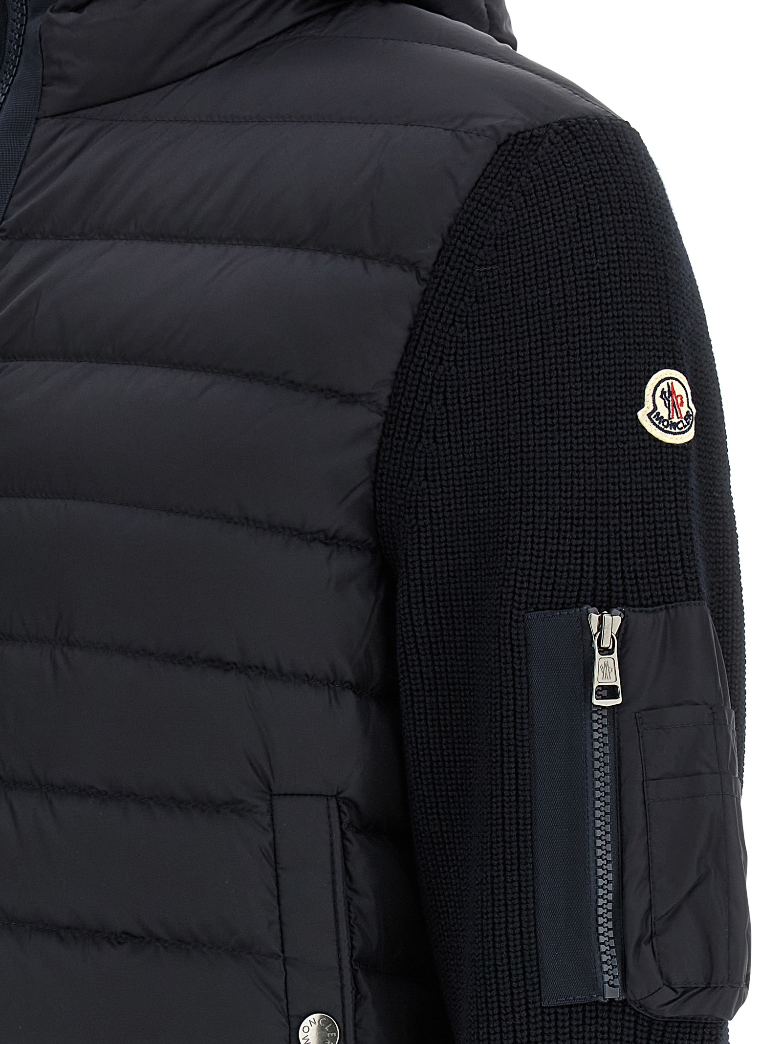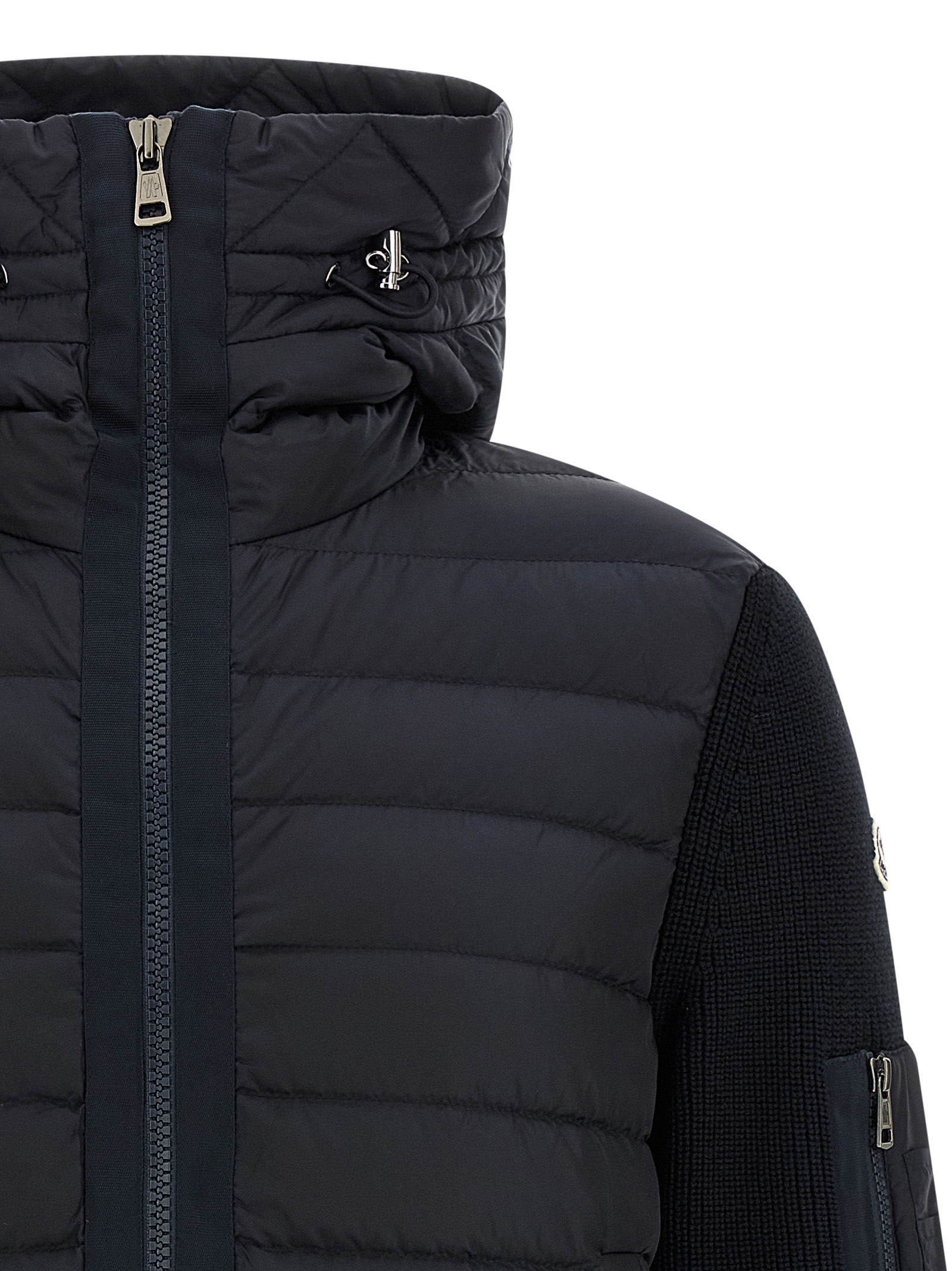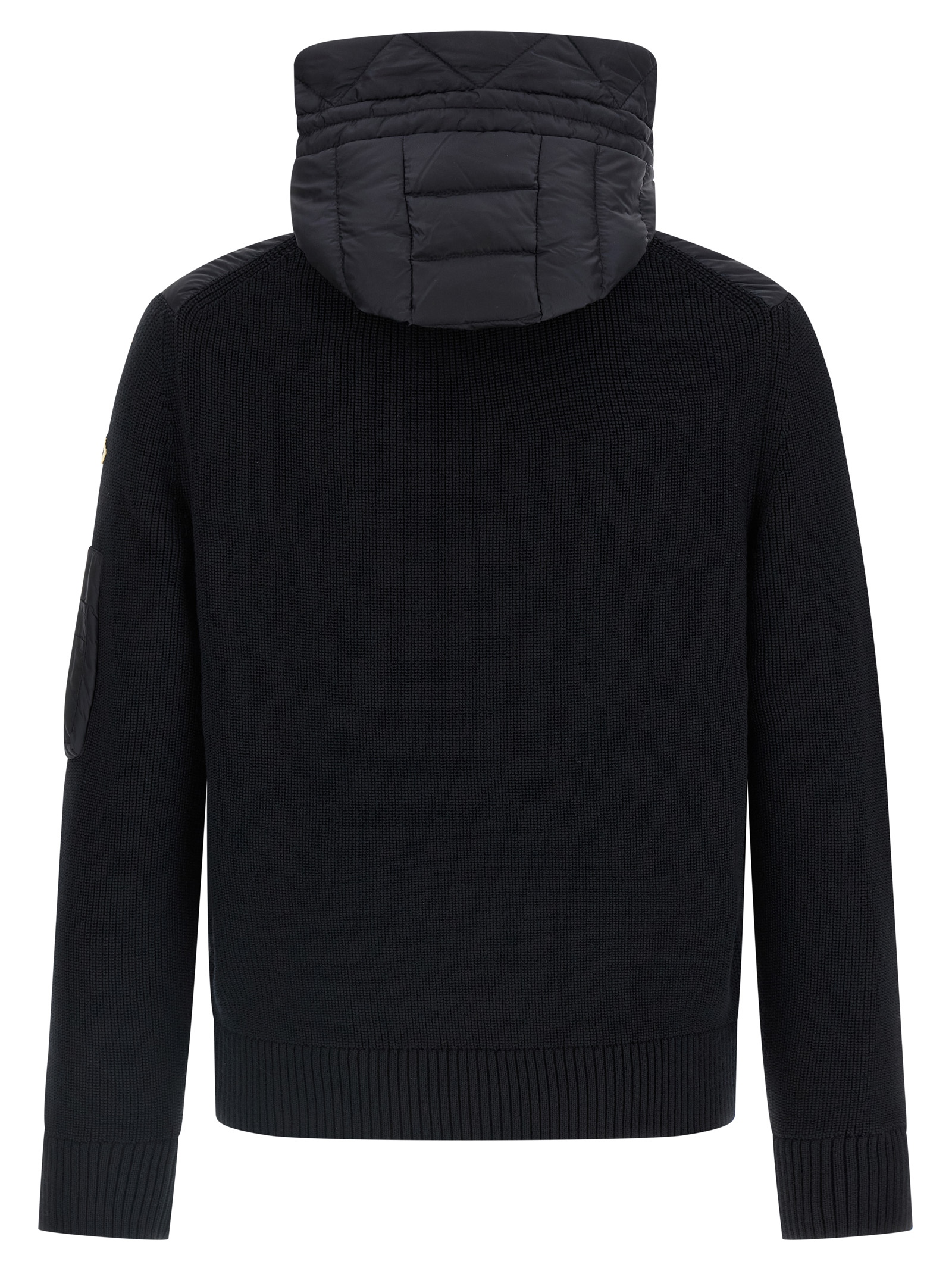 Finezza 7 wool blend cardigan crafted in six-row stitching, quilted and slightly goose feather padded nylon front, adjustable hood, front zip closure, pockets, long sleeves with felt logo patch and cuff.