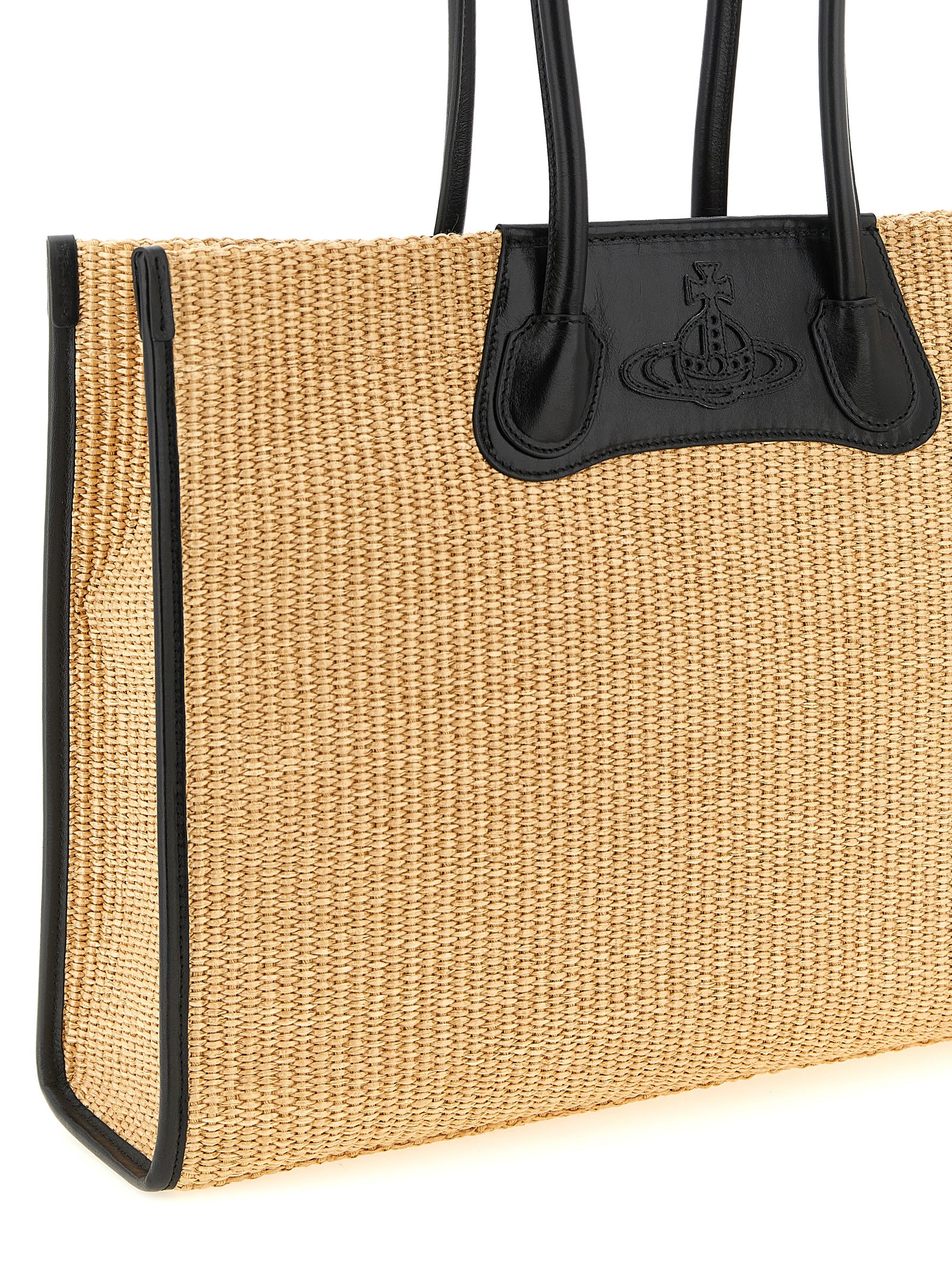 Braided raffia Troy shopping bag with smooth leather details, inner magnetic flap closure, tone-on-tone ‘Line Orb’ logo patch on the front, double fixed tubular handle, rigid base with metal feet, cotton canvas lining, one inside pocket.