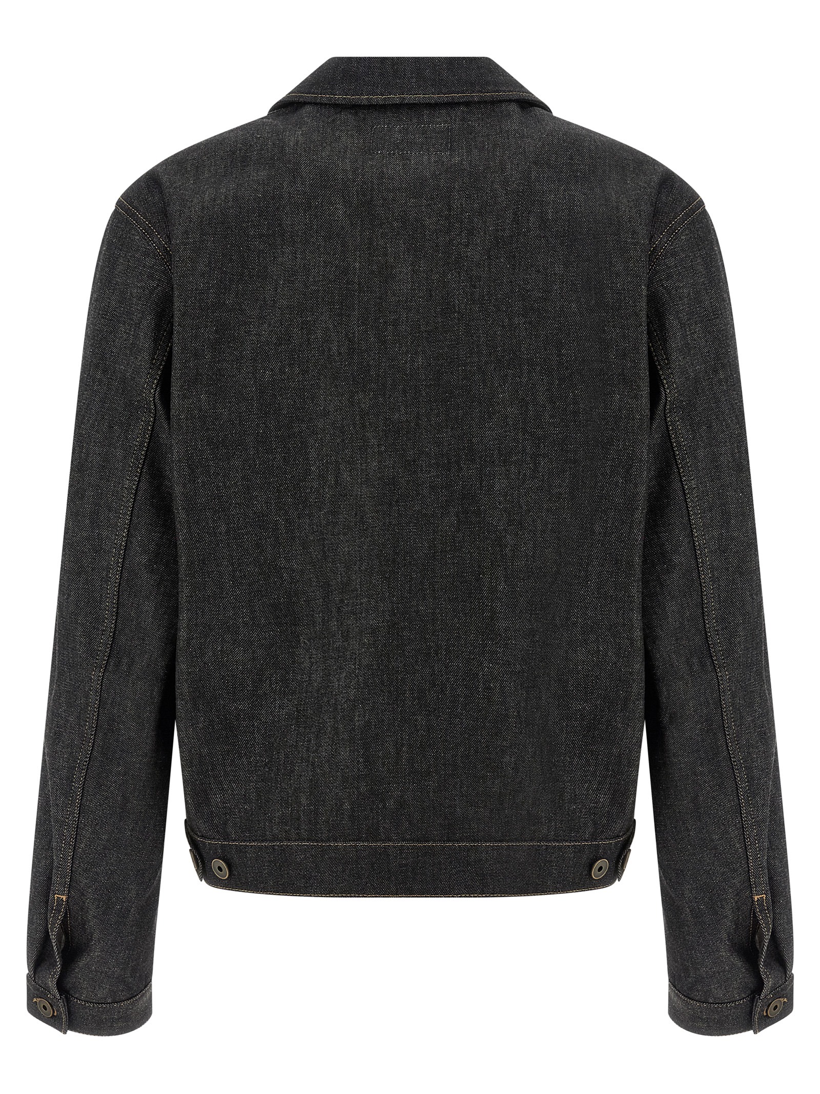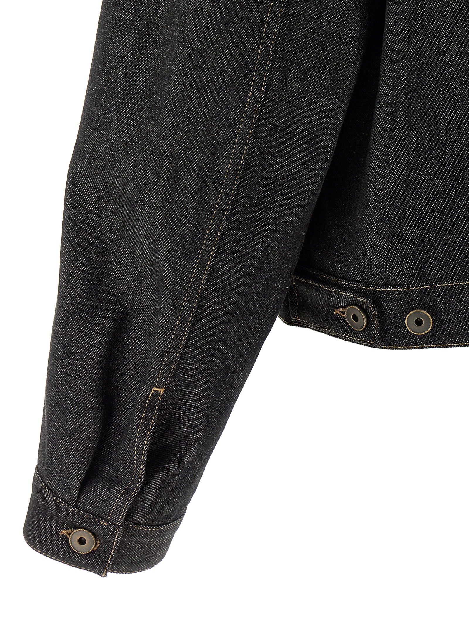 ‘Trucker’ denim jacket often yarn-dyed with a raw hand, contrast stitching, shirt collar, front button closure, pockets, long sleeves with cuffs and dropped shoulder, unlined.
