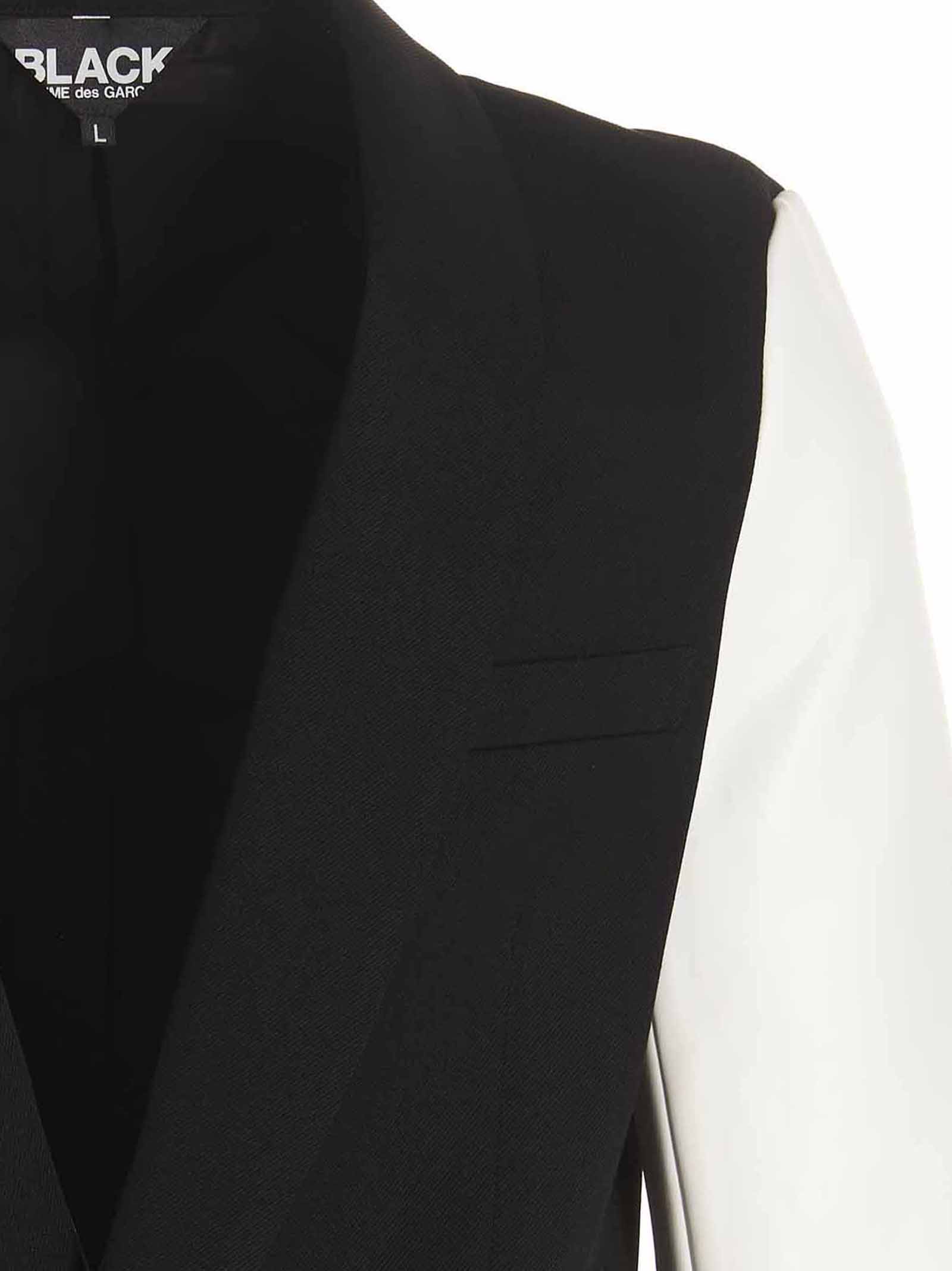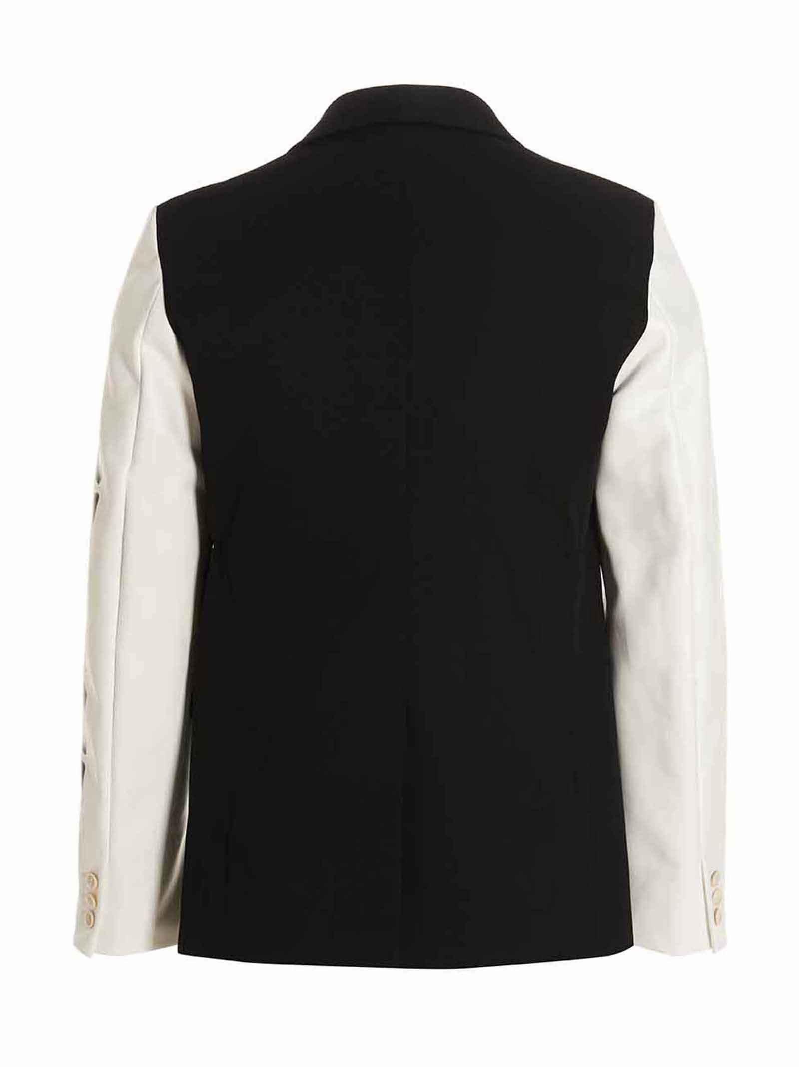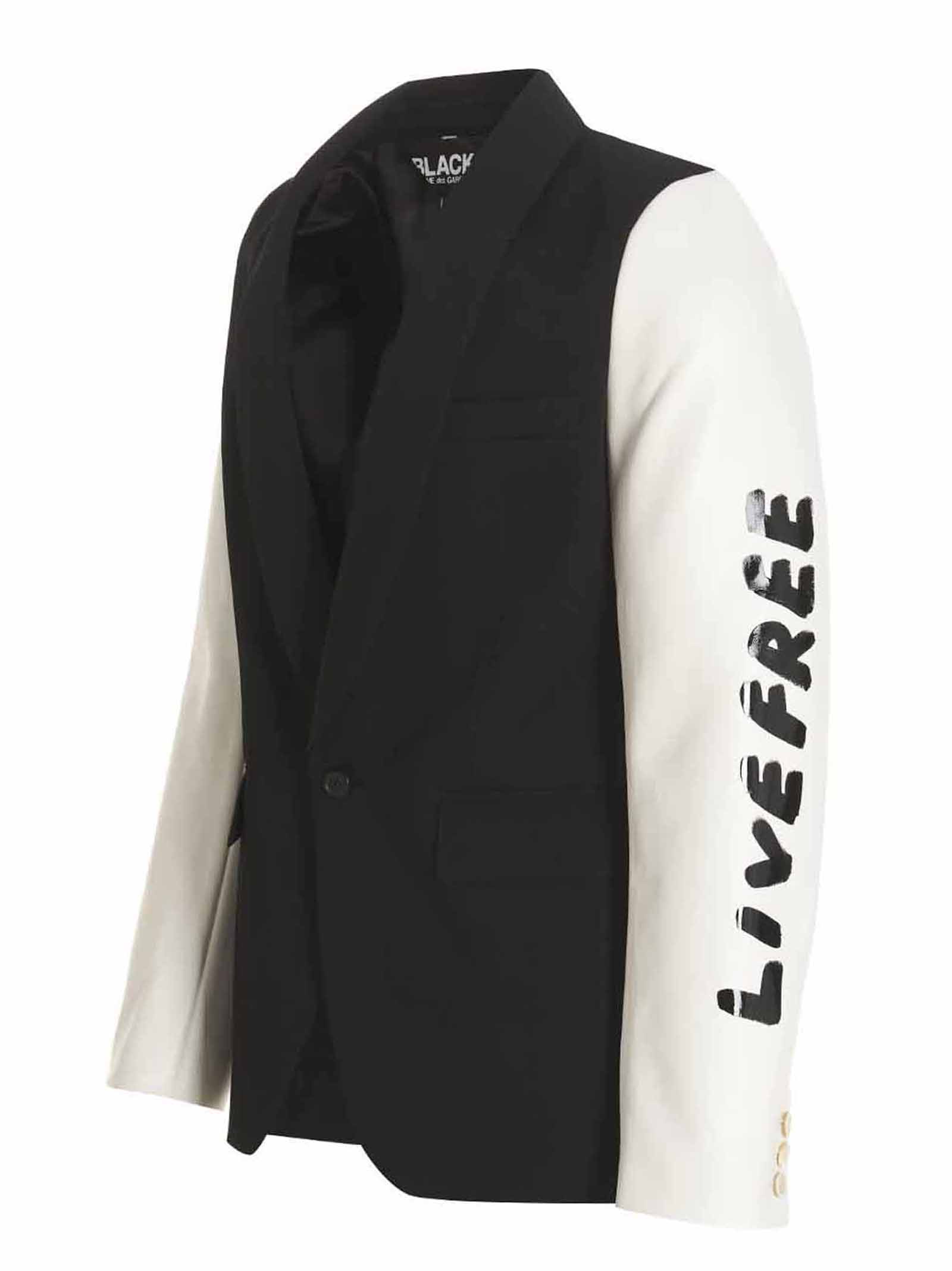 True heart strong mind’ two-material blazer jacket with printed eco leather sleeves and a single breast style.